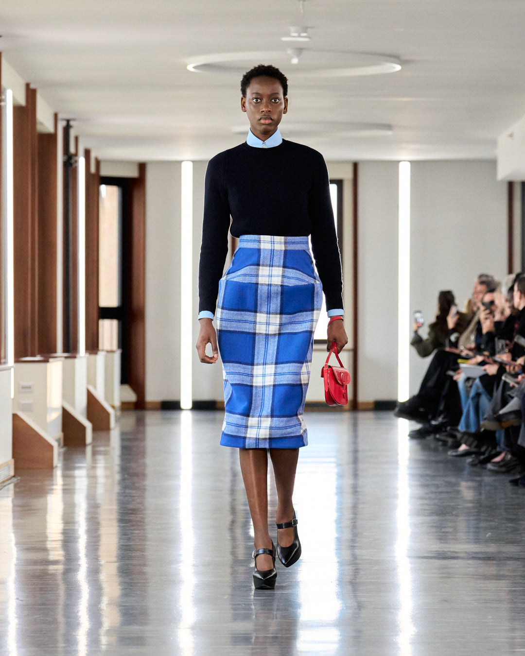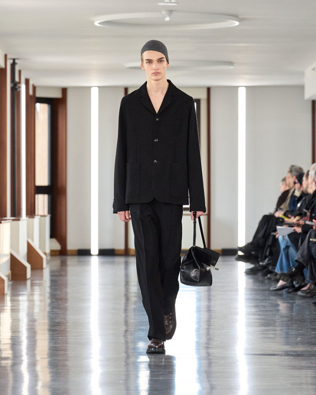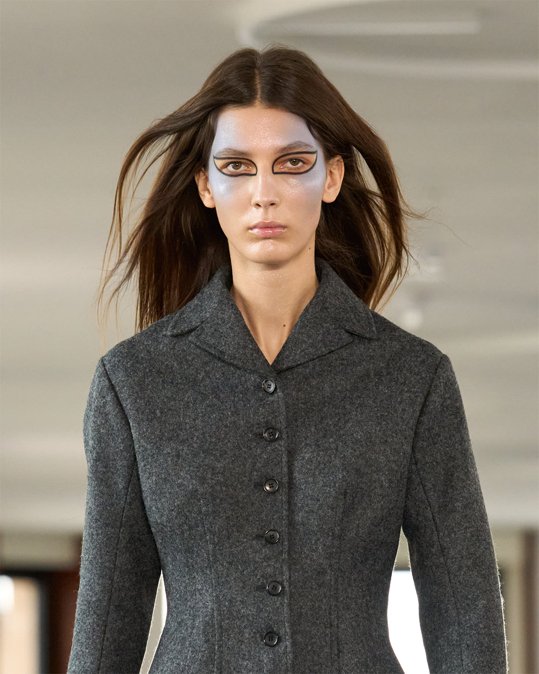 Set amidst the iconic heights of Torre Velasca in Milan, the Fall/Winter 2025 fashion show offered continuing themes of Swiss precision and formality, disrupted by wild elements such as texture and materiality, resulting in a striking contrast.