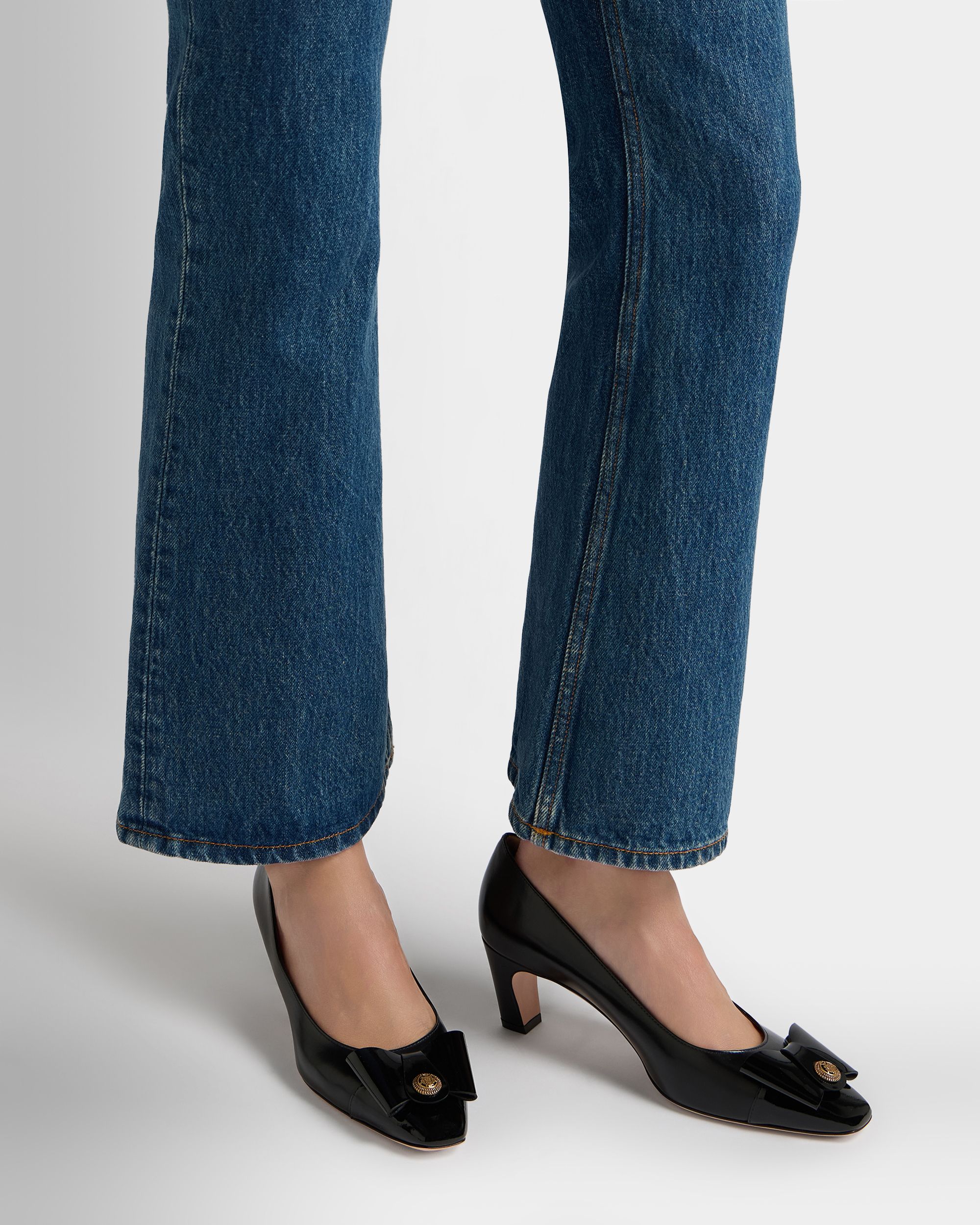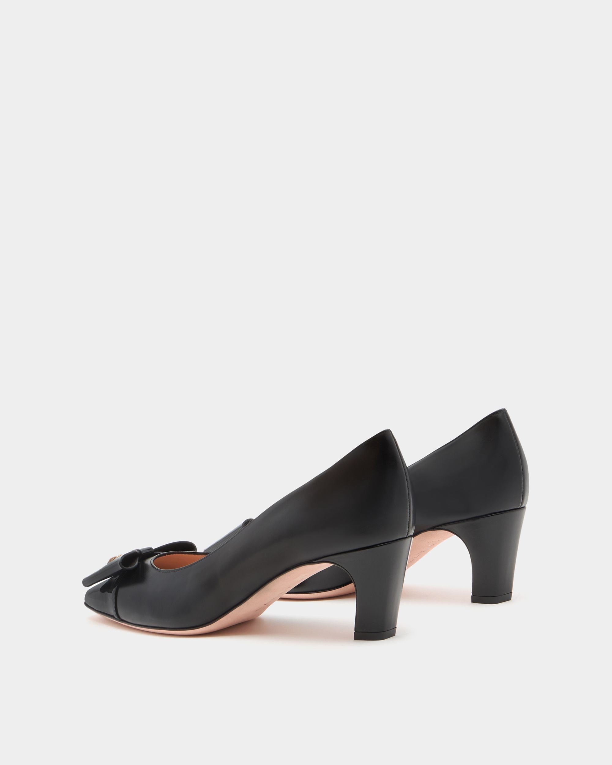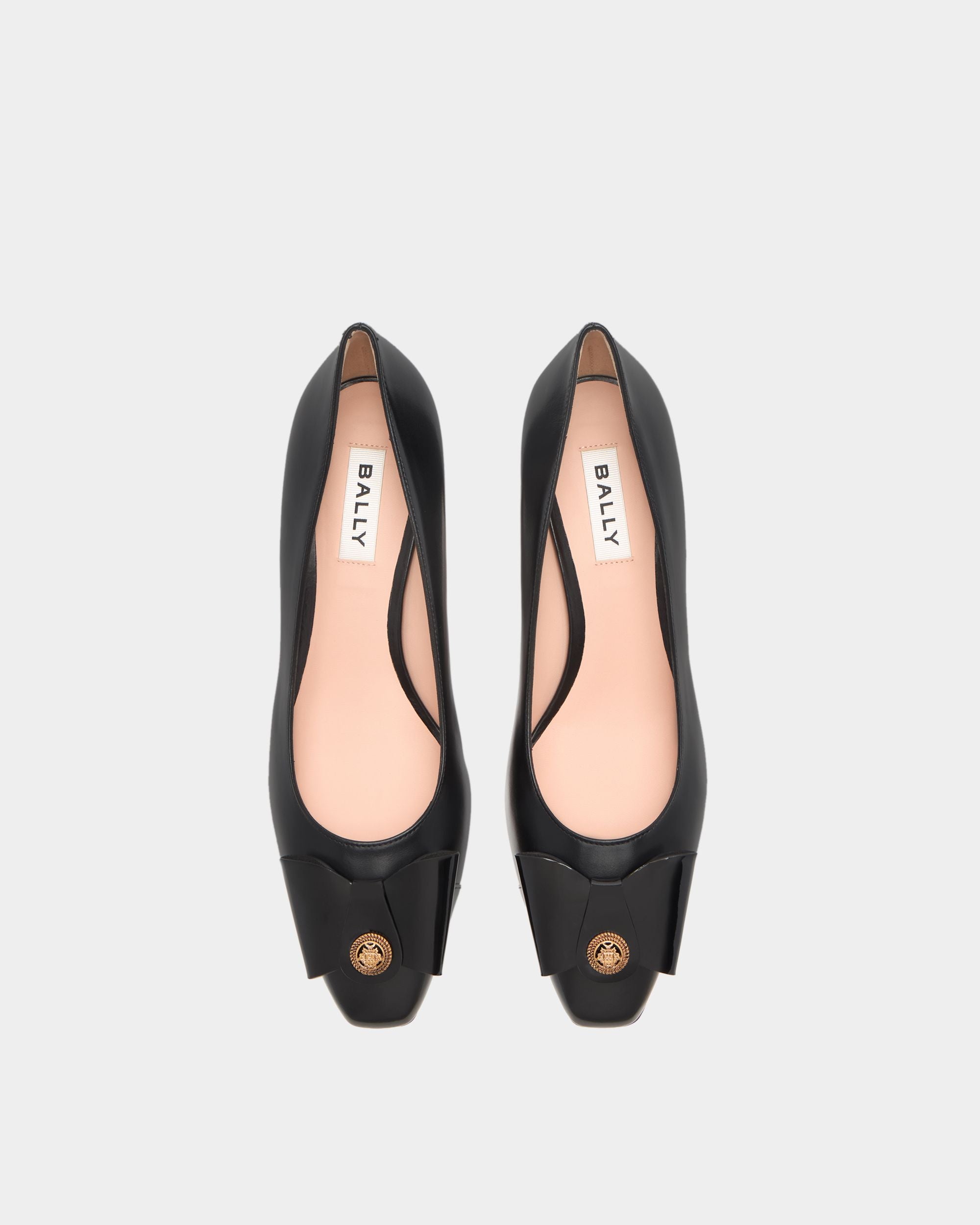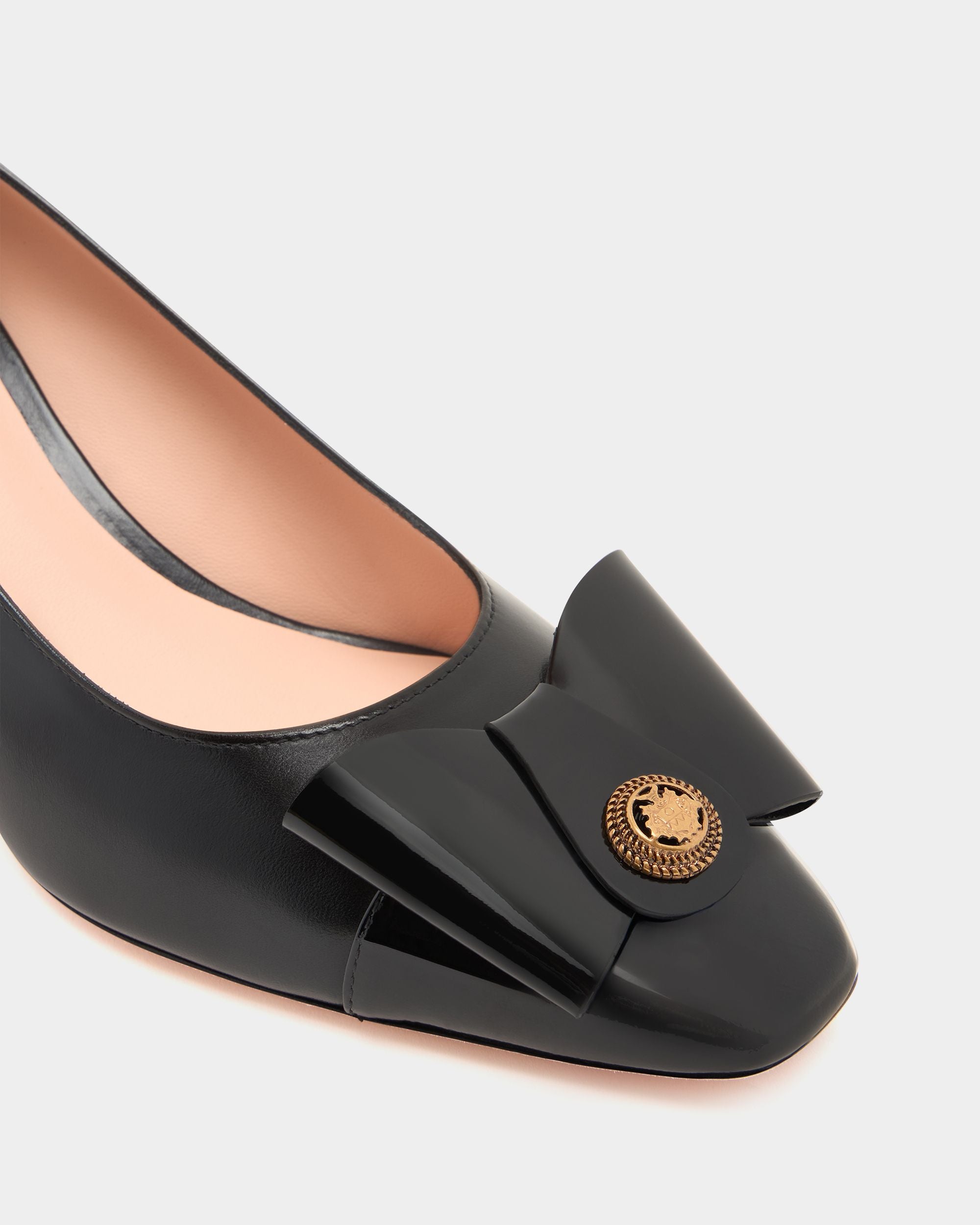 The sophisticated all-black silhouette of this leather pump is finished with an iconic bow from the Bally archives, refreshed with a Crest signifier at the center.