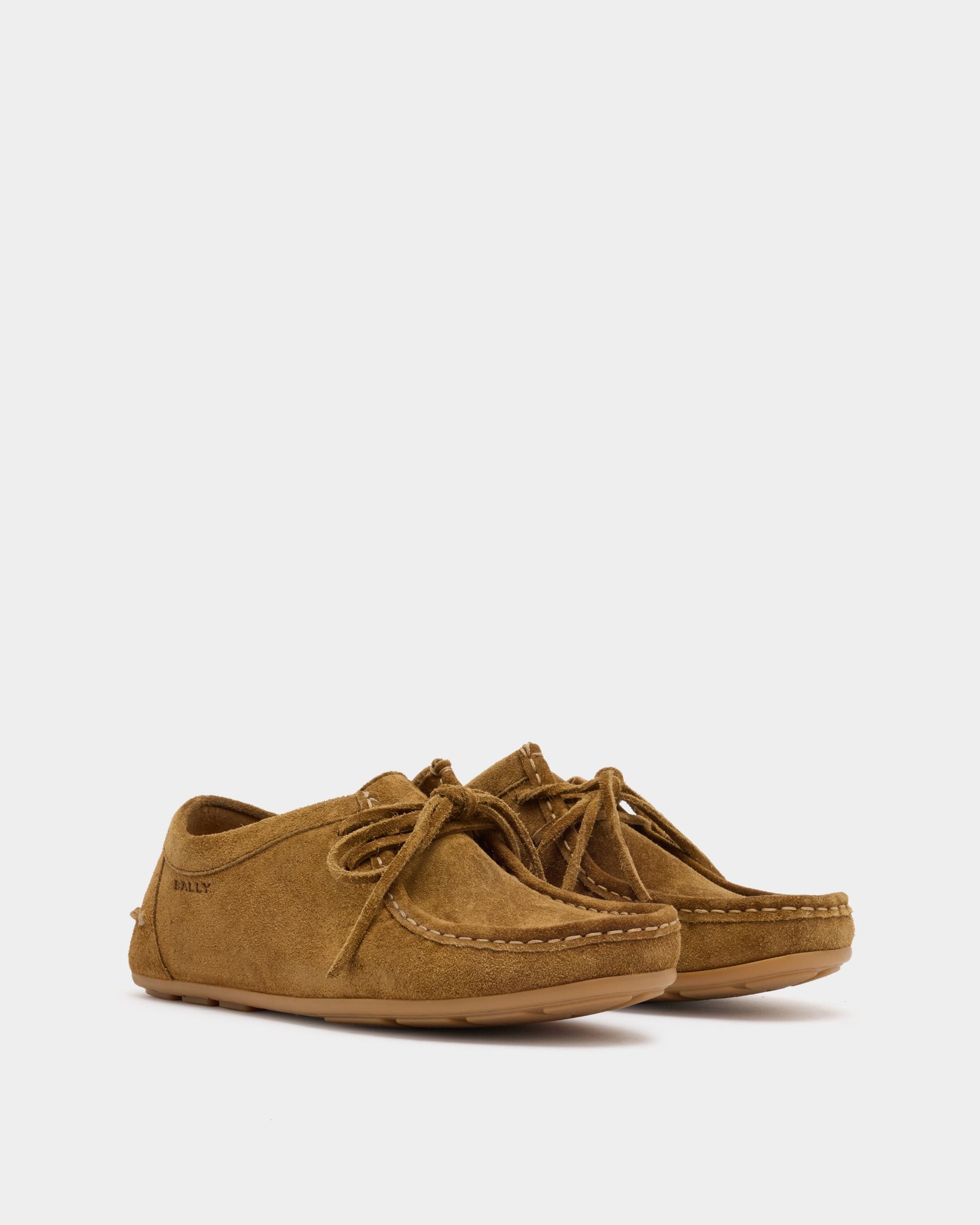 This Clay driver unites the comfort and lightness of a moccasin with the versatility of a driving sole. The brown suede upper is characterized by top stitching, a debossed Bally logo and matching suede laces.