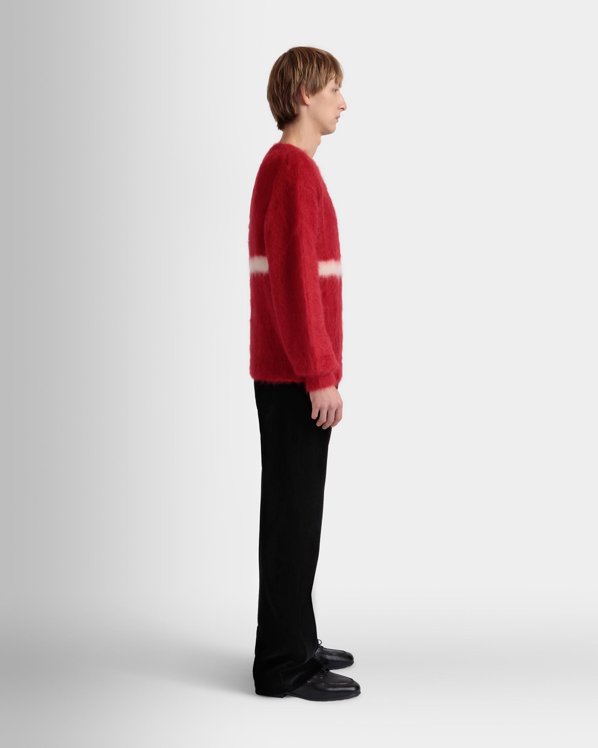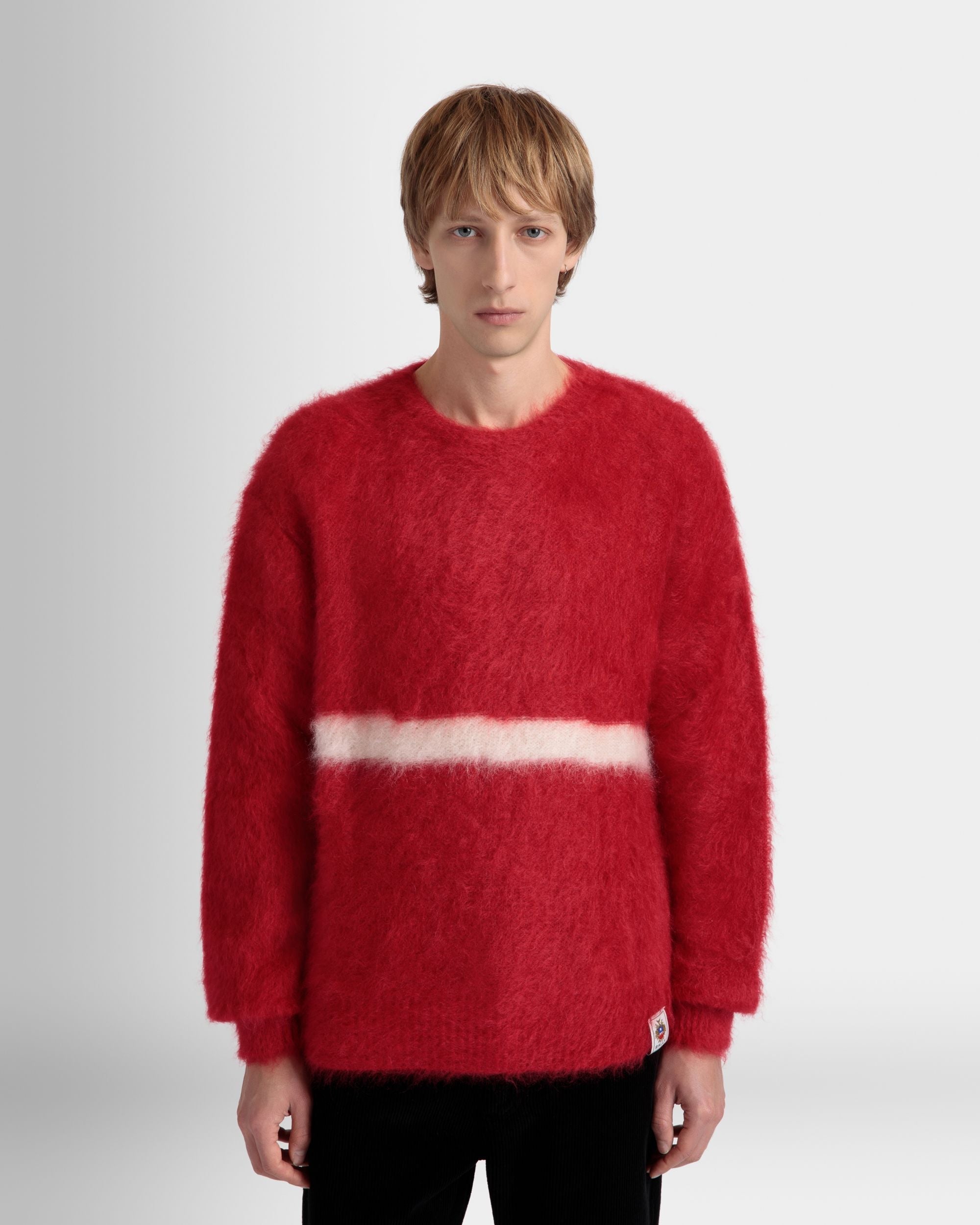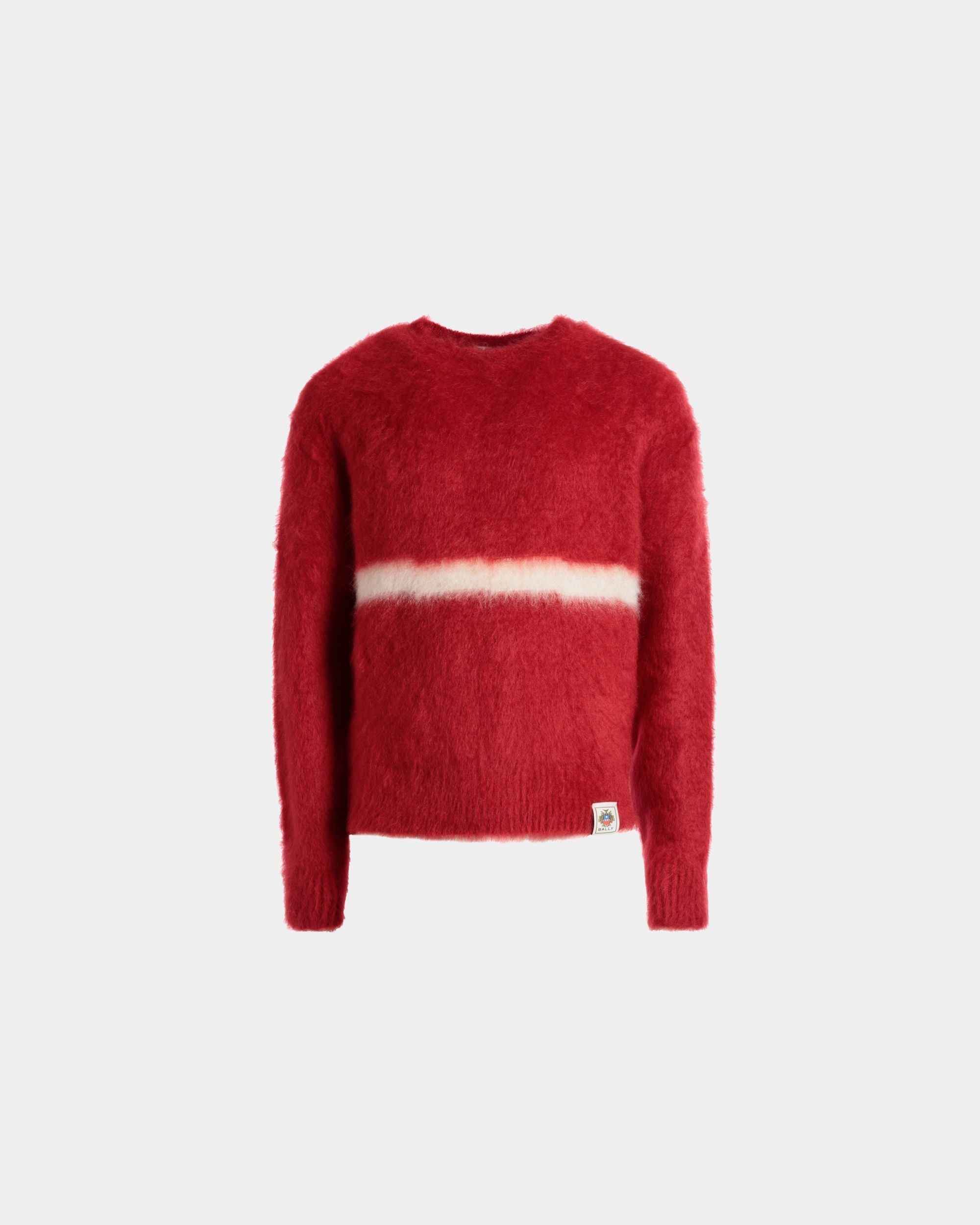 This long-sleeve pullover sweater unites the soft handle of brushed mohair with a vibrant red hue, crossed by a stripe in white. A Bally Crest label adorns the left hemline.