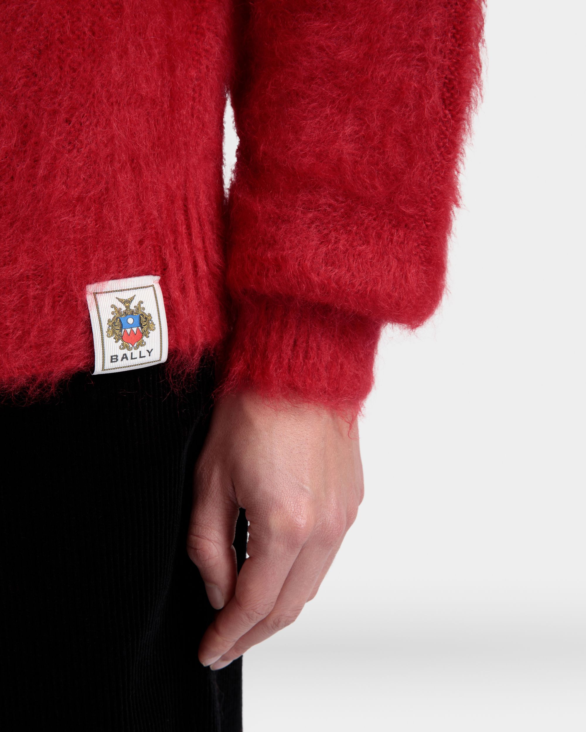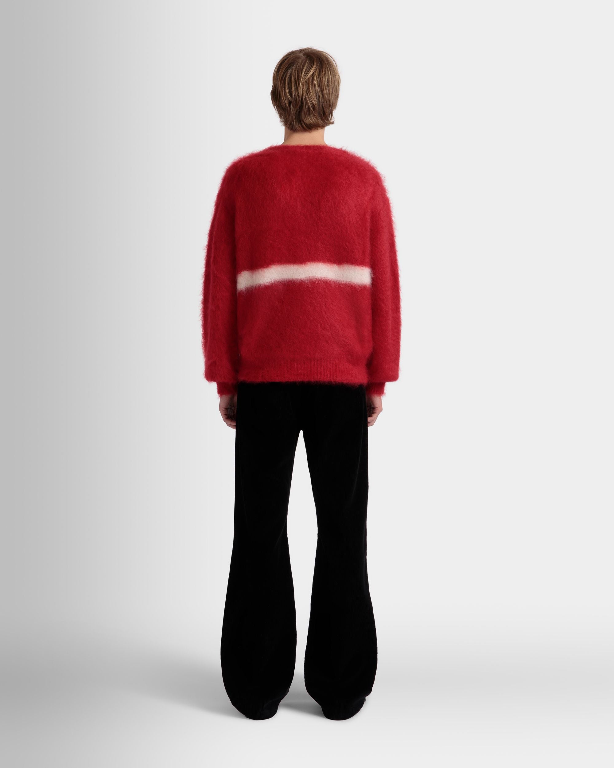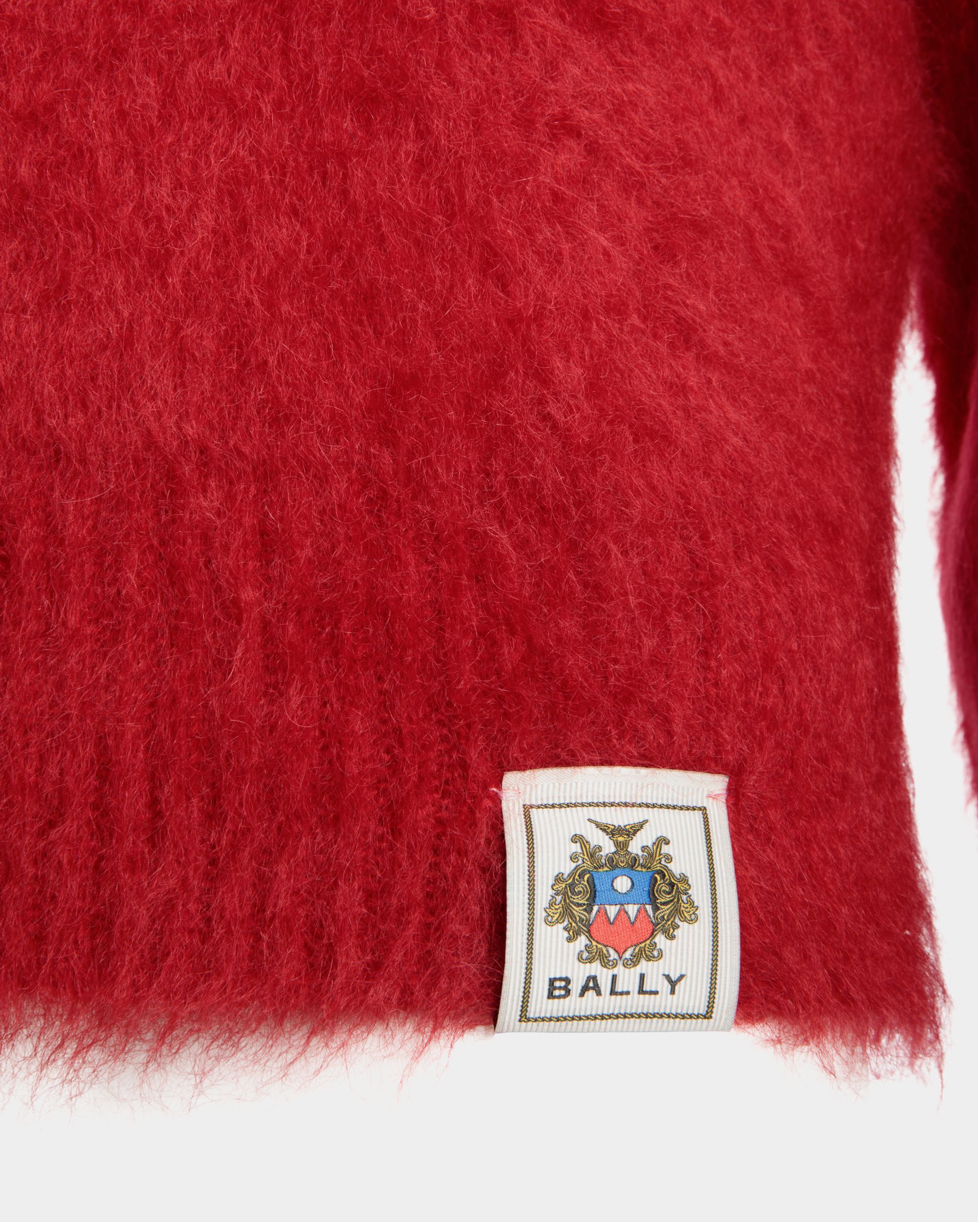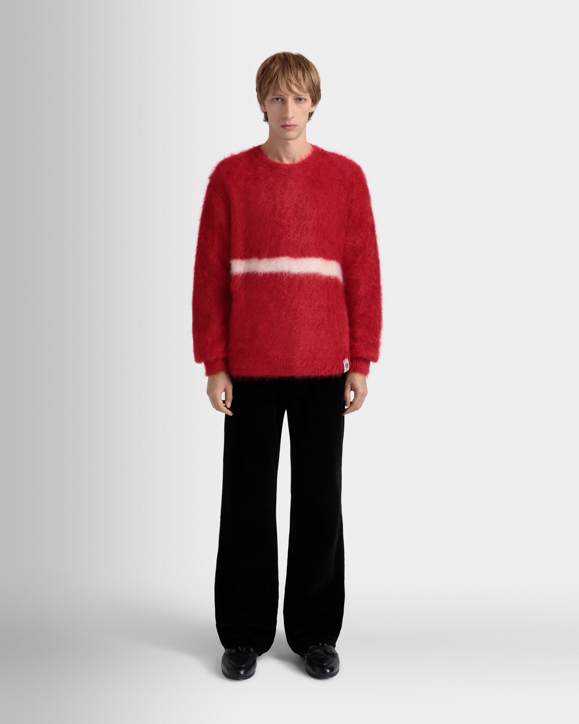 This long-sleeve pullover sweater unites the soft handle of brushed mohair with a vibrant red hue, crossed by a stripe in white. A Bally Crest label adorns the left hemline.