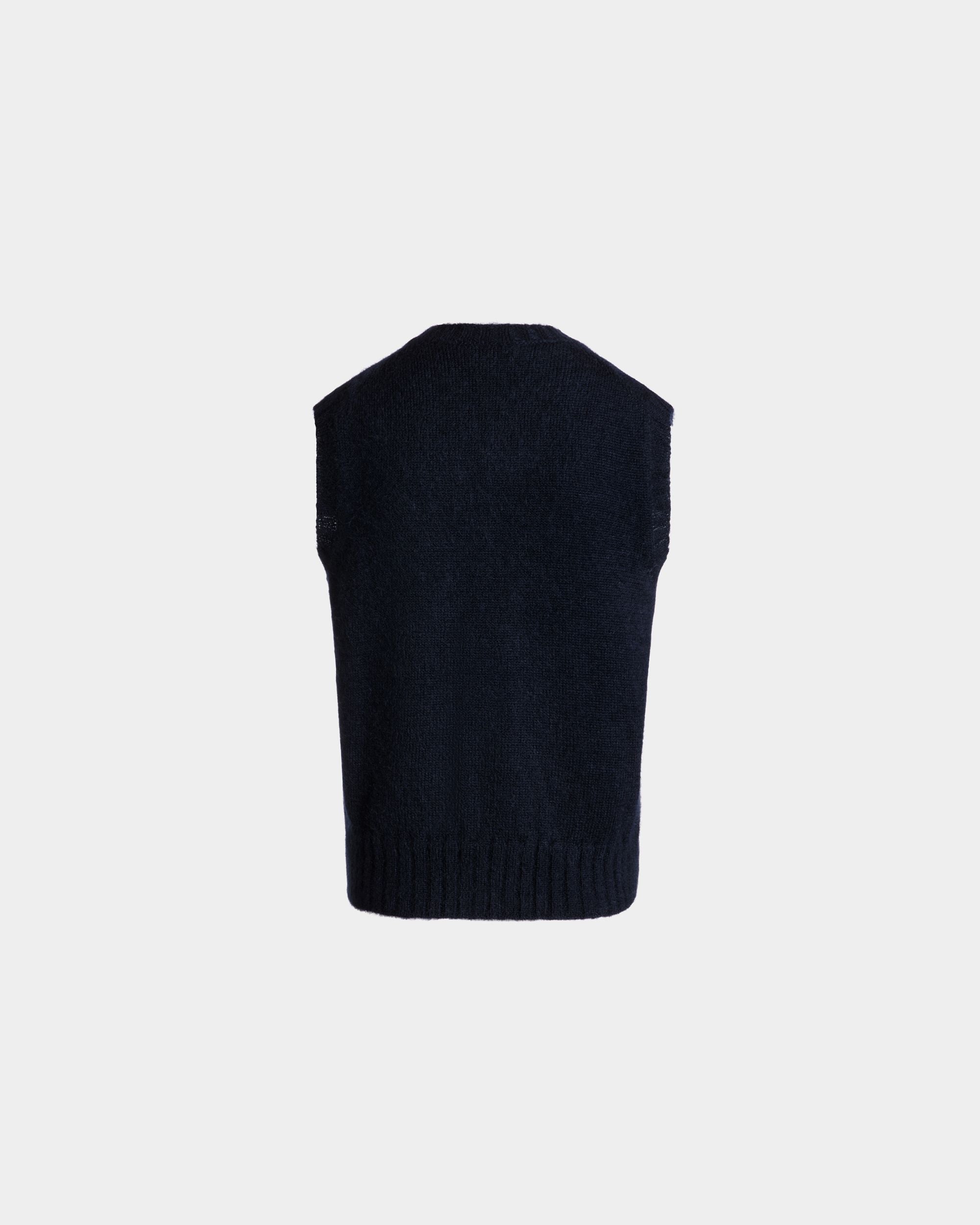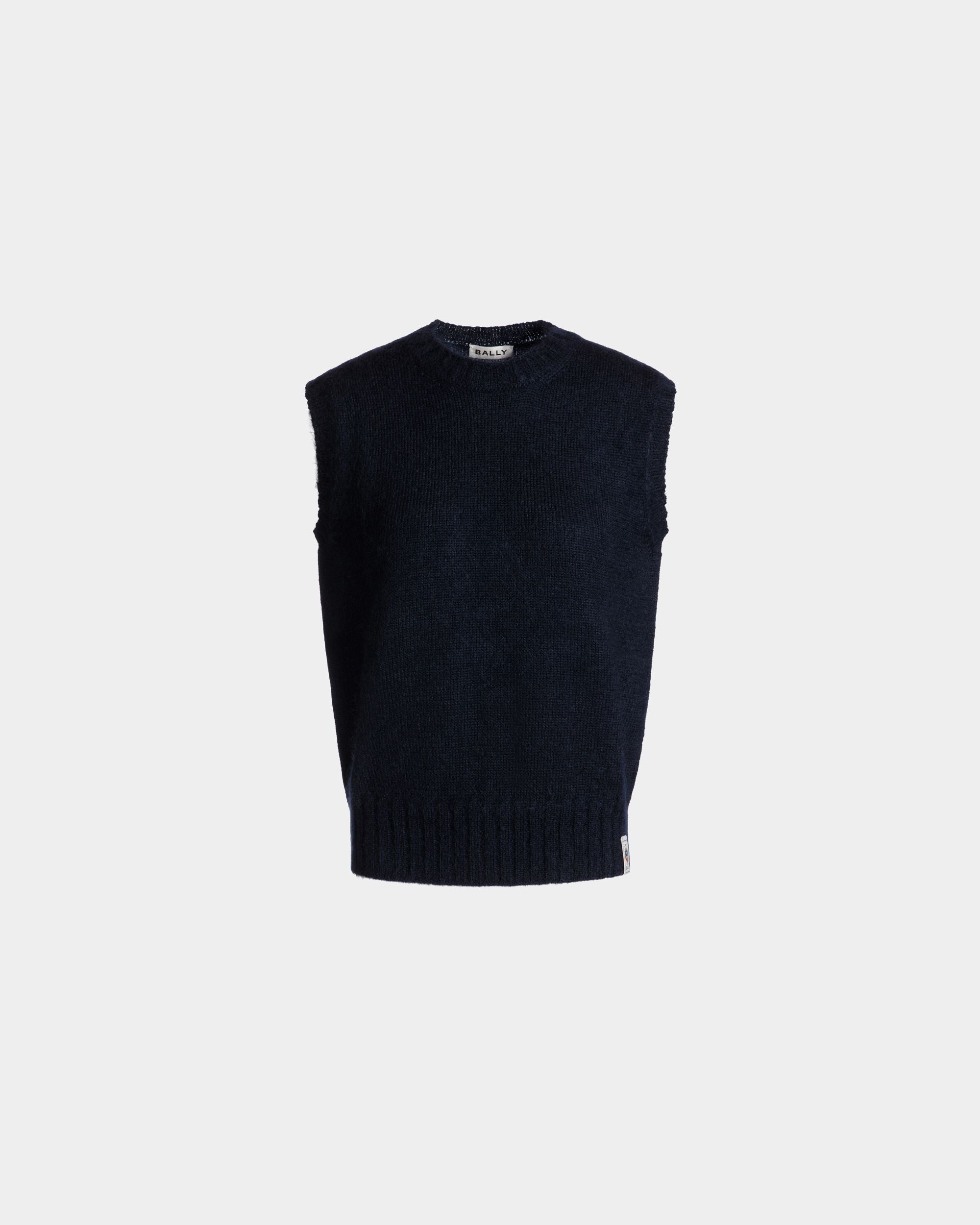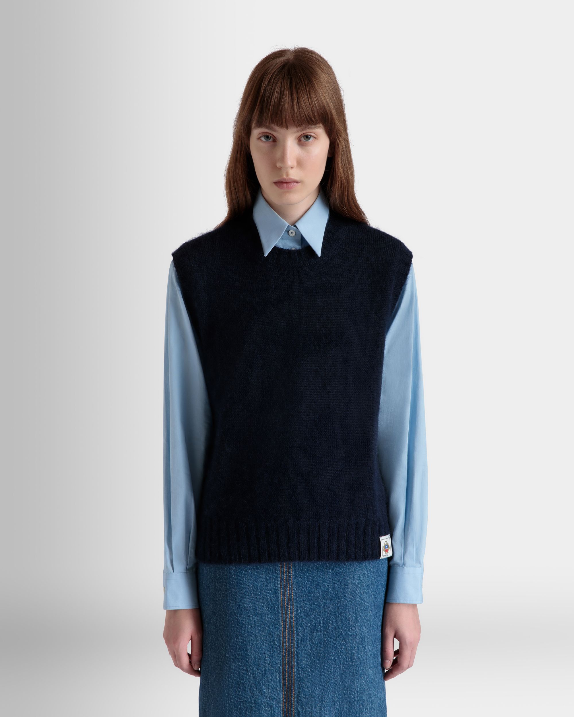 Essential and versatile, this blue crew neck vest is knit from mohair and silk yarn. A Bally Crest label enriches the wide-rib lower hemline.