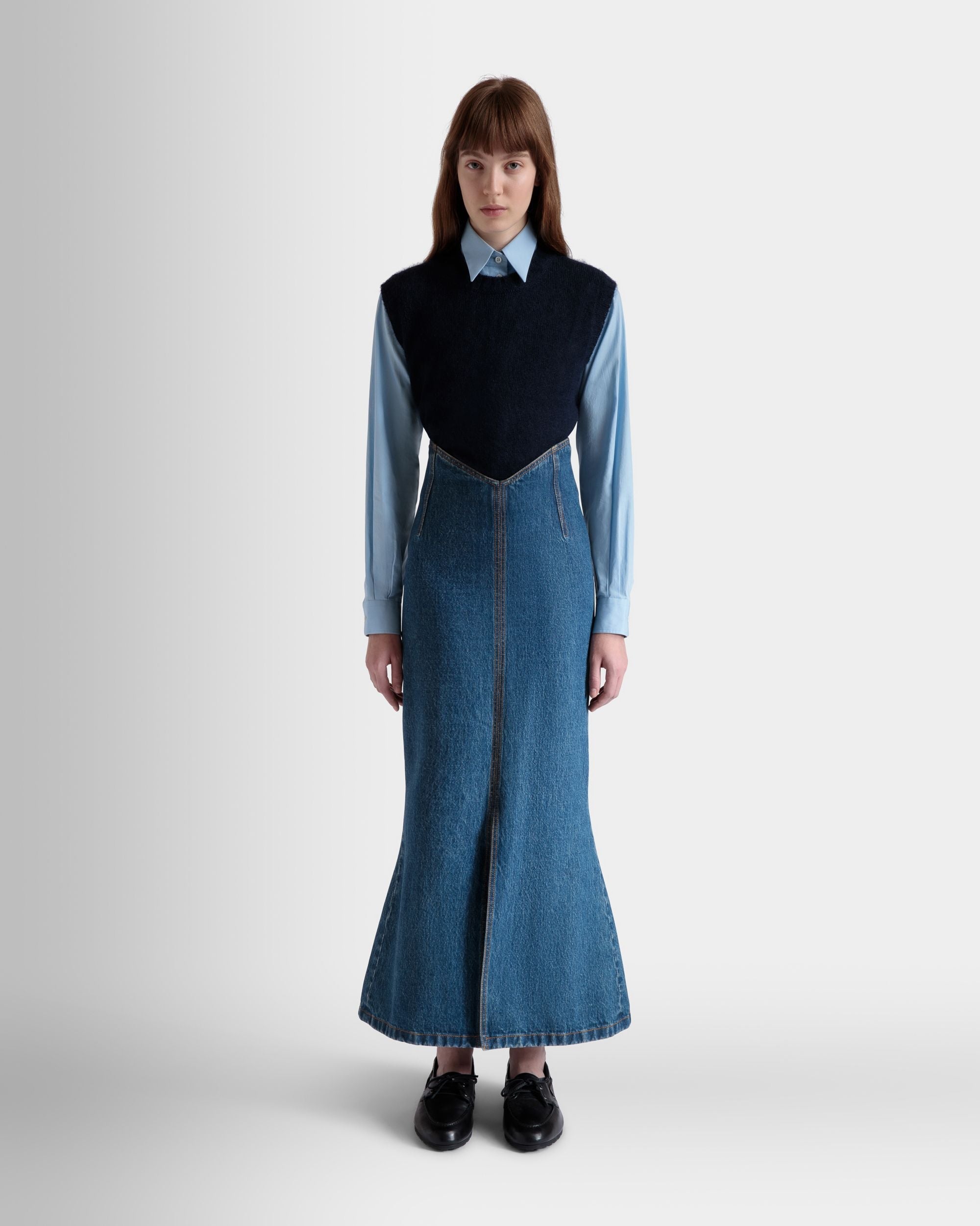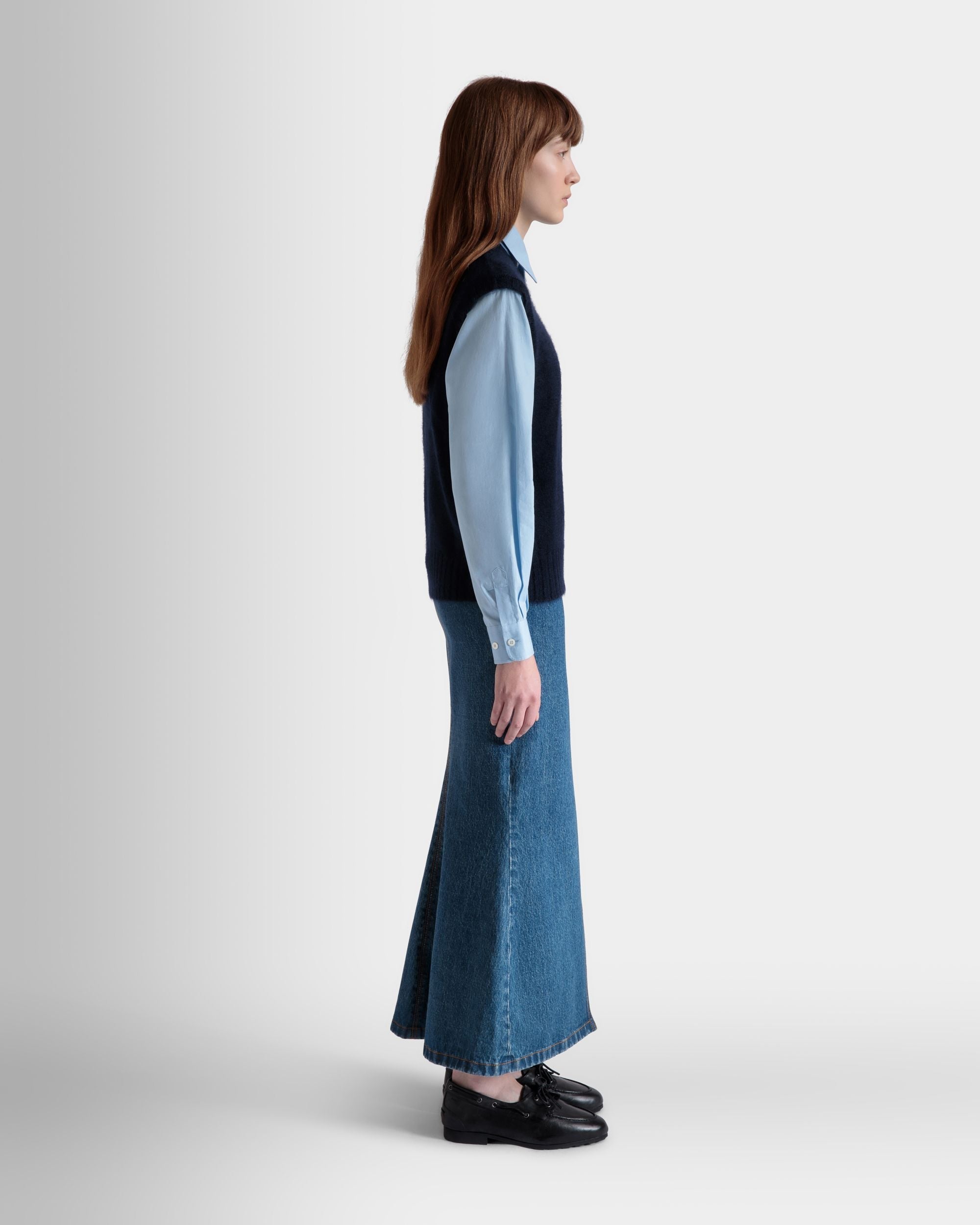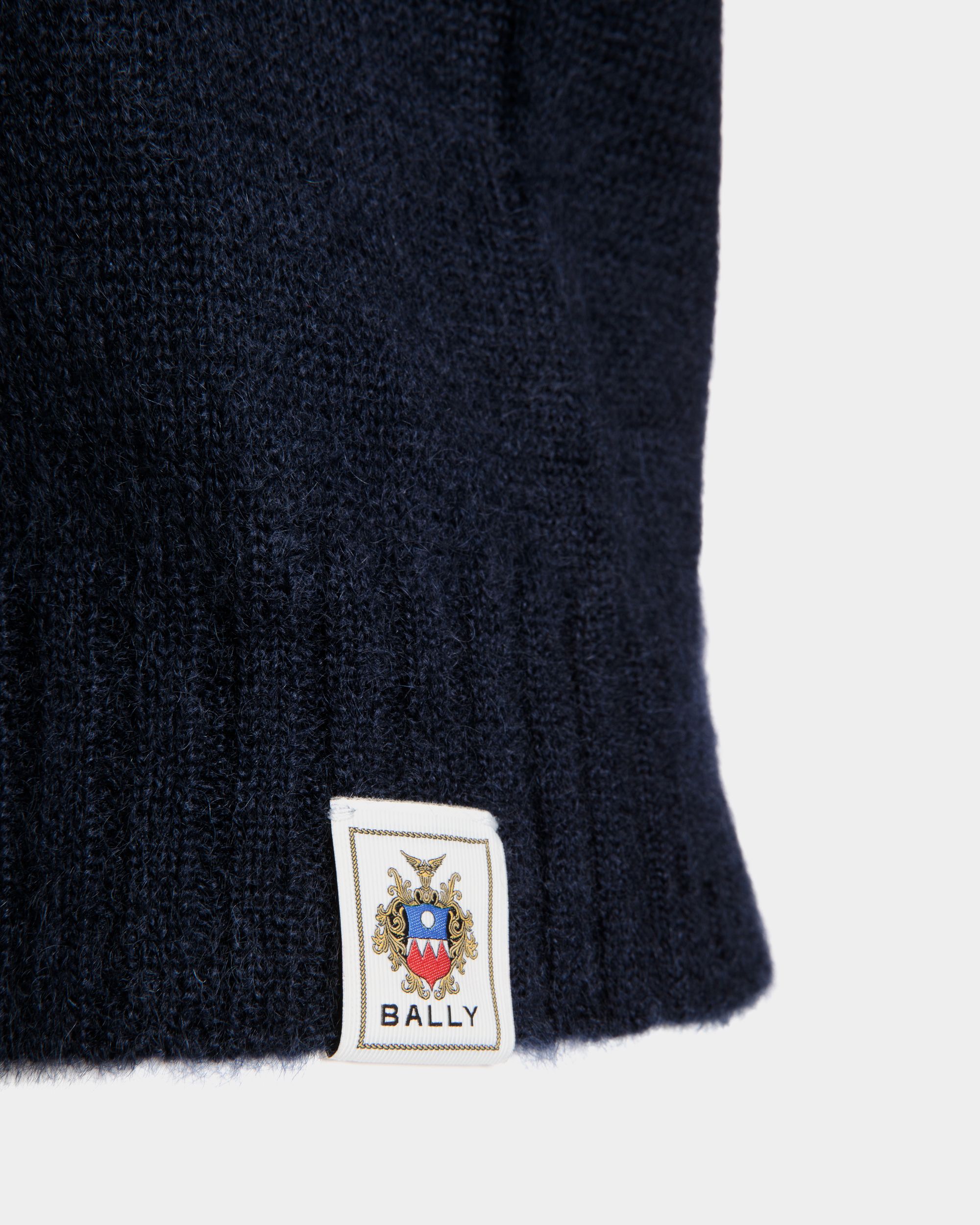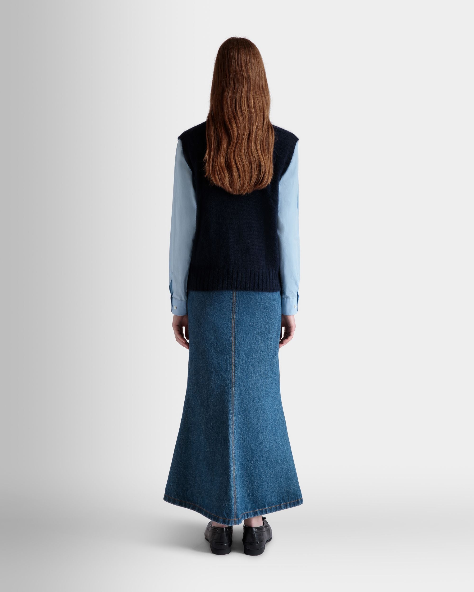 Essential and versatile, this blue crew neck vest is knit from mohair and silk yarn. A Bally Crest label enriches the wide-rib lower hemline.