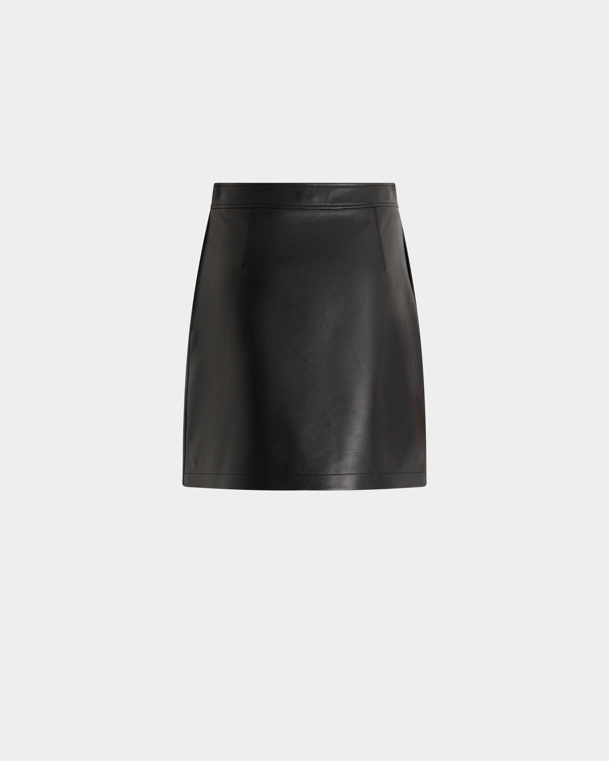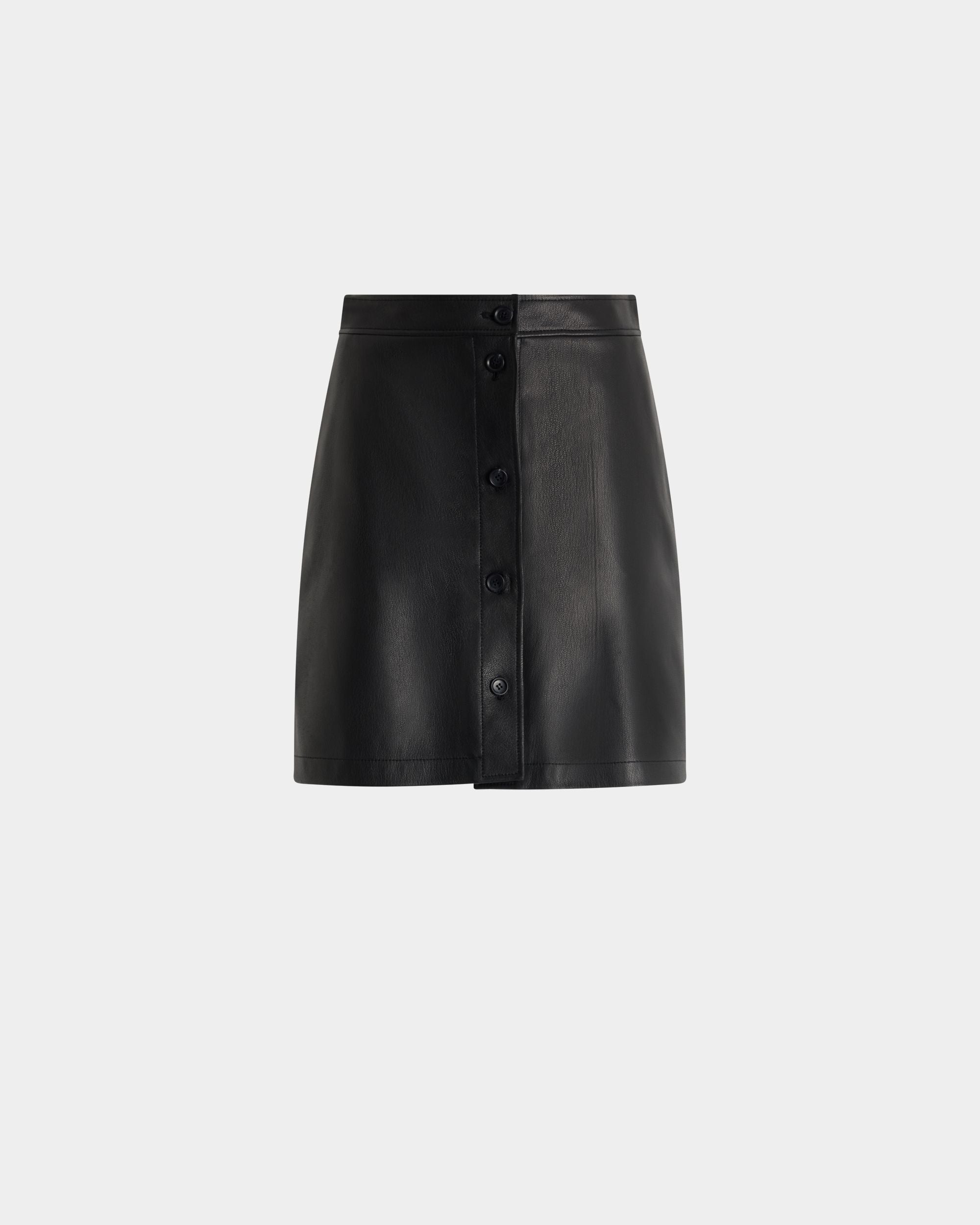 This black leather mini skirt is decorated by round horn-effect buttons to the front.