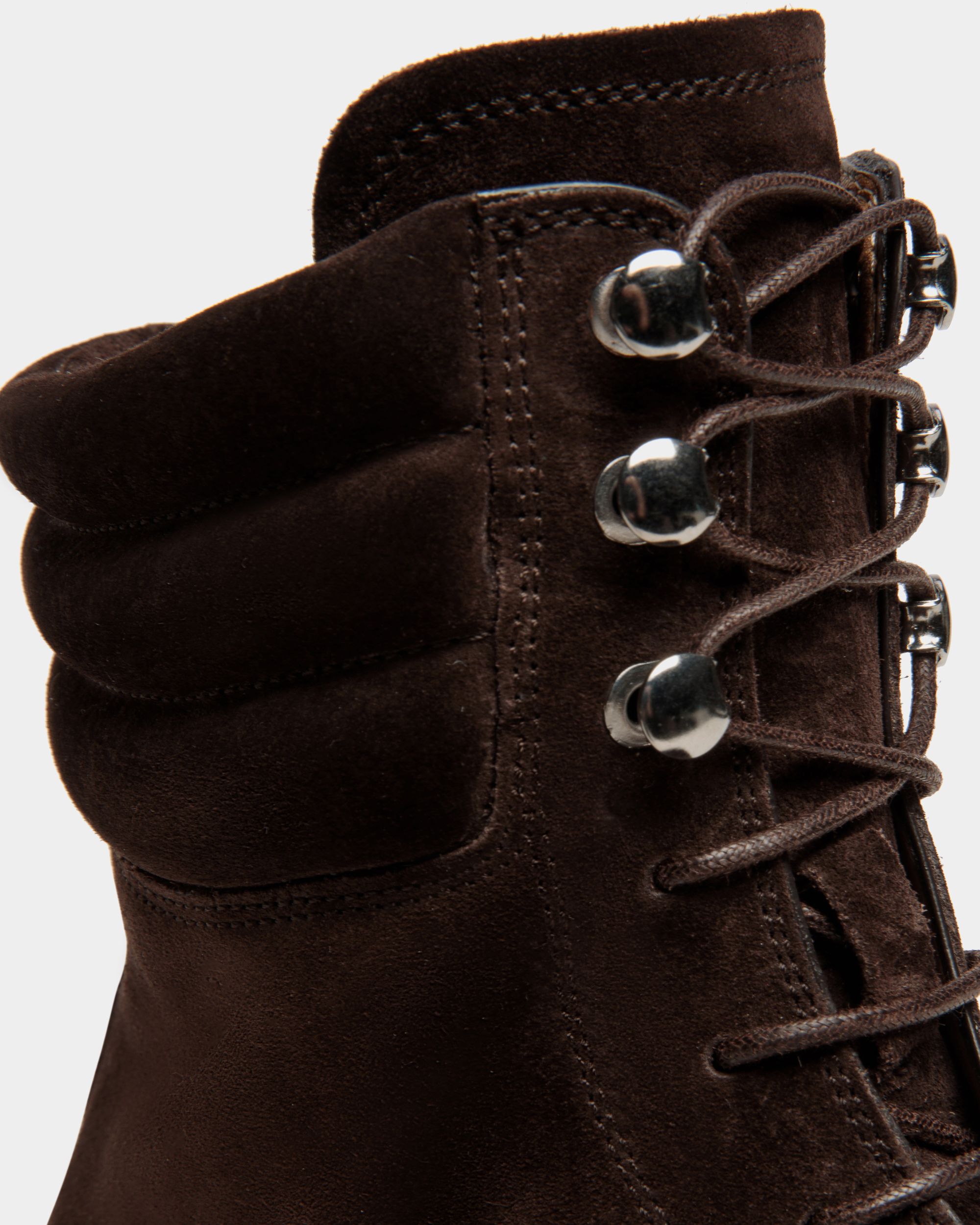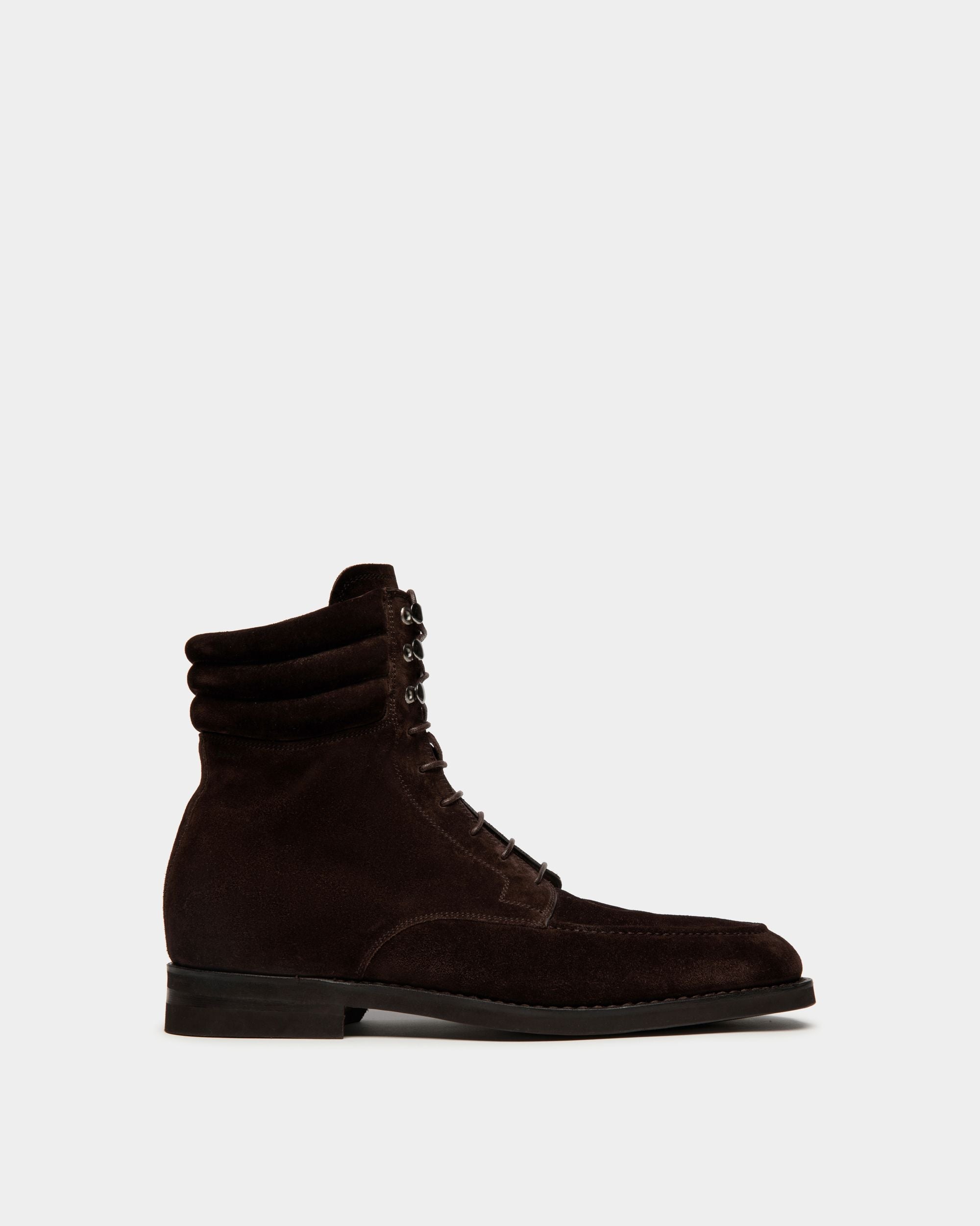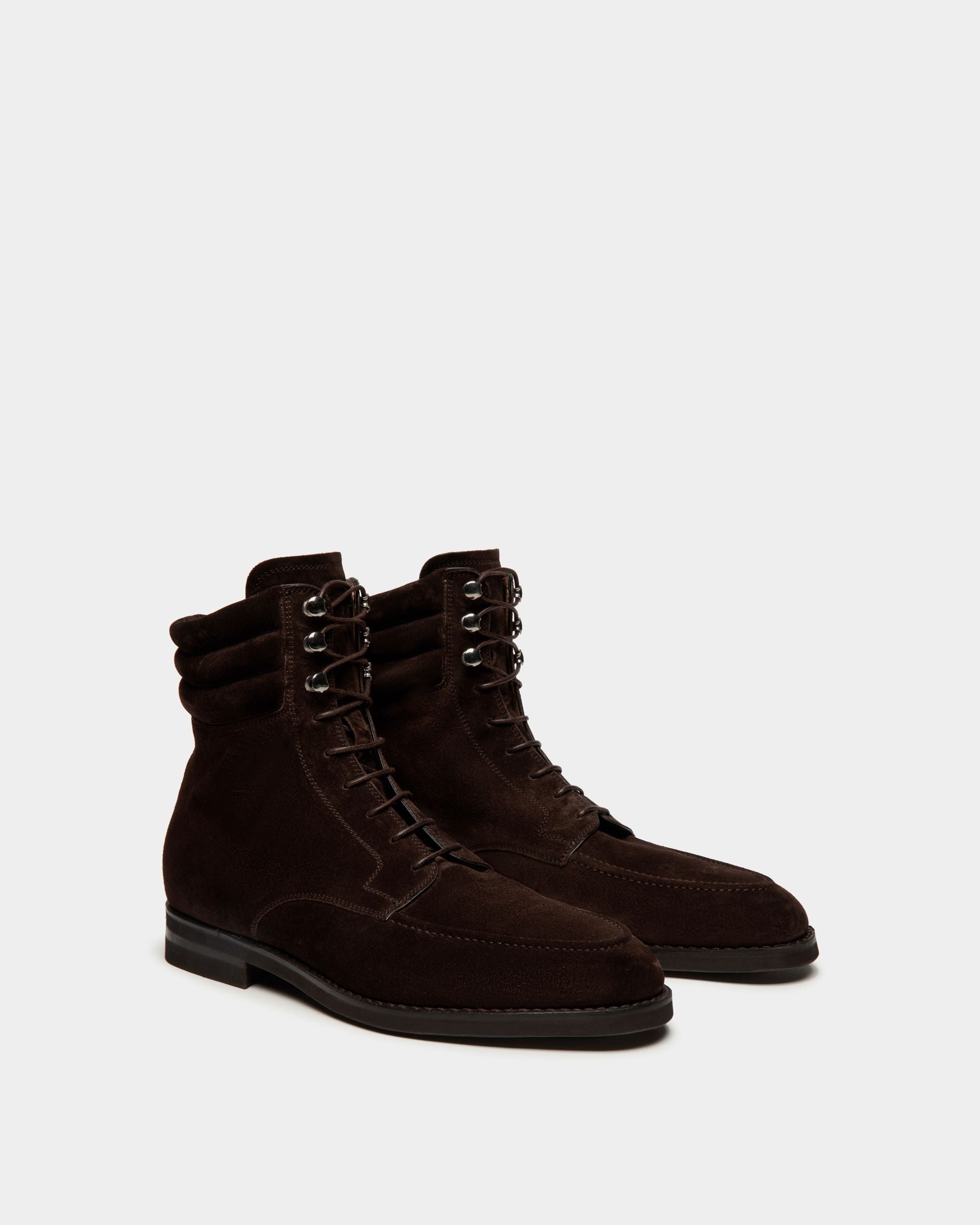 A contemporary expression of Swiss heritage, this lace-up Schoenen bootie is in supple Ebano suede with stitched details. Padding protects the ankles.