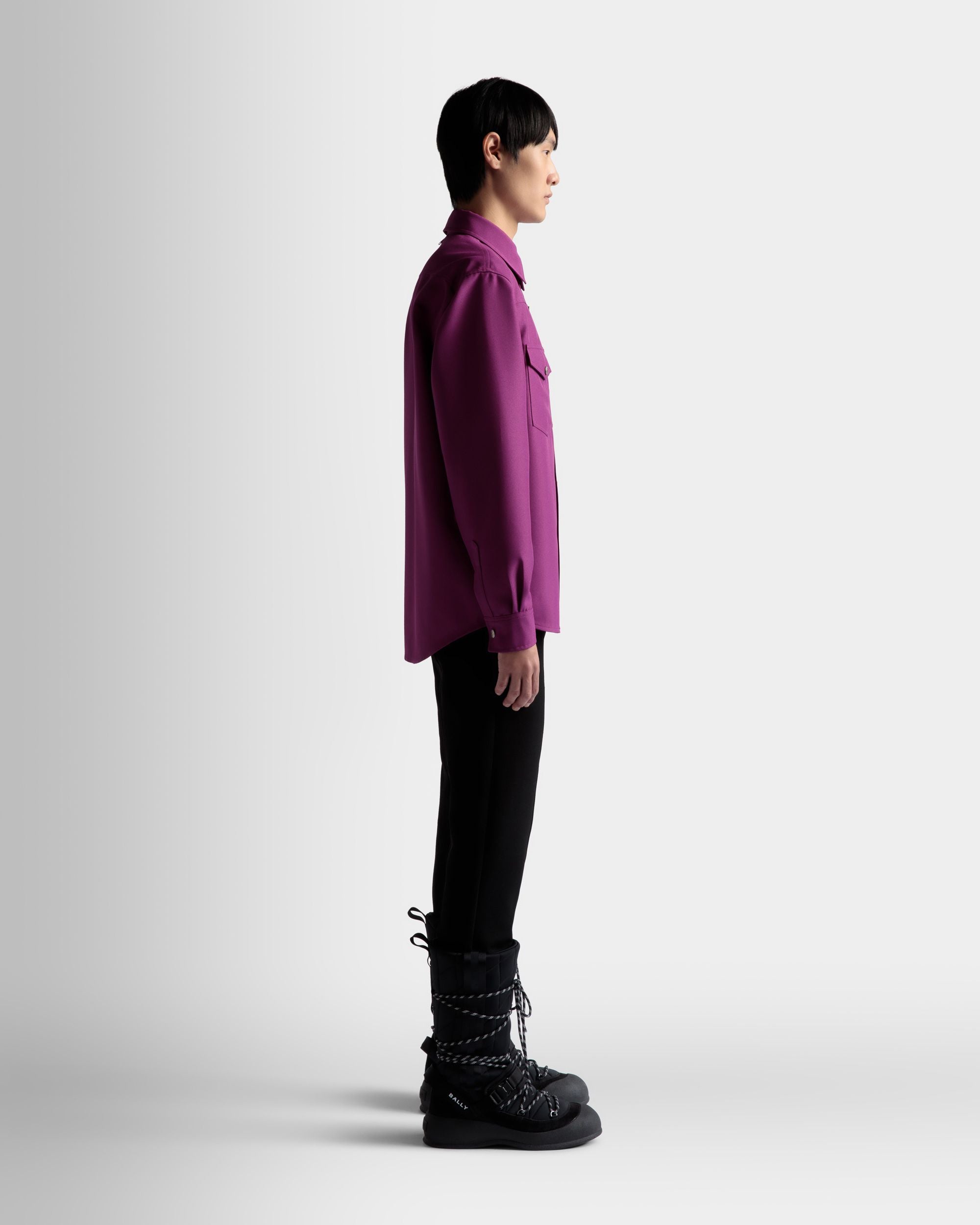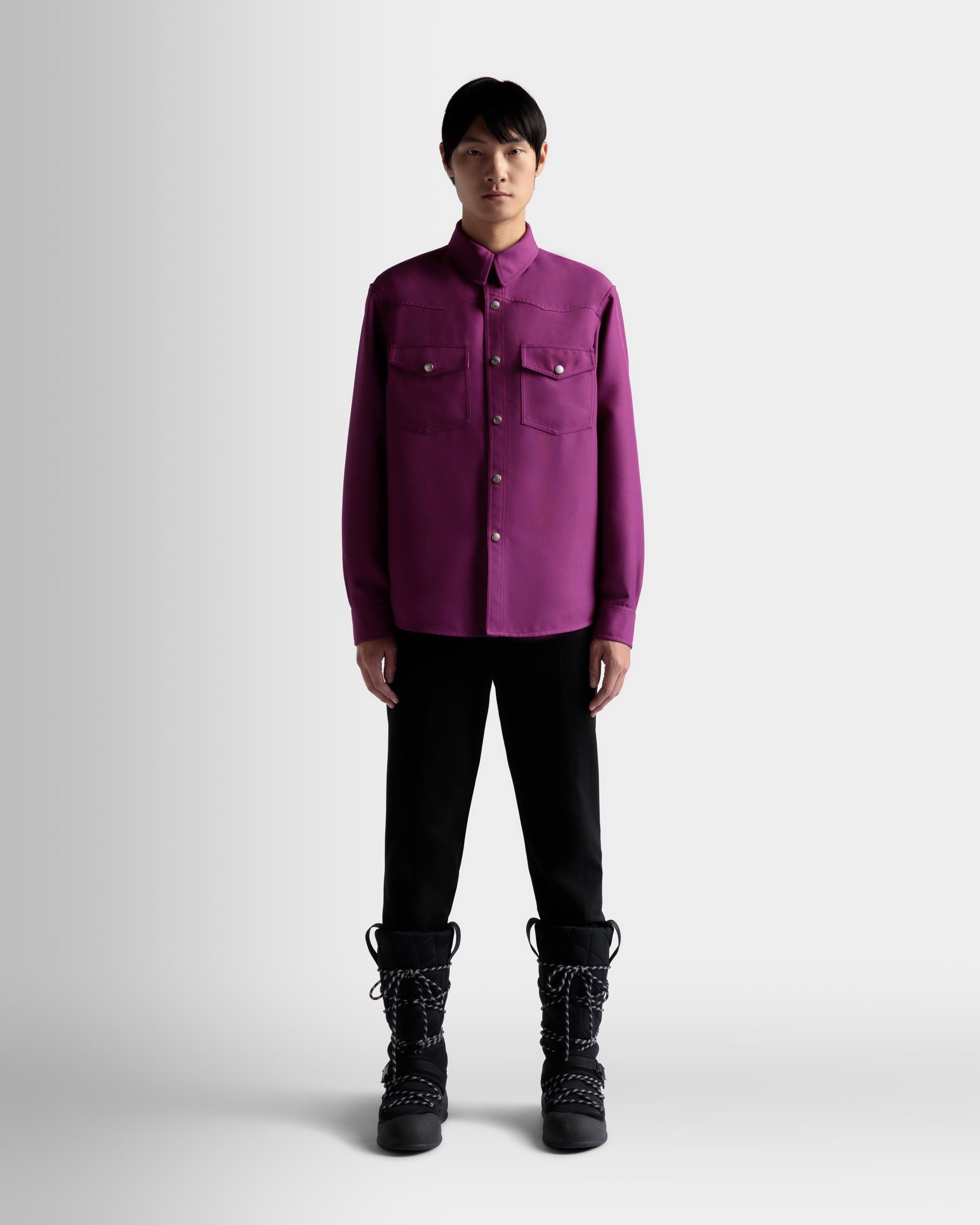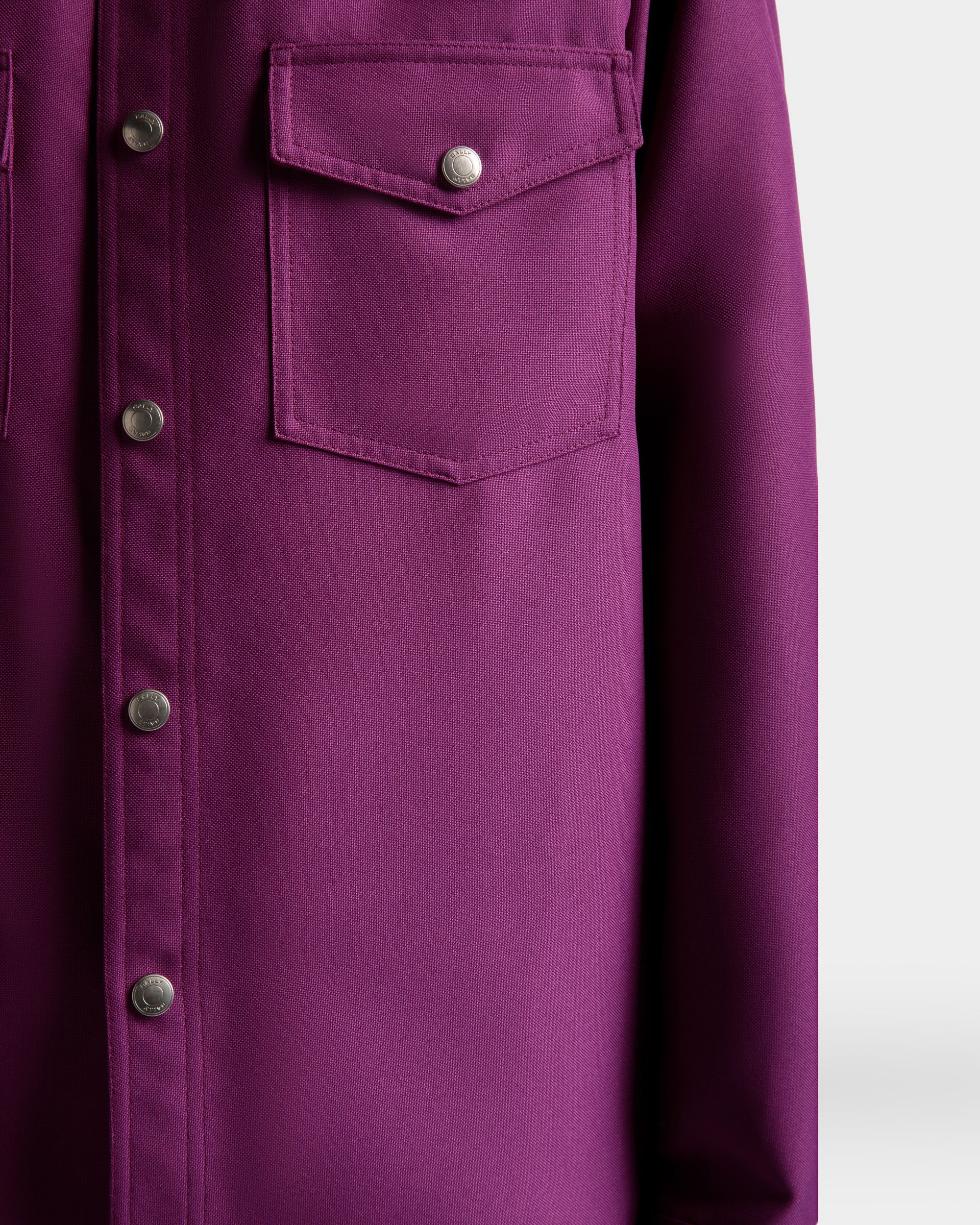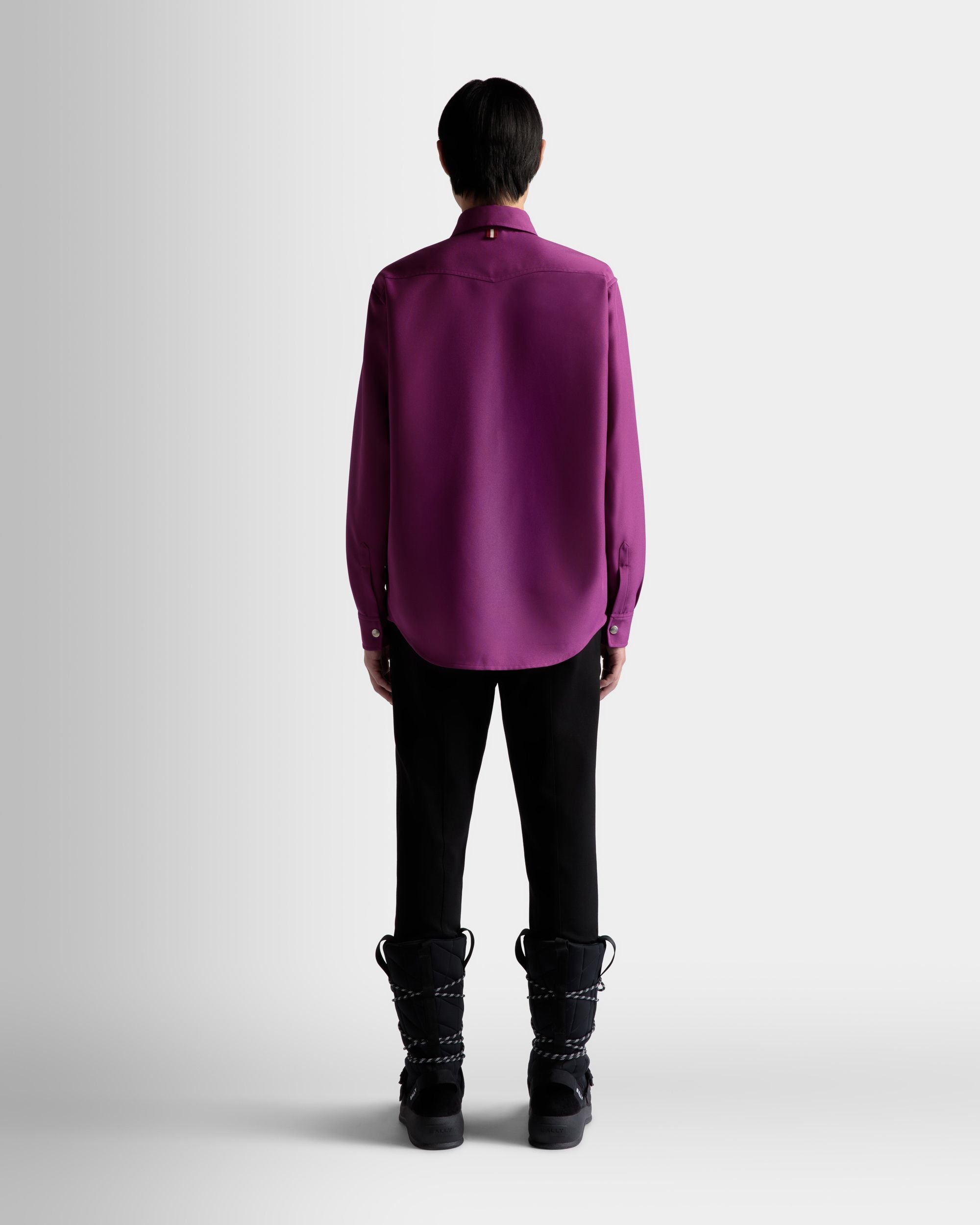 A pop of color brings contemporary character to the 1970s overtones of this button-down shirt in polyester fabric. Bally branded metal snaps fasten the front while a discreet ribbon trims the rear collar stand.