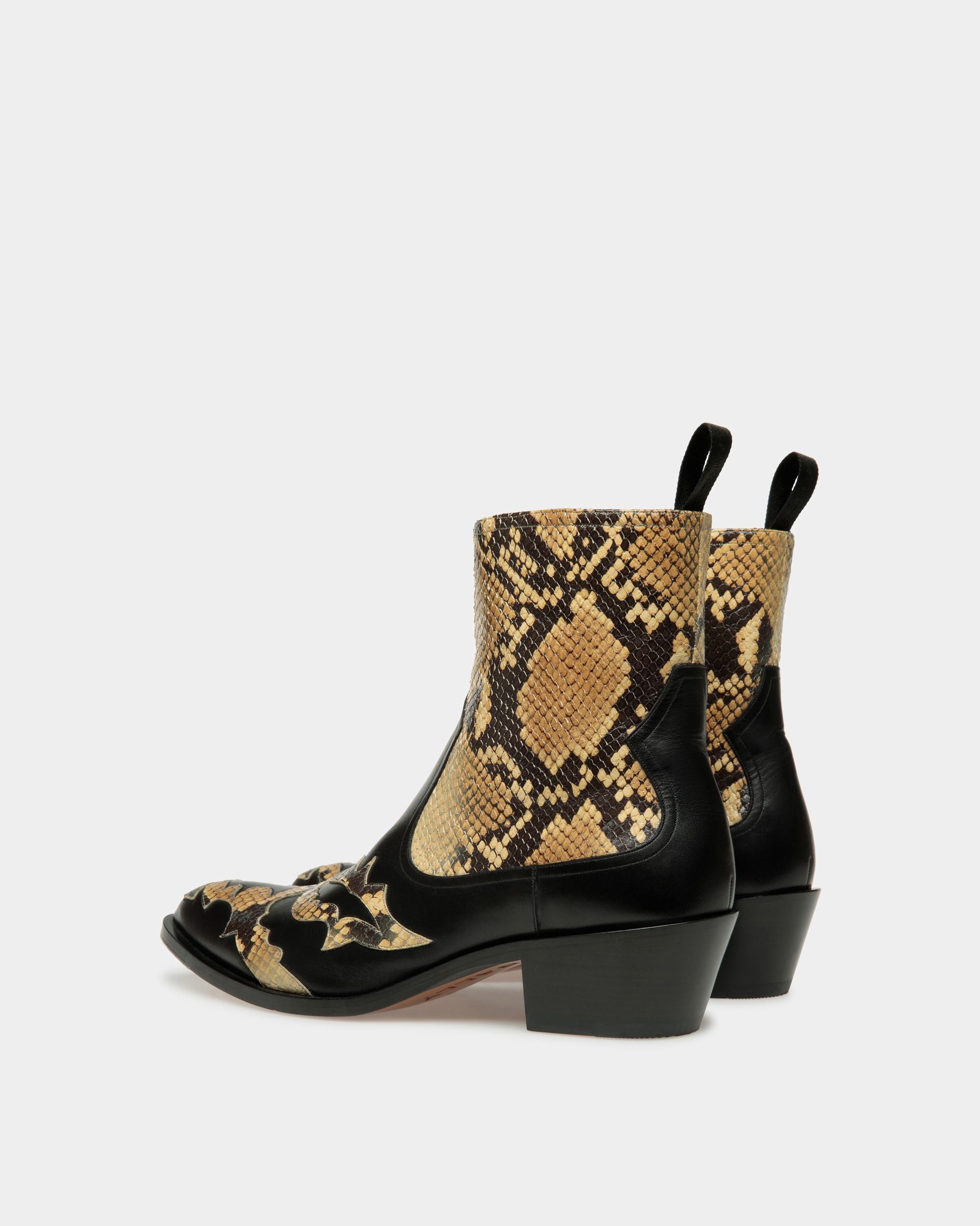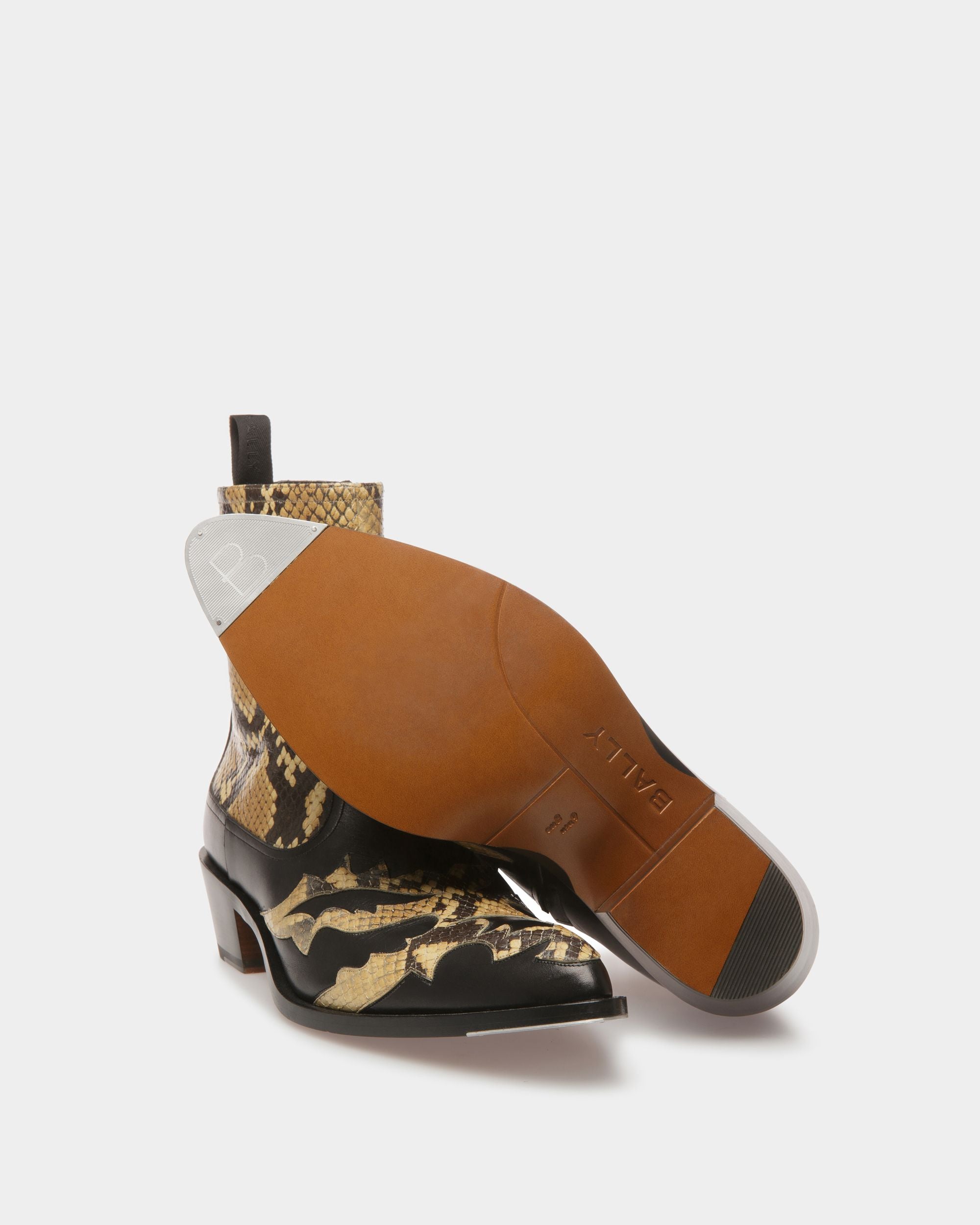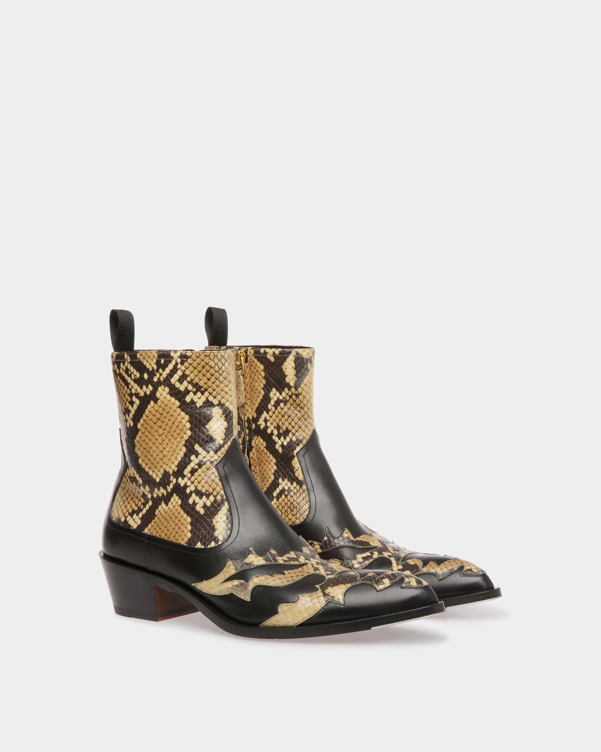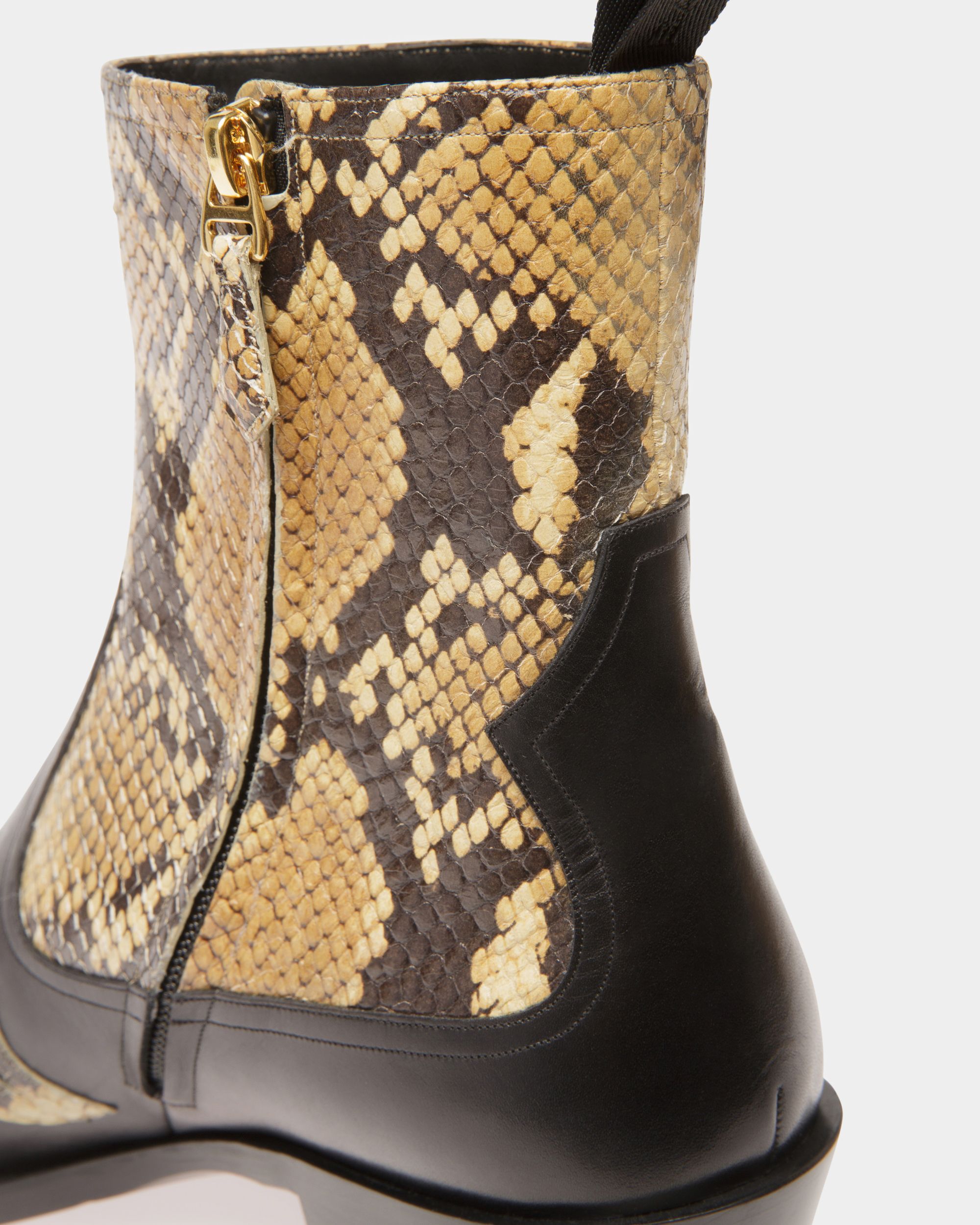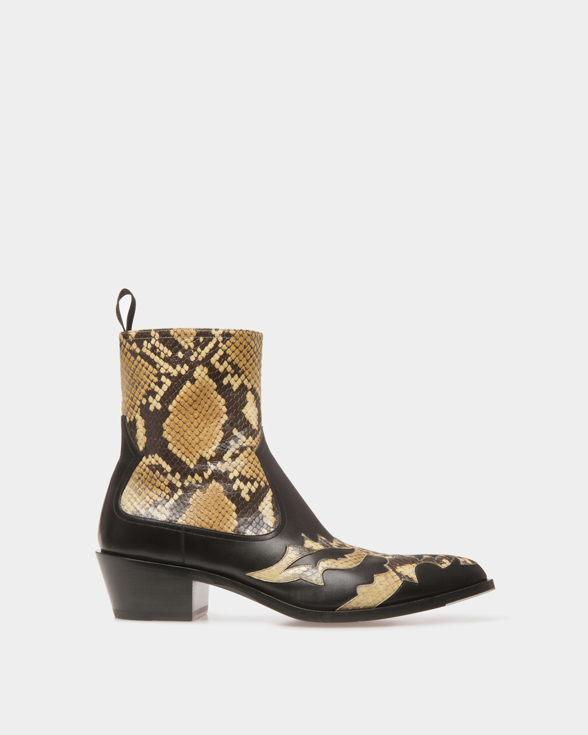 A new era for cowboy boots. Vamir is elevated with shiny python print details and a 45mm Texan heel. The boots are complete with a rear loop for easy step-in functionality.