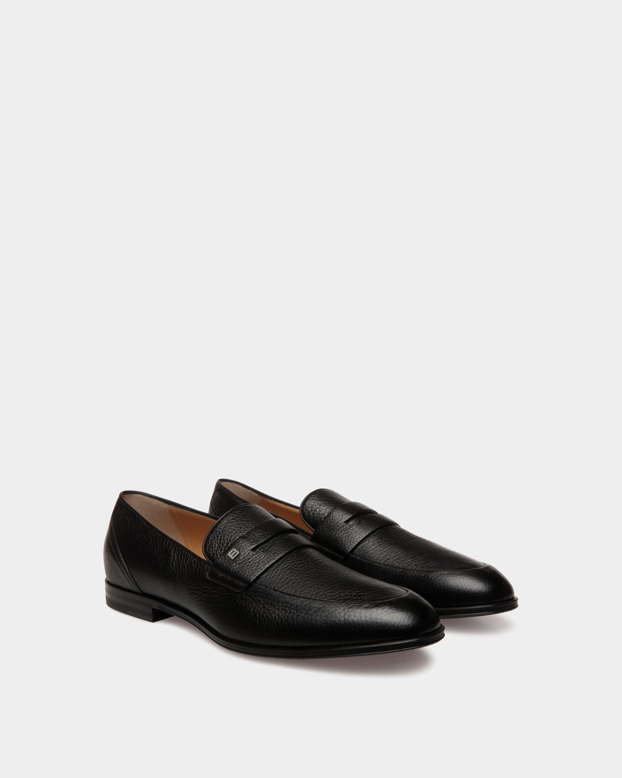 This almond-toe Westminster loafer in black deer leather is characterized by a grained finish, tonal stitching and a saddle strap across the top, embellished with a metal Bally B detail.