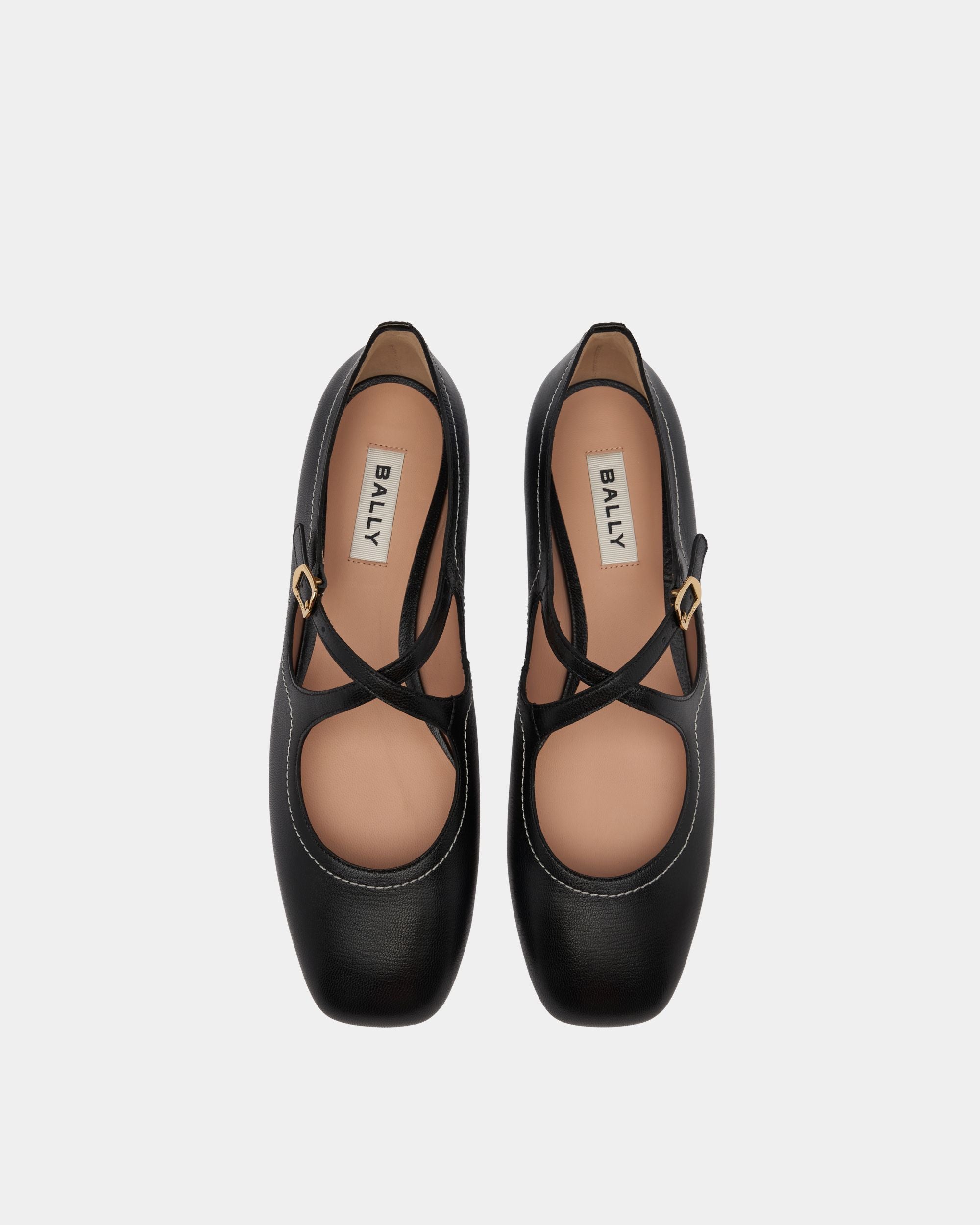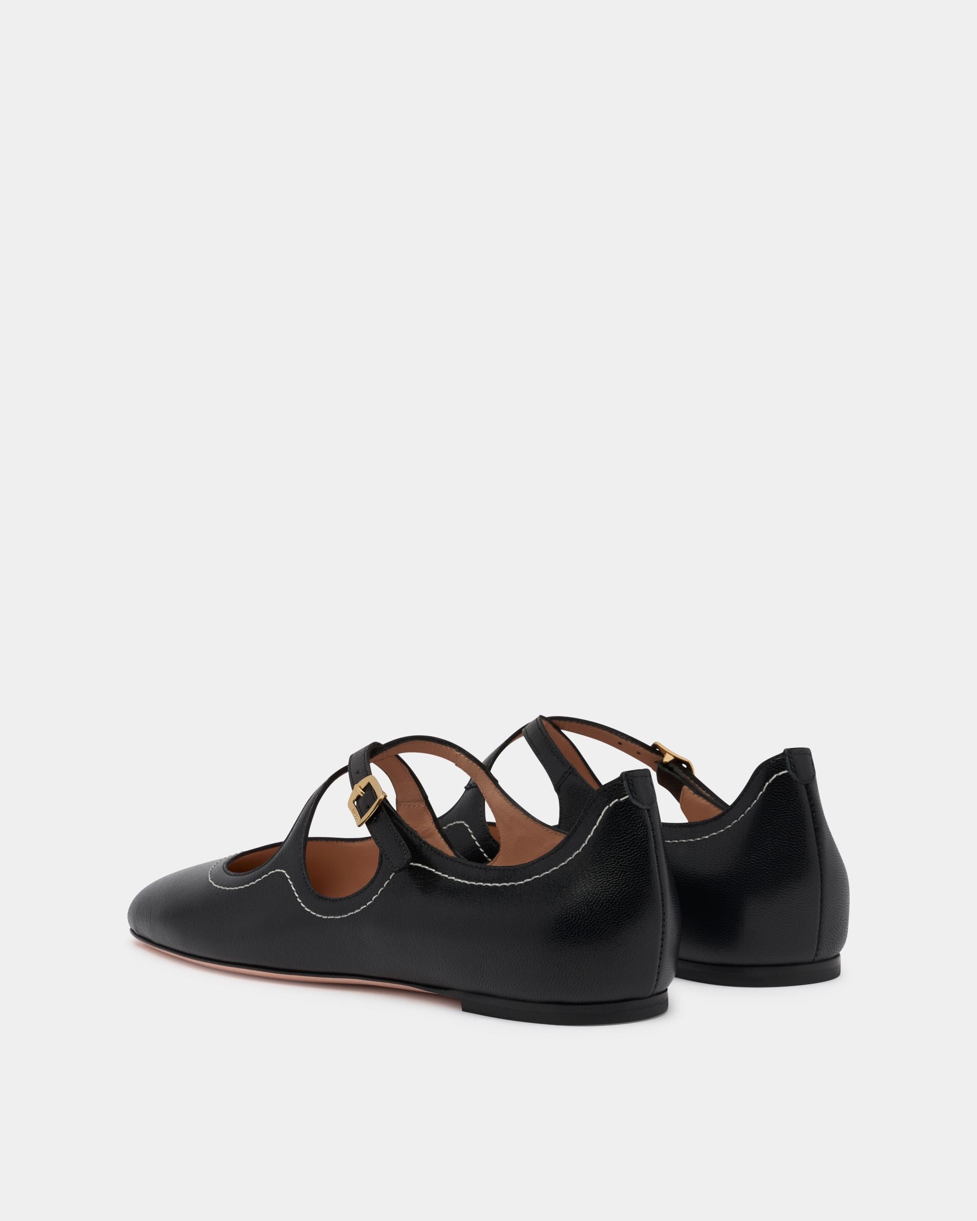 This Ballyrina flat in black kidskin is decorated by contrast topstitching that contours the lines of the collar, a simple expression of Bally's fine craftsmanship and iconic design. The two straps cross at the center, secured by a gold-tone buckle inspired by an archival detail.