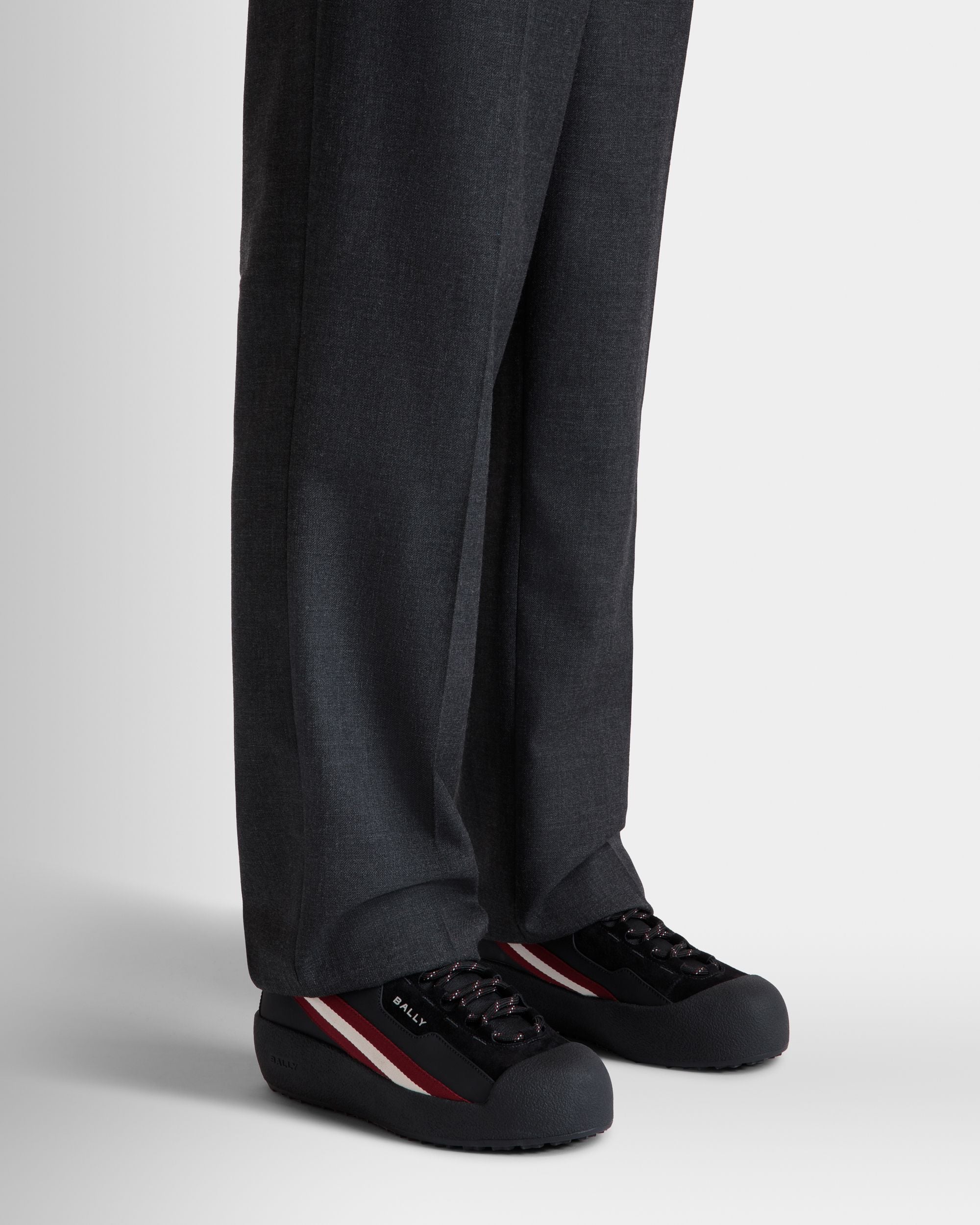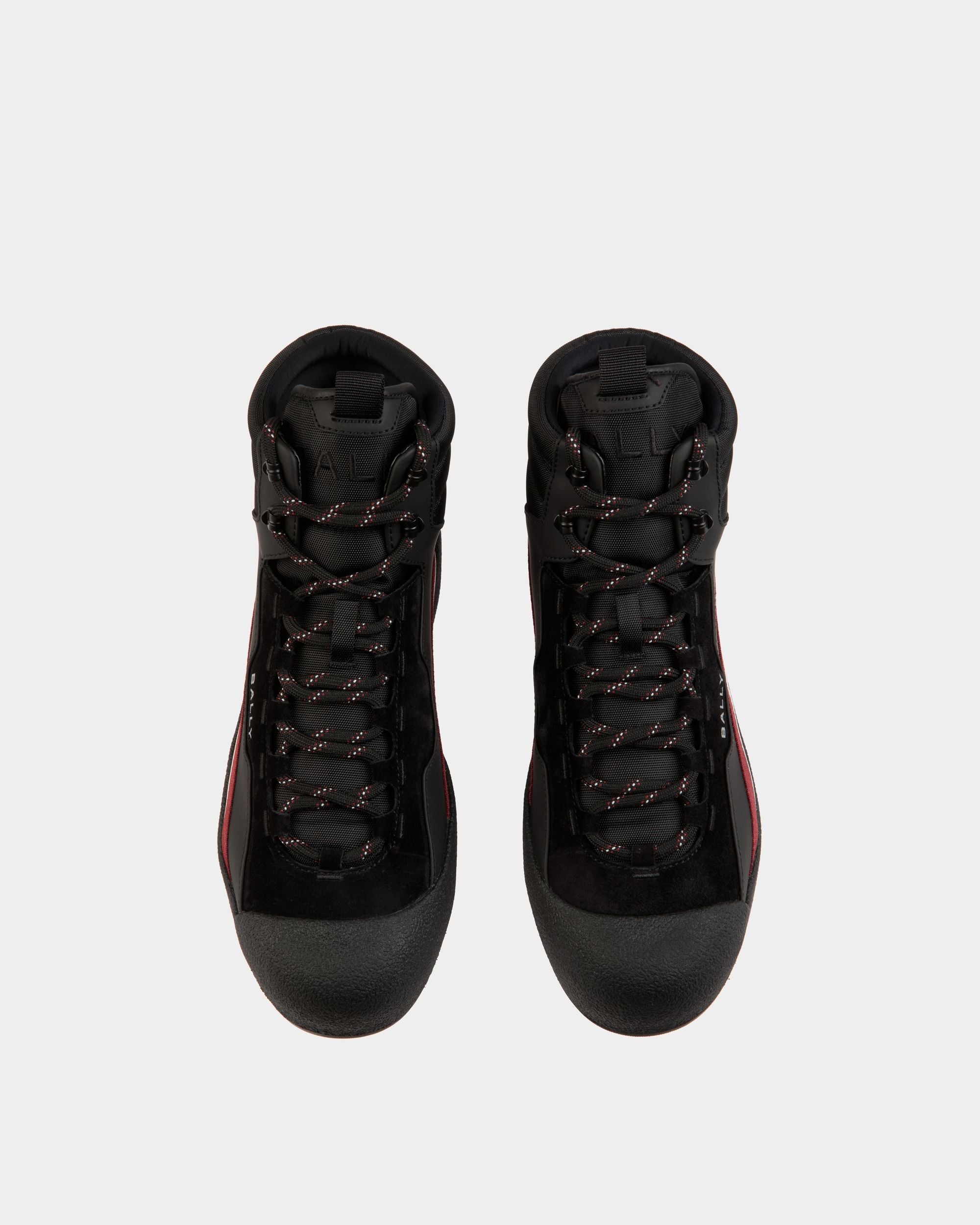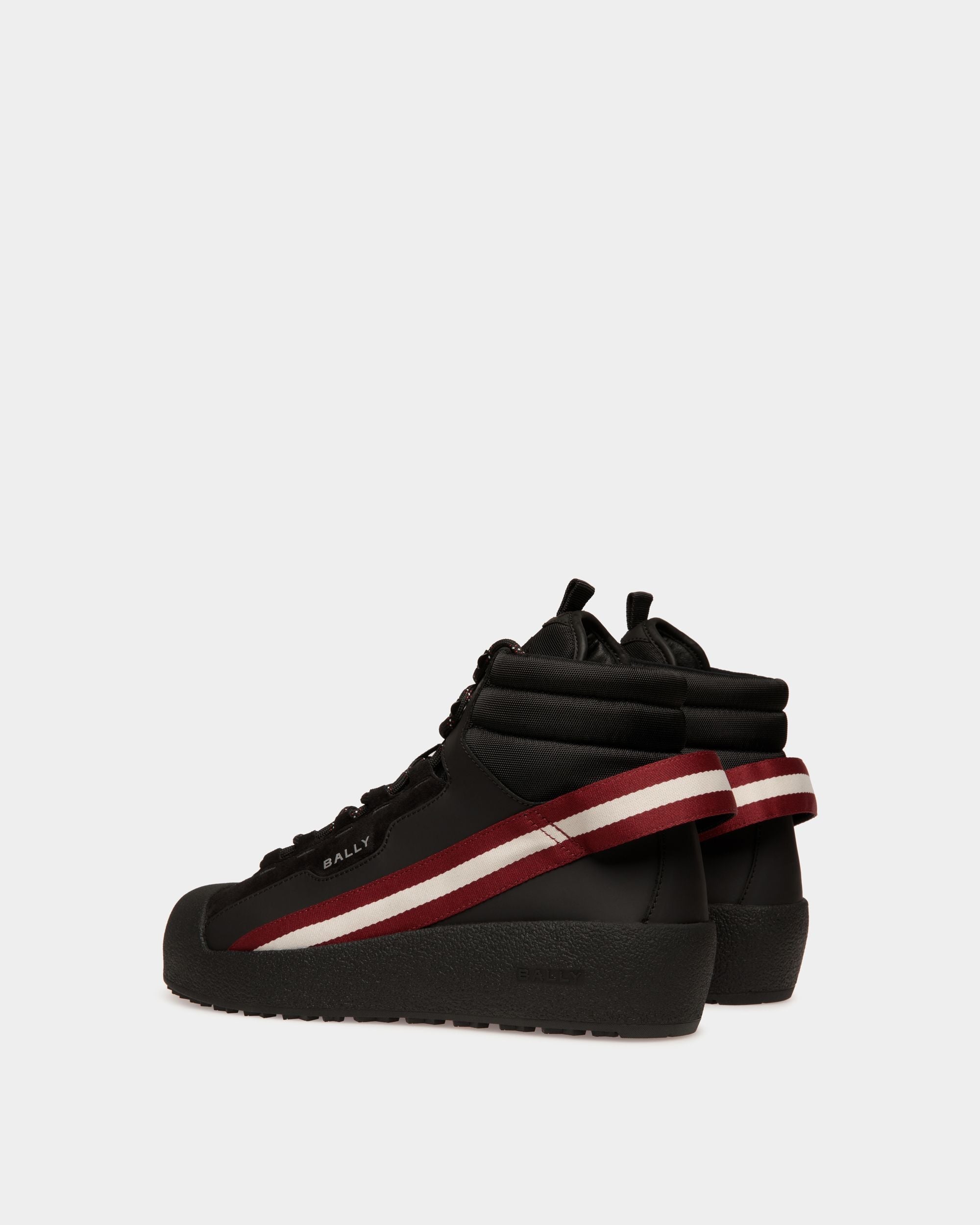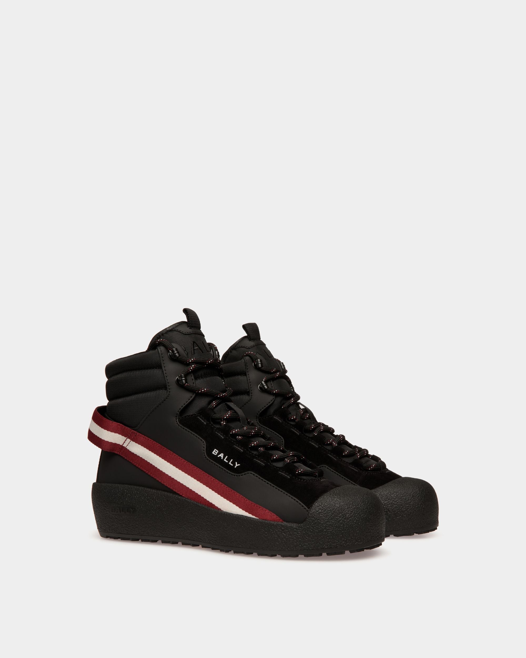 This Curling bootie in black rubberized leather and fabric unites the classic style of a pull-on curling boot with the modern lines of a high-top sneaker. A Bally Ribbon extends across the side into a rear pull loop.