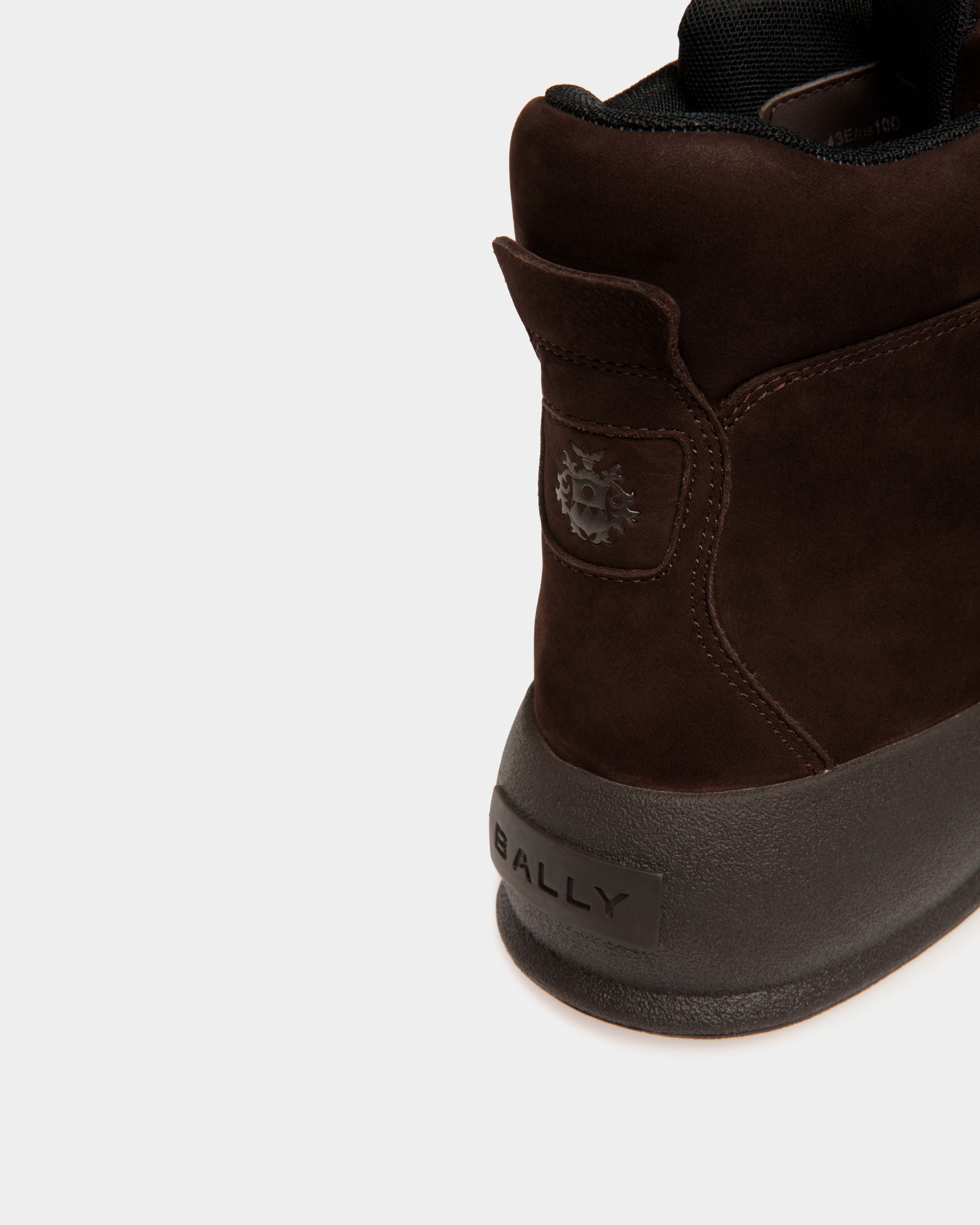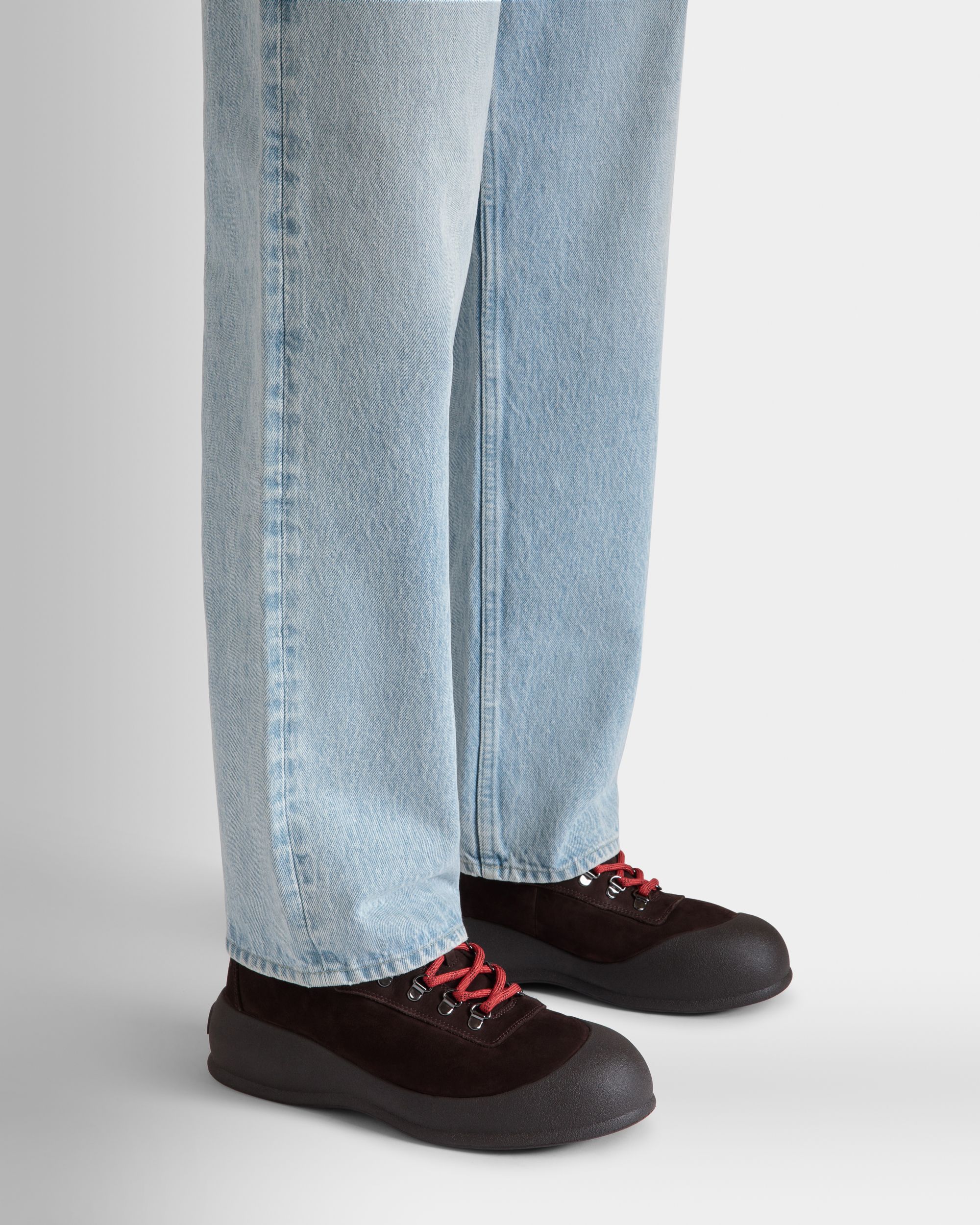 Frei snow boot in Ebano nubuck with a rapid-grip rubber sole for stability on any terrain. Metal hooks and eyelets paired with red woven laces reinforce the trekking inspiration of this style.