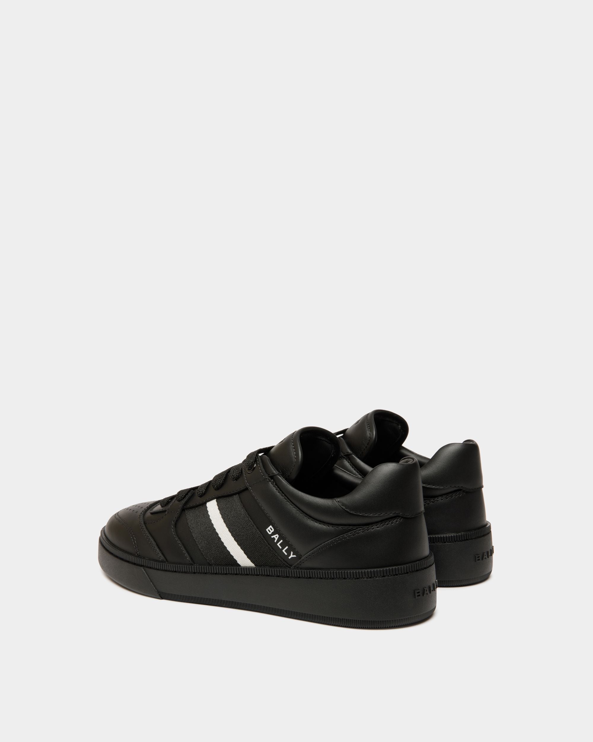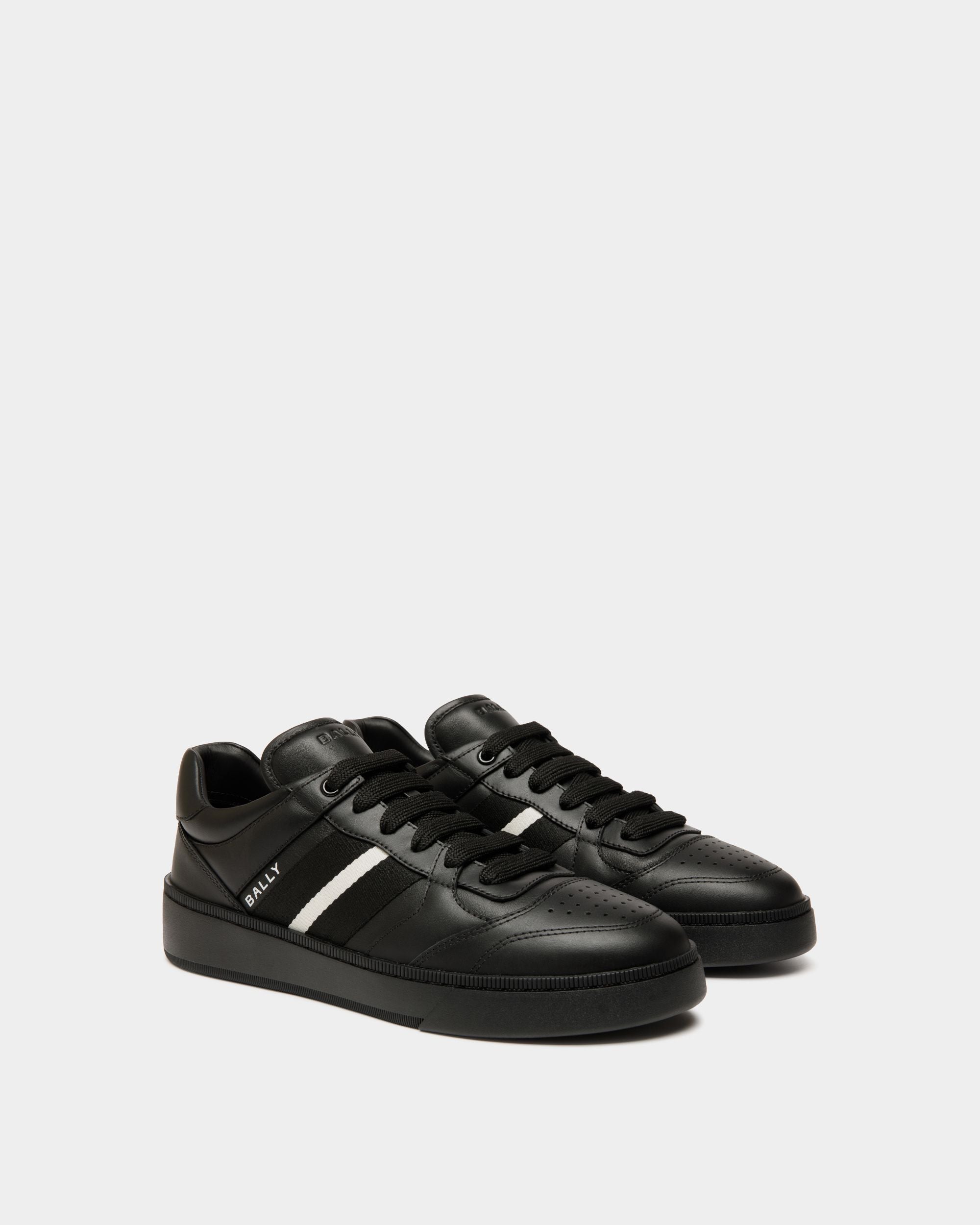 This Raise sneaker in black leather is defined by the interplay of leather panels and a black and white grosgrain Bally Ribbon at the side. The thick rubber sole promises comfort and a modern aesthetic.