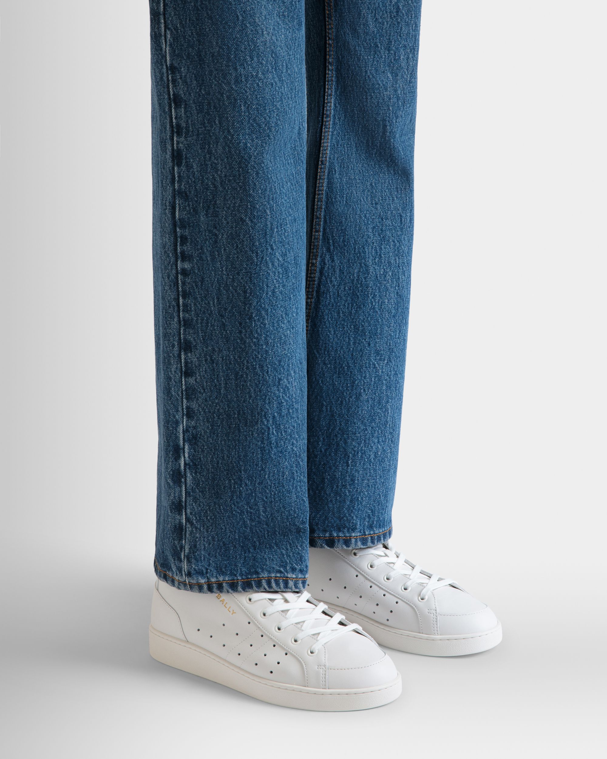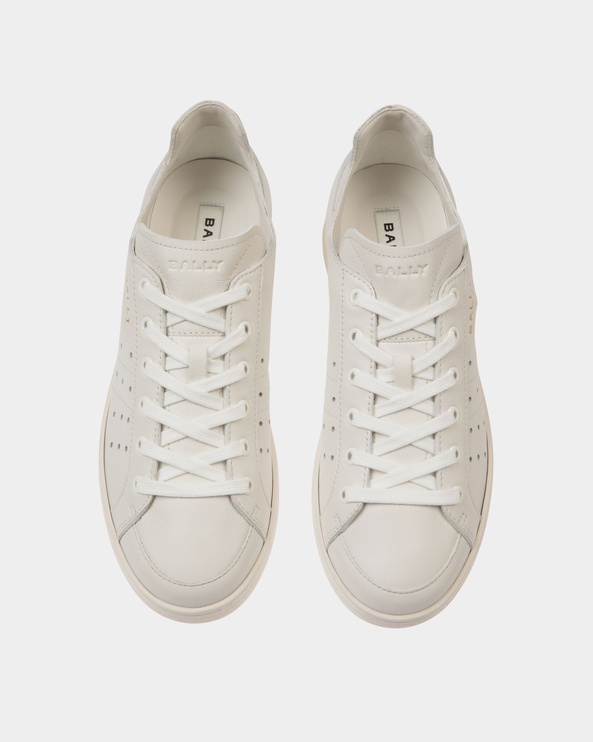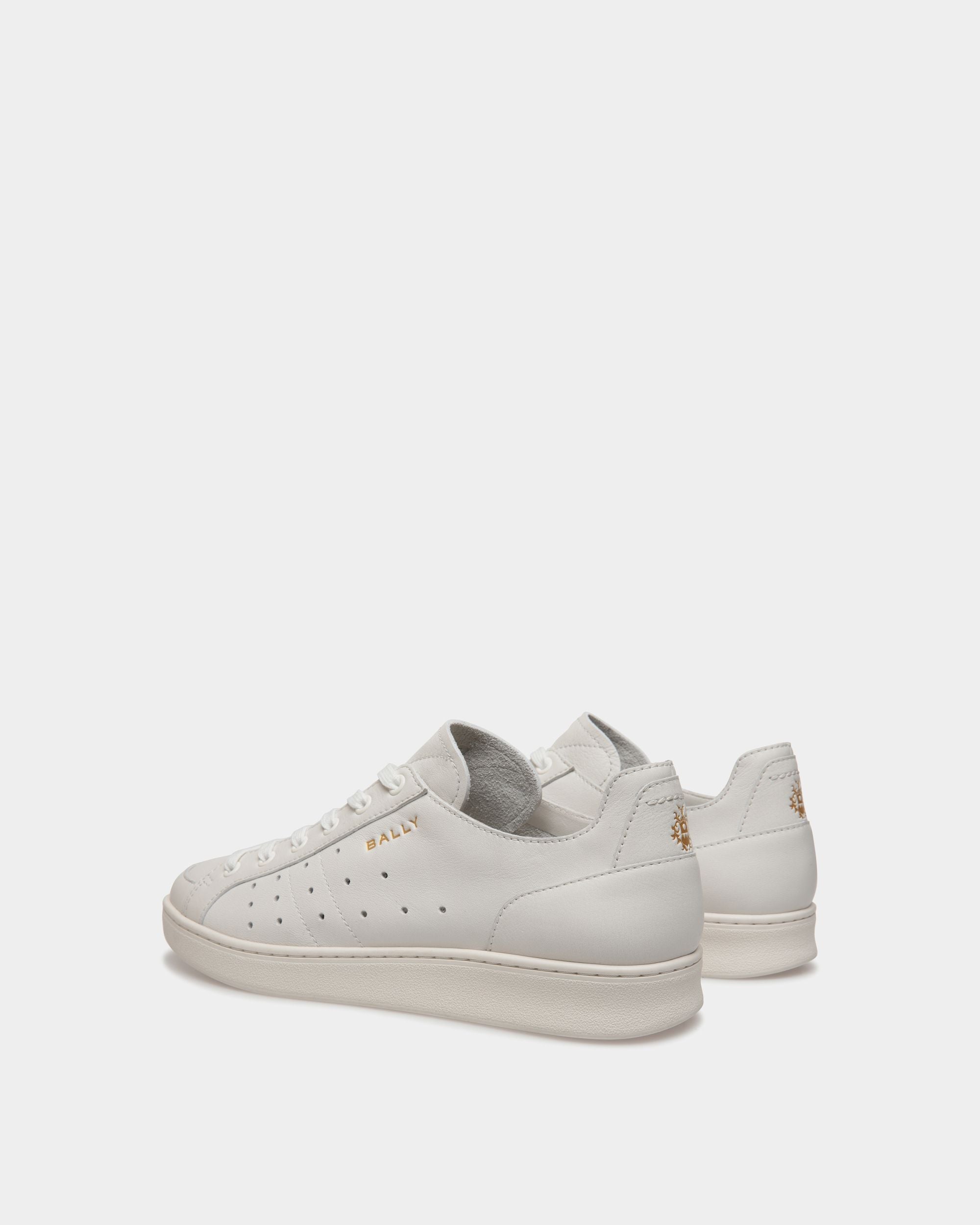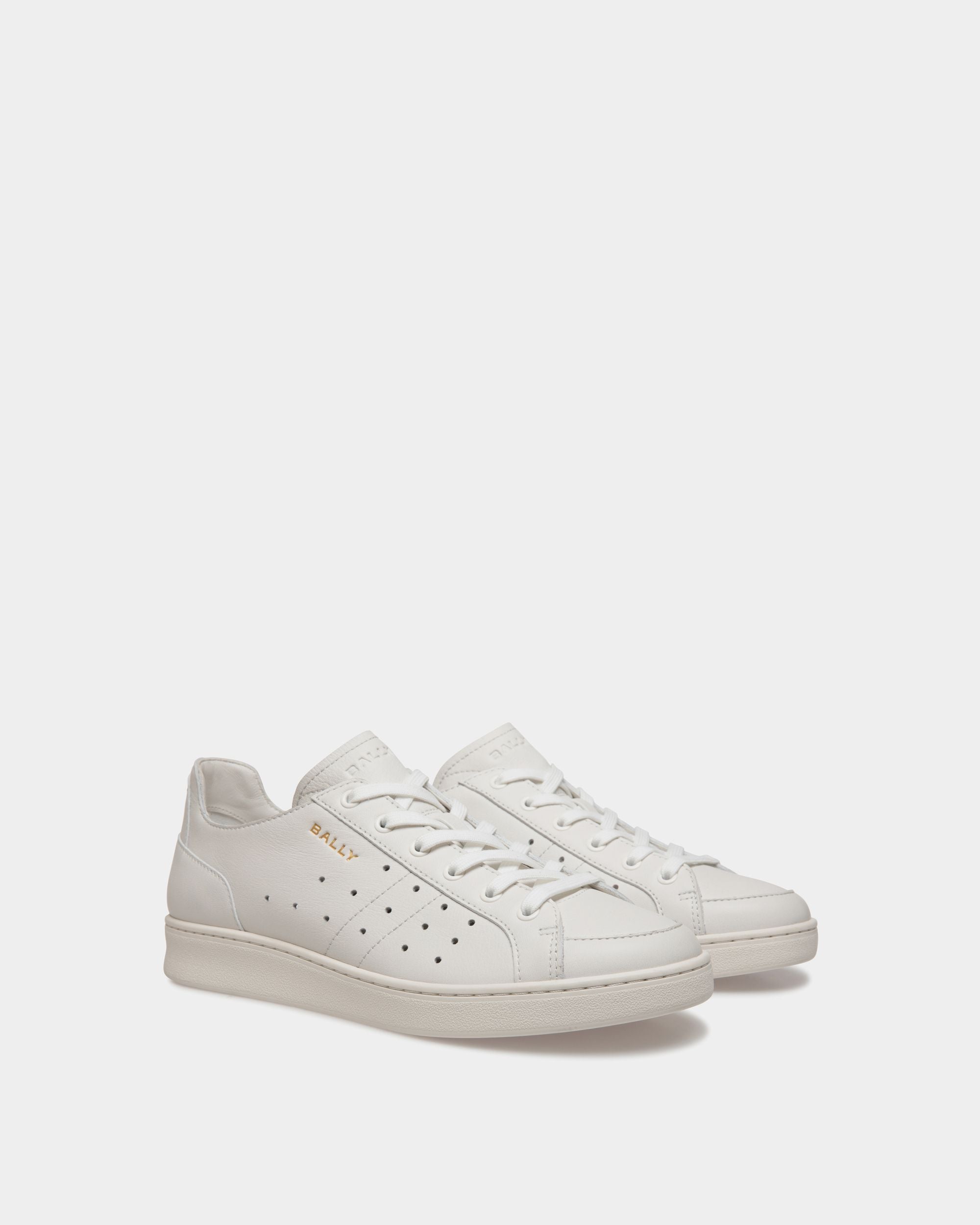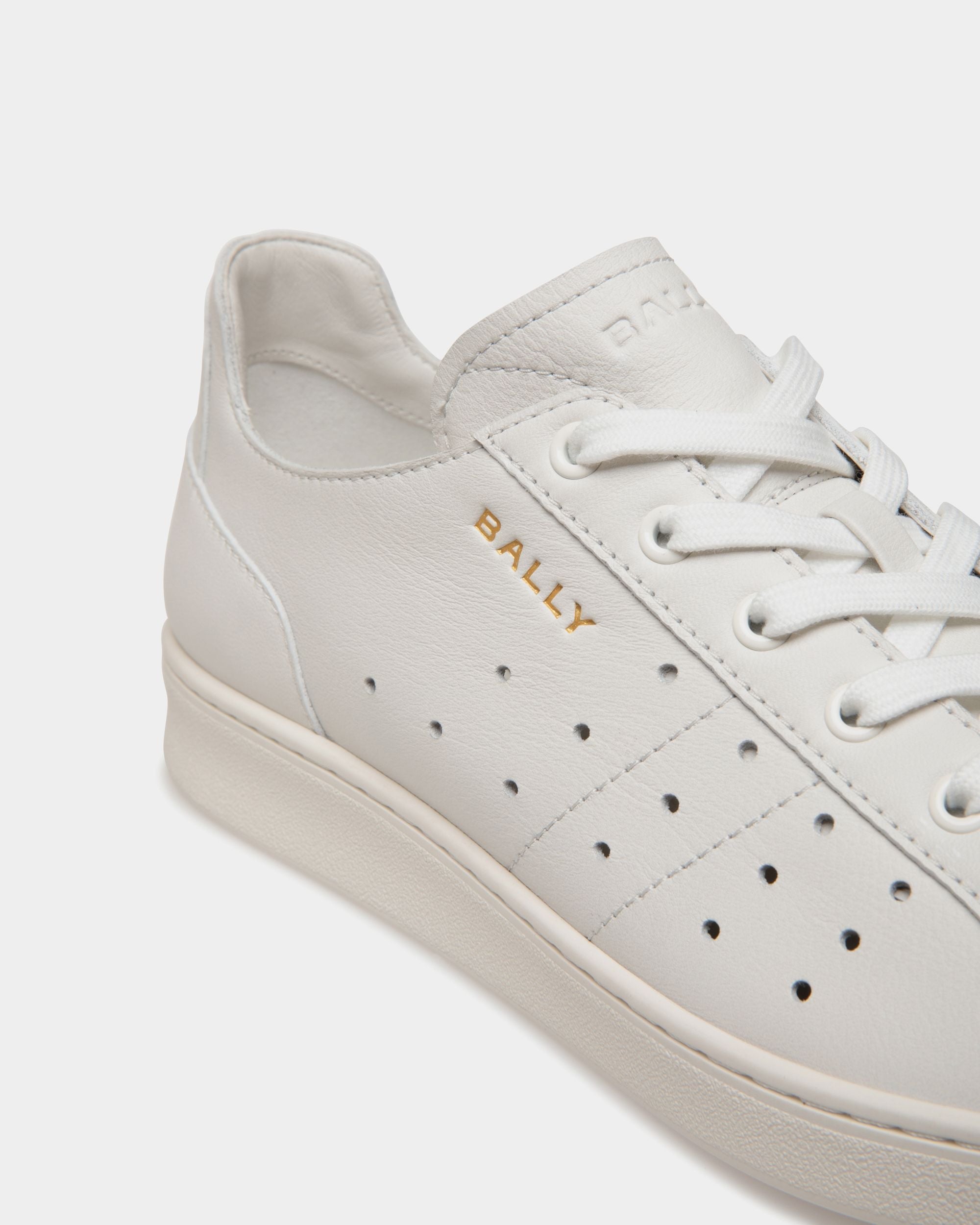 This Tennis sneaker in white leather is embellished by openwork detailing on the quarter. A gold-tone debossed Bally Crest and logo add an iconic note.