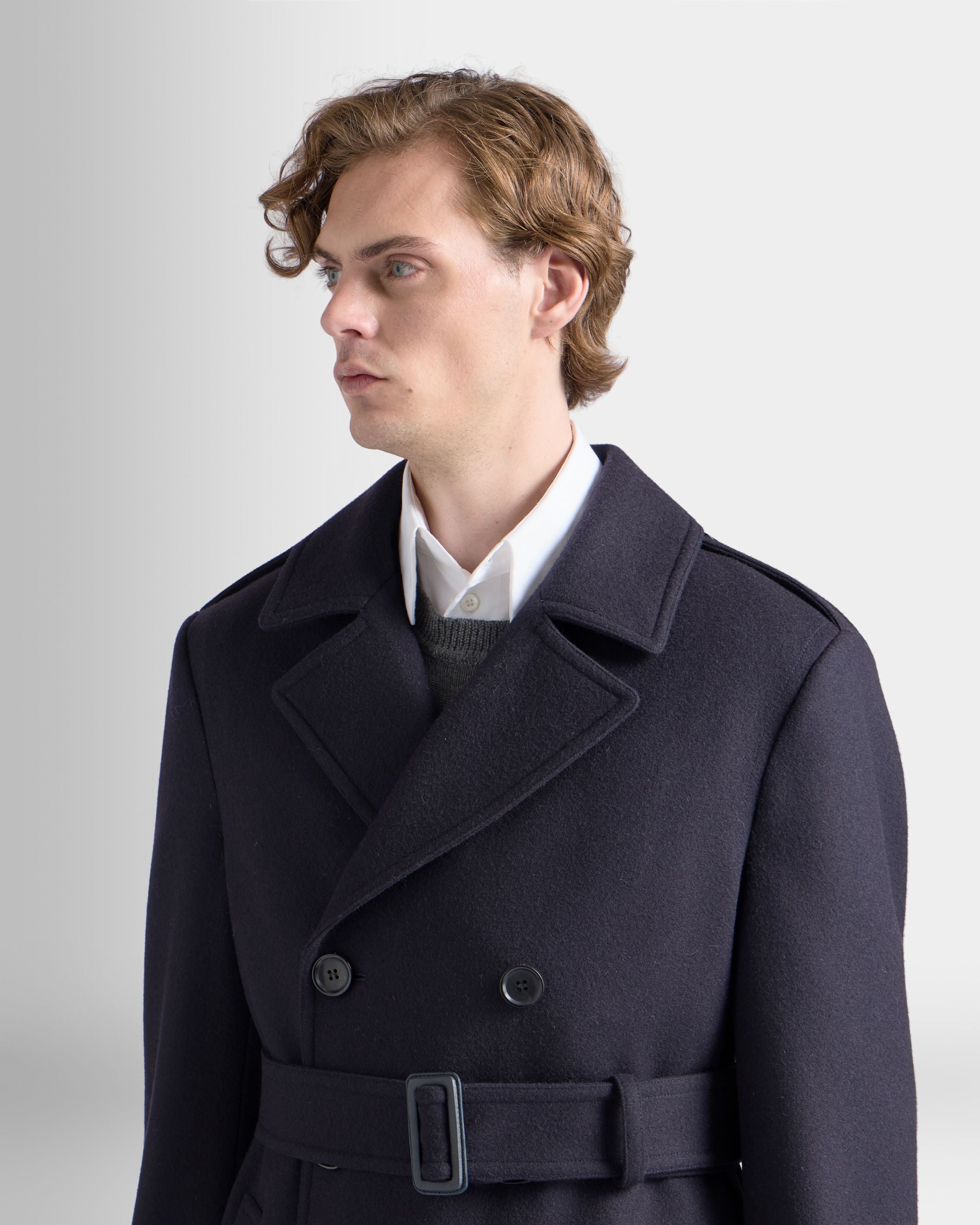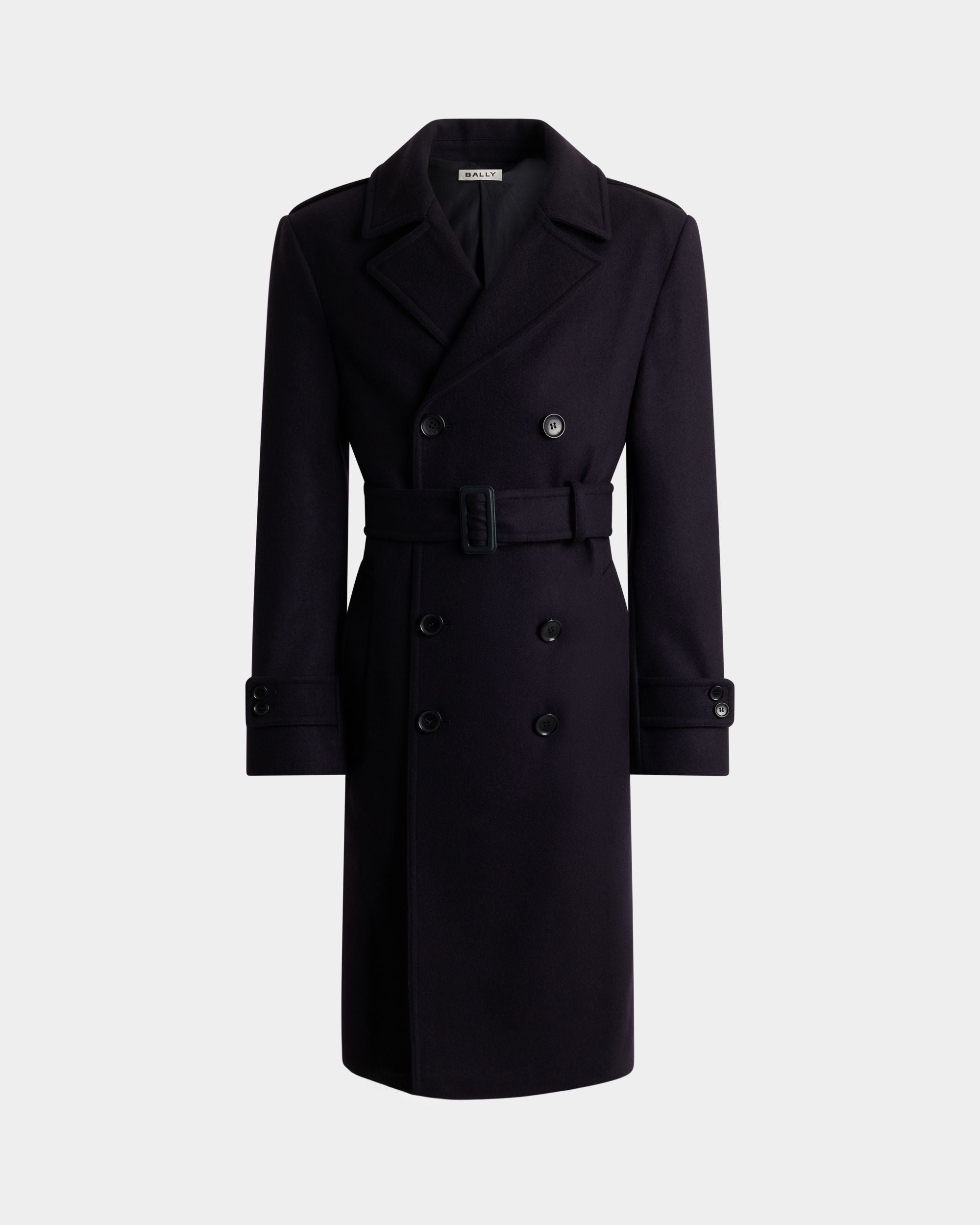 Timeless navy blue double-breasted trench coat in a wool blend with real horn buttons. Additional details include notched lapels, front welt pockets and epaulettes on the shoulders. A matching belt with a leather-covered buckle adjusts the silhouette.