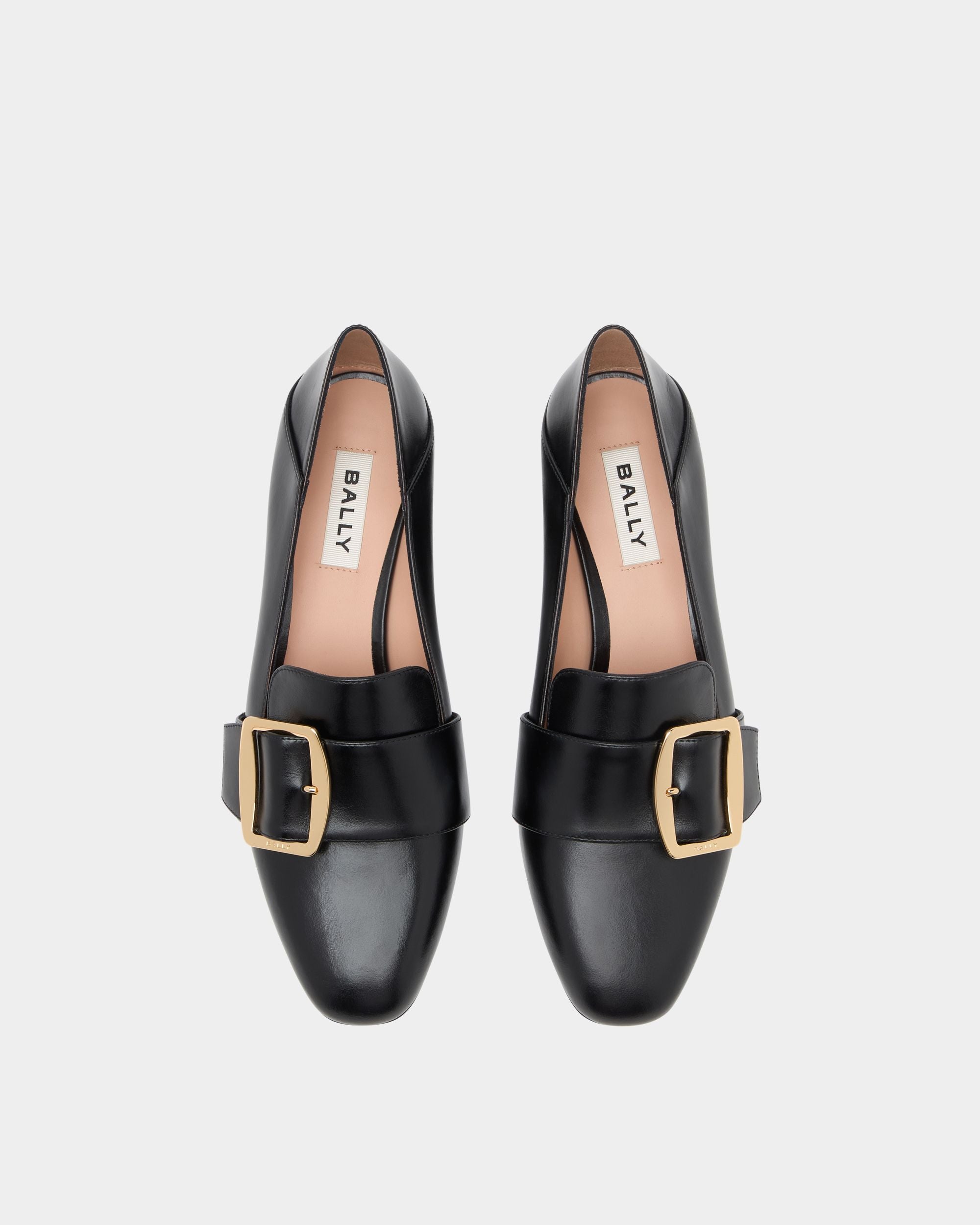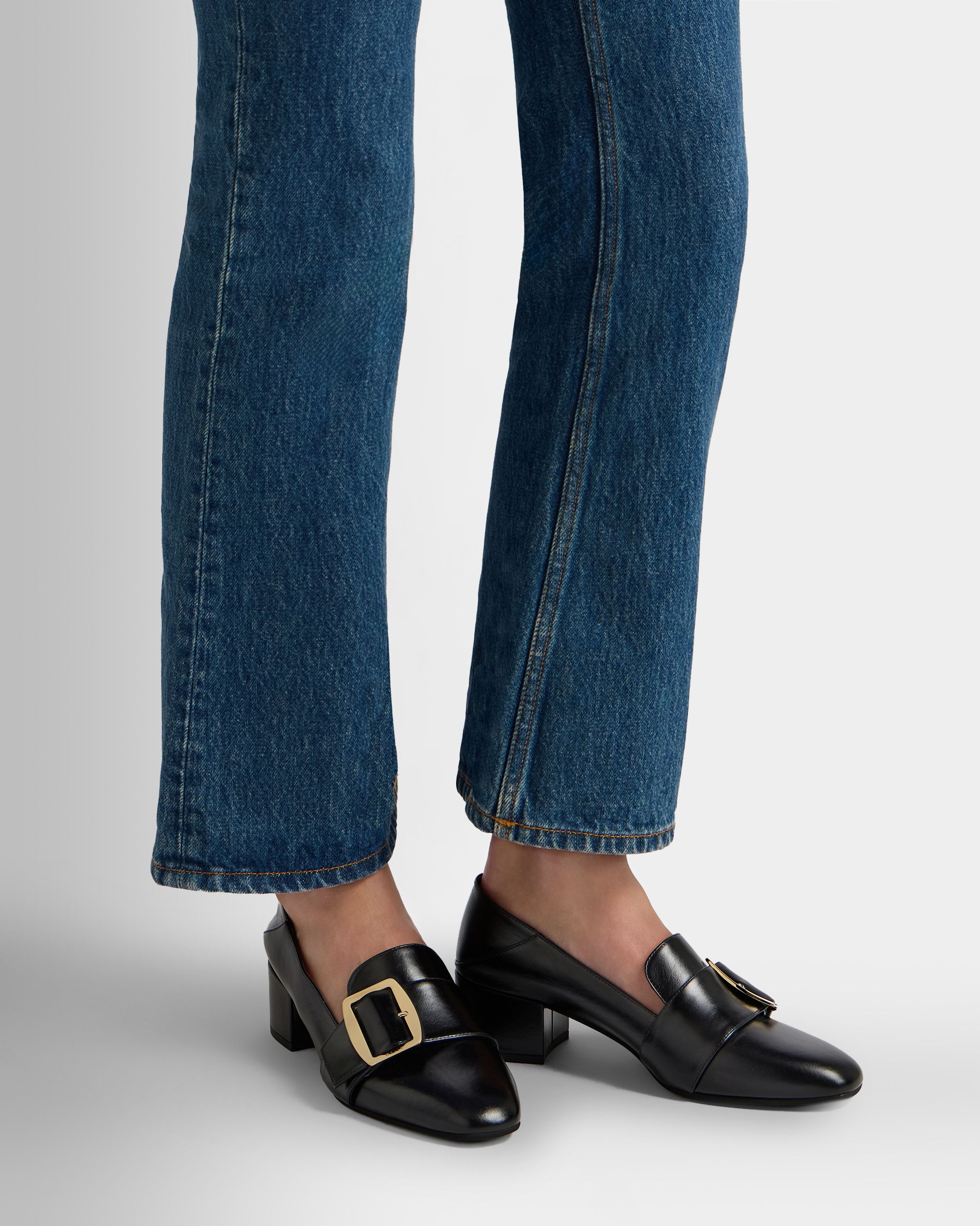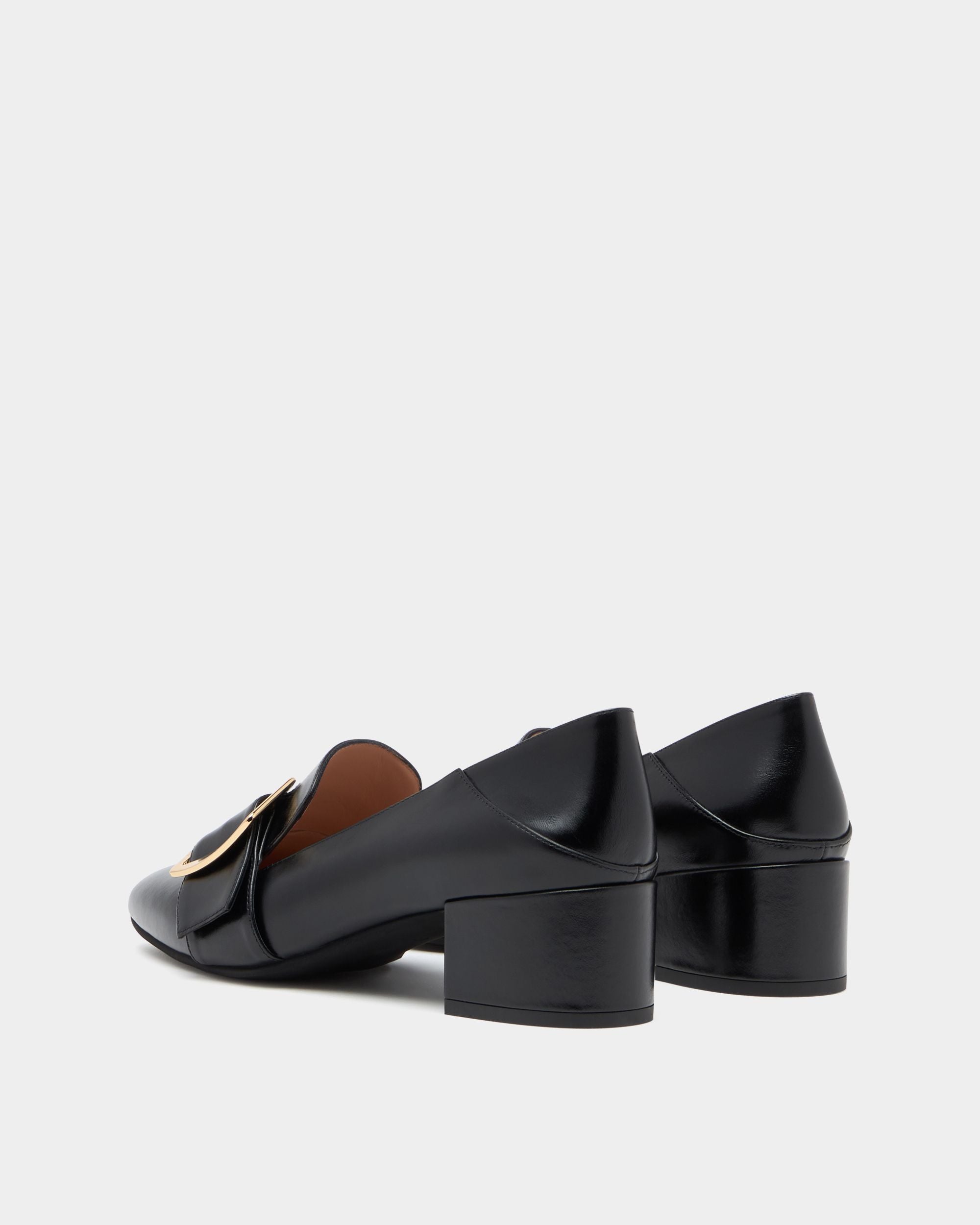 This Bally Boucle pump in black leather is characterized by the large buckle at the front, a reinterpretation of an iconic Bally detail from the 1920s. To the back, the heel folds down for use as a mule.