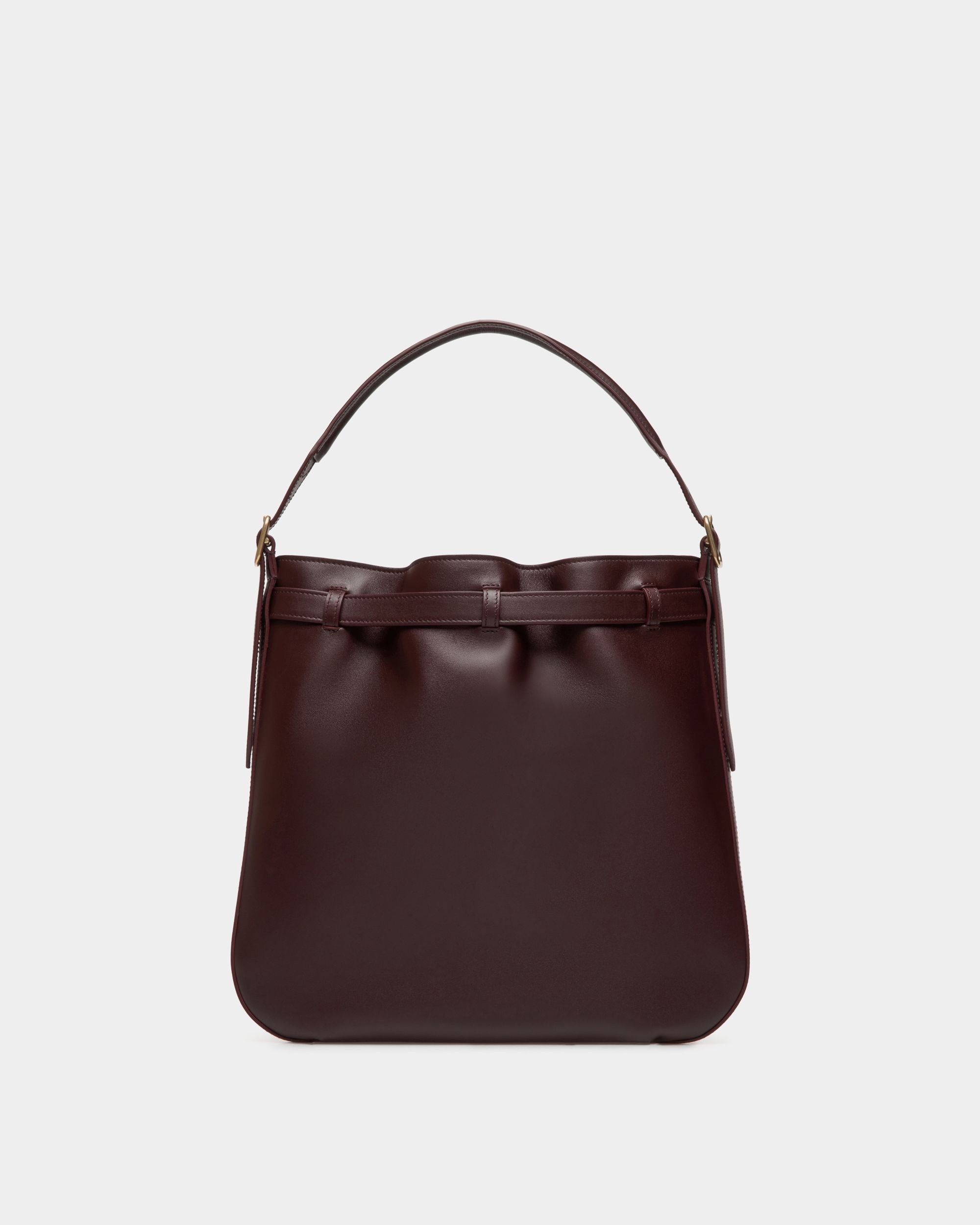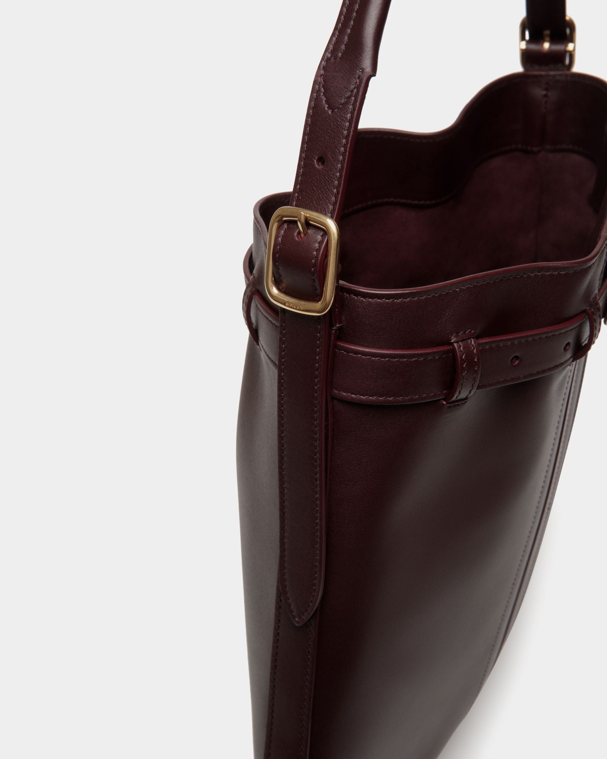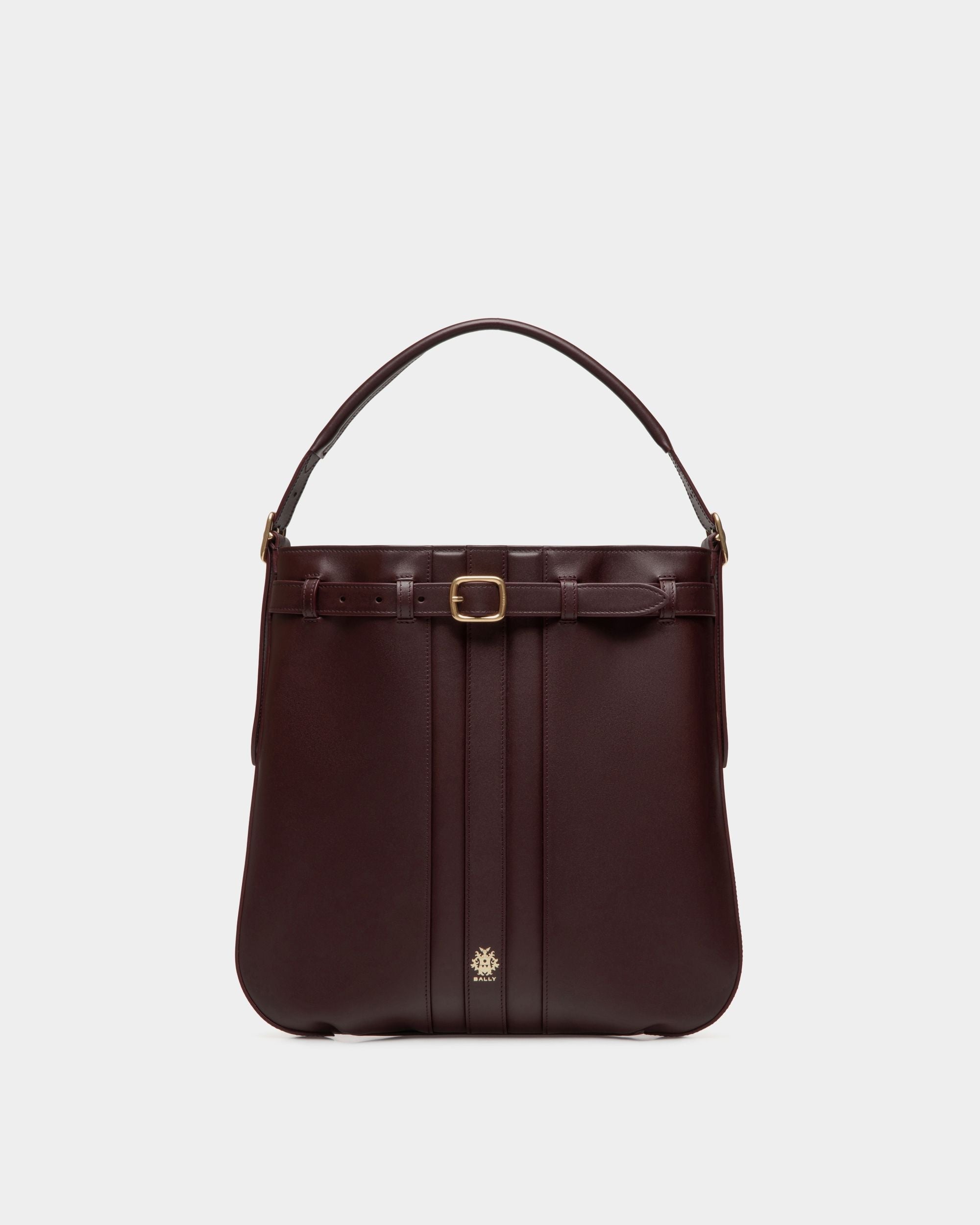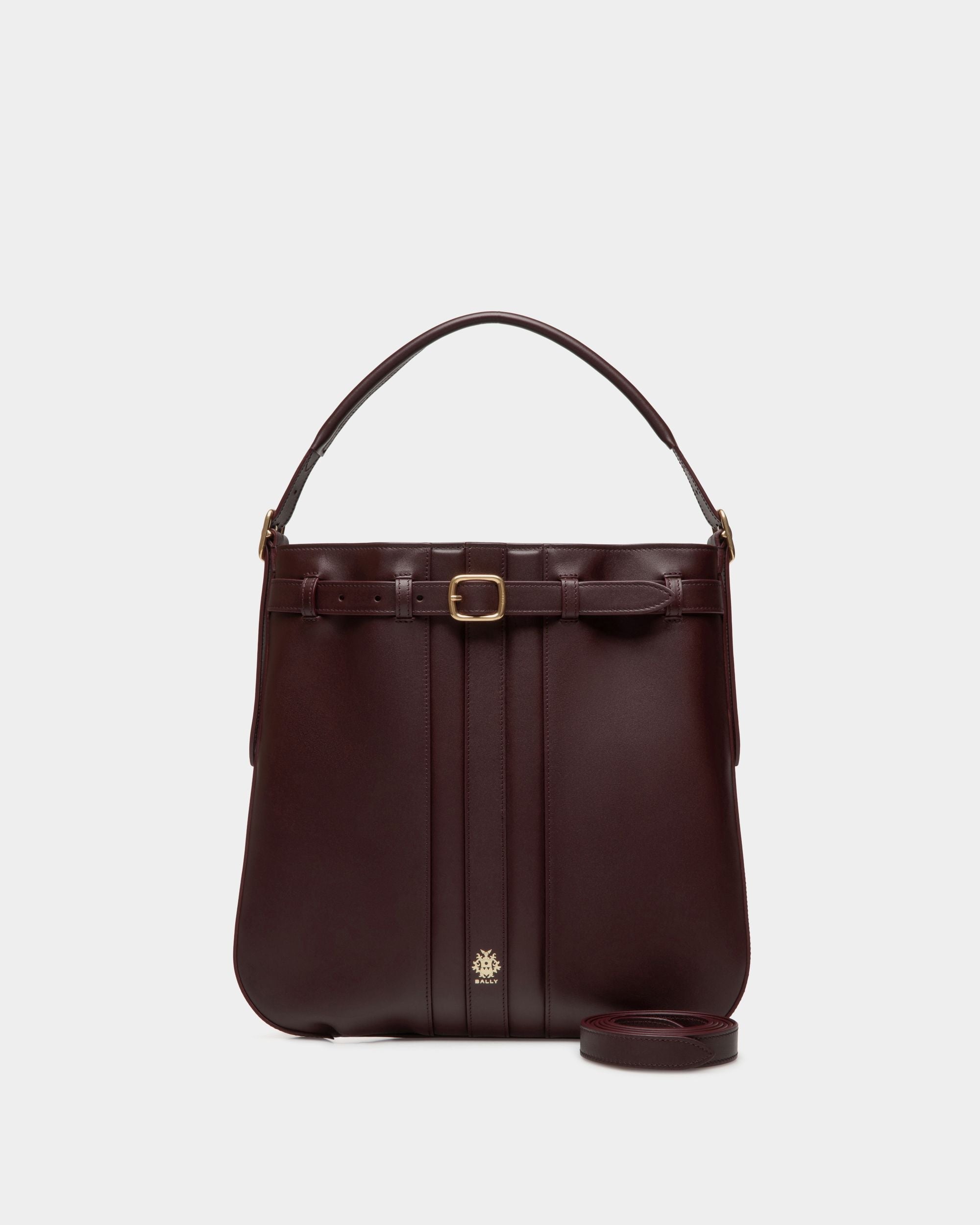 Featured in the FW24 Bally fashion show, this Beckett crossbody bag in deep burgundy calfskin has an adjustable strap secured by a gold-tone metal buckle. An inlay Ribbon and a foil Crest represent Bally signifiers.
