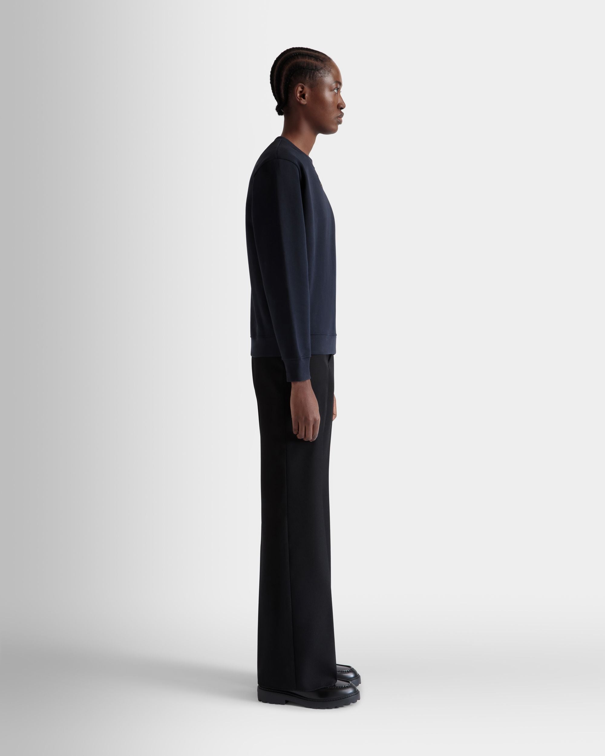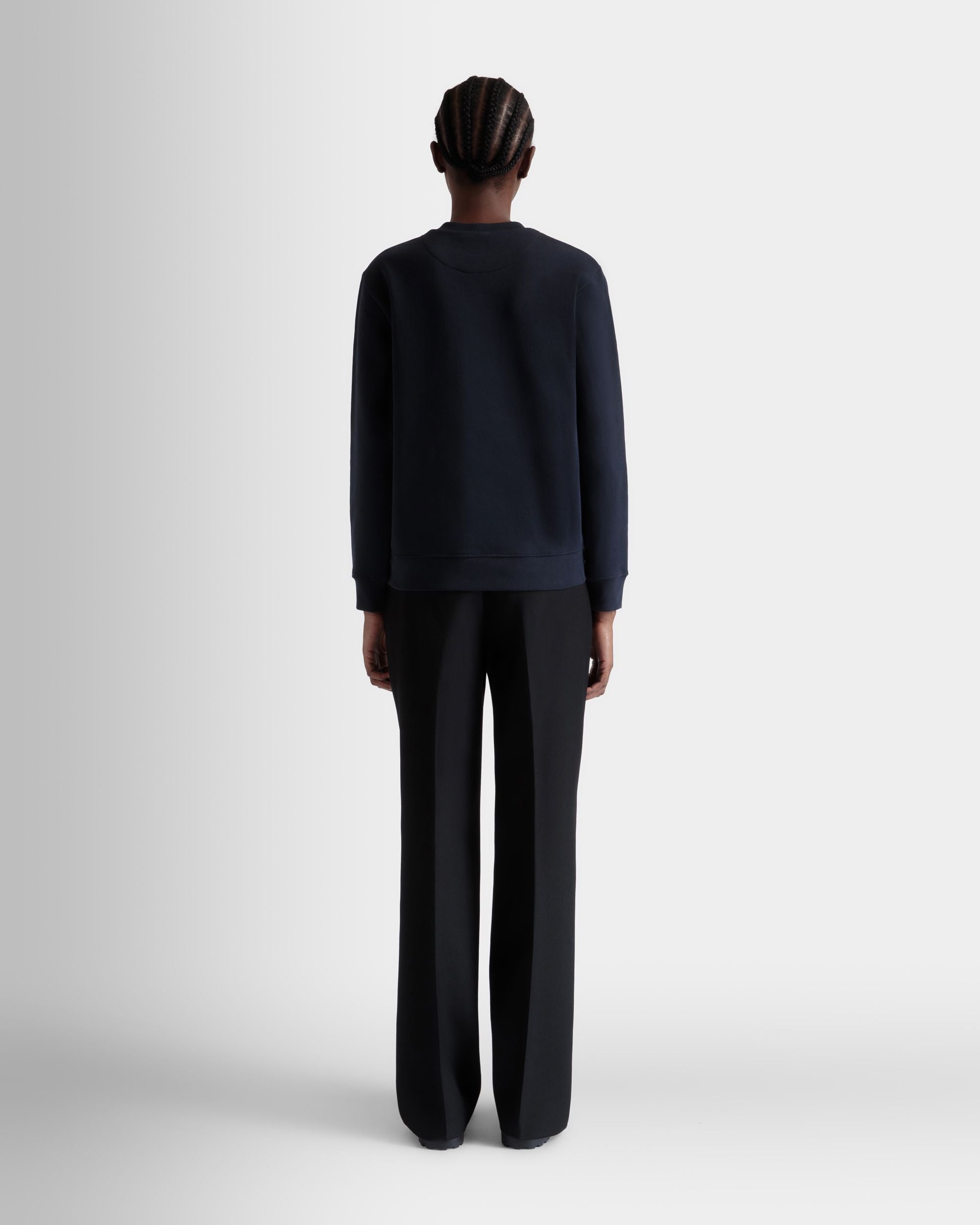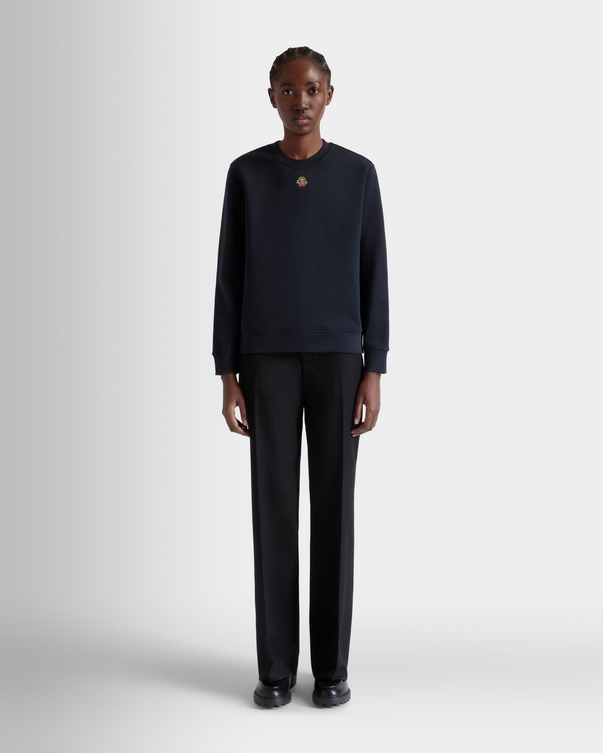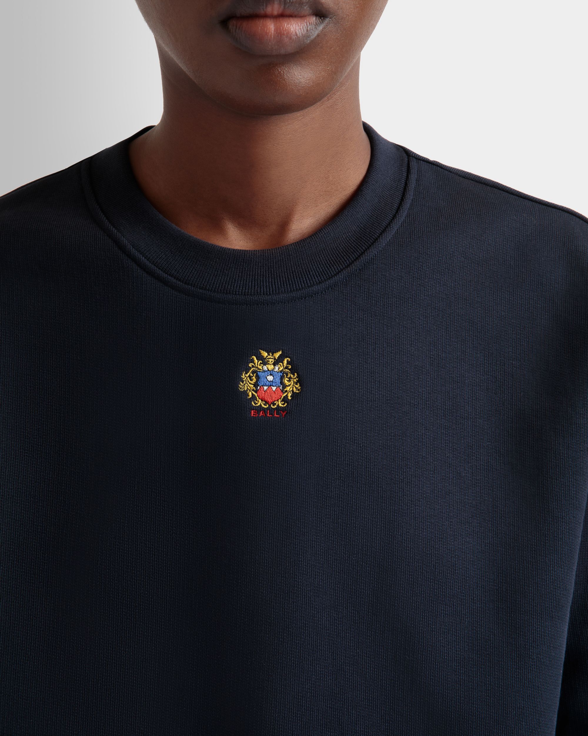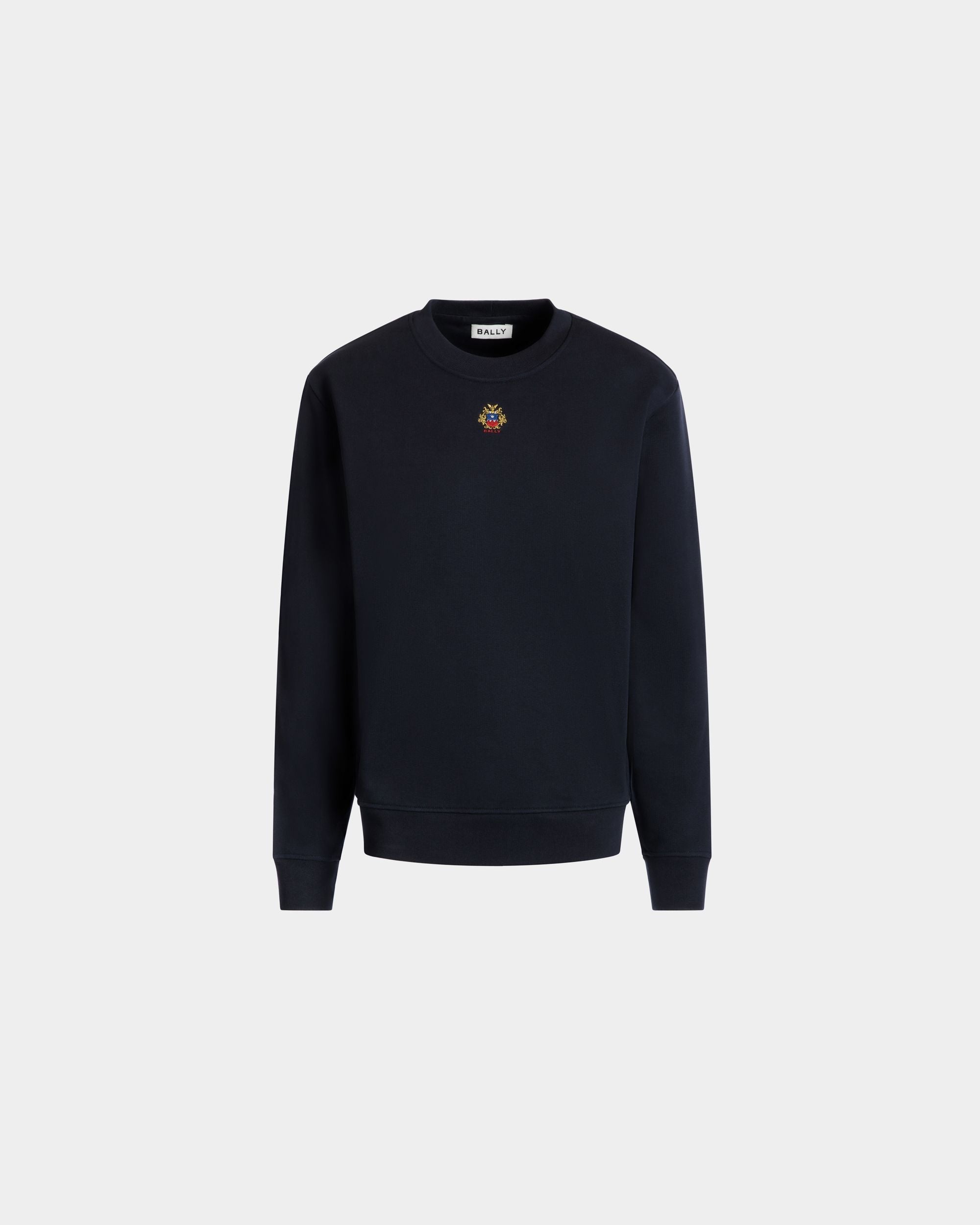 This navy blue sweatshirt in knit cotton is embellished by Bally Crest embroidery just below the crewneck collar.