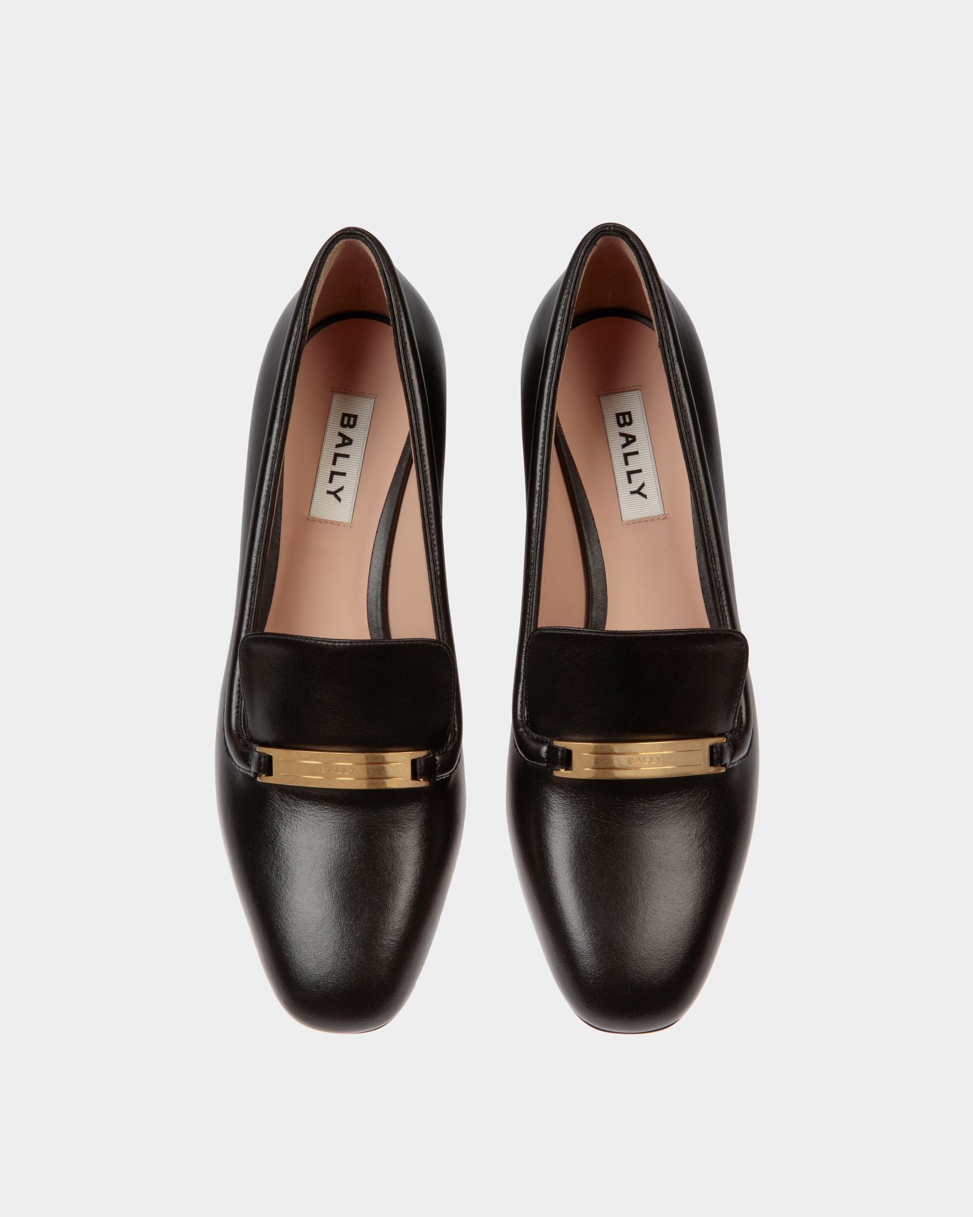 A simple metal plaque with a Bally Ribbon signifier extends across the top of this Deco pump in black leather. Its loafer-inspired design is enriched by a leather-covered block heel.
