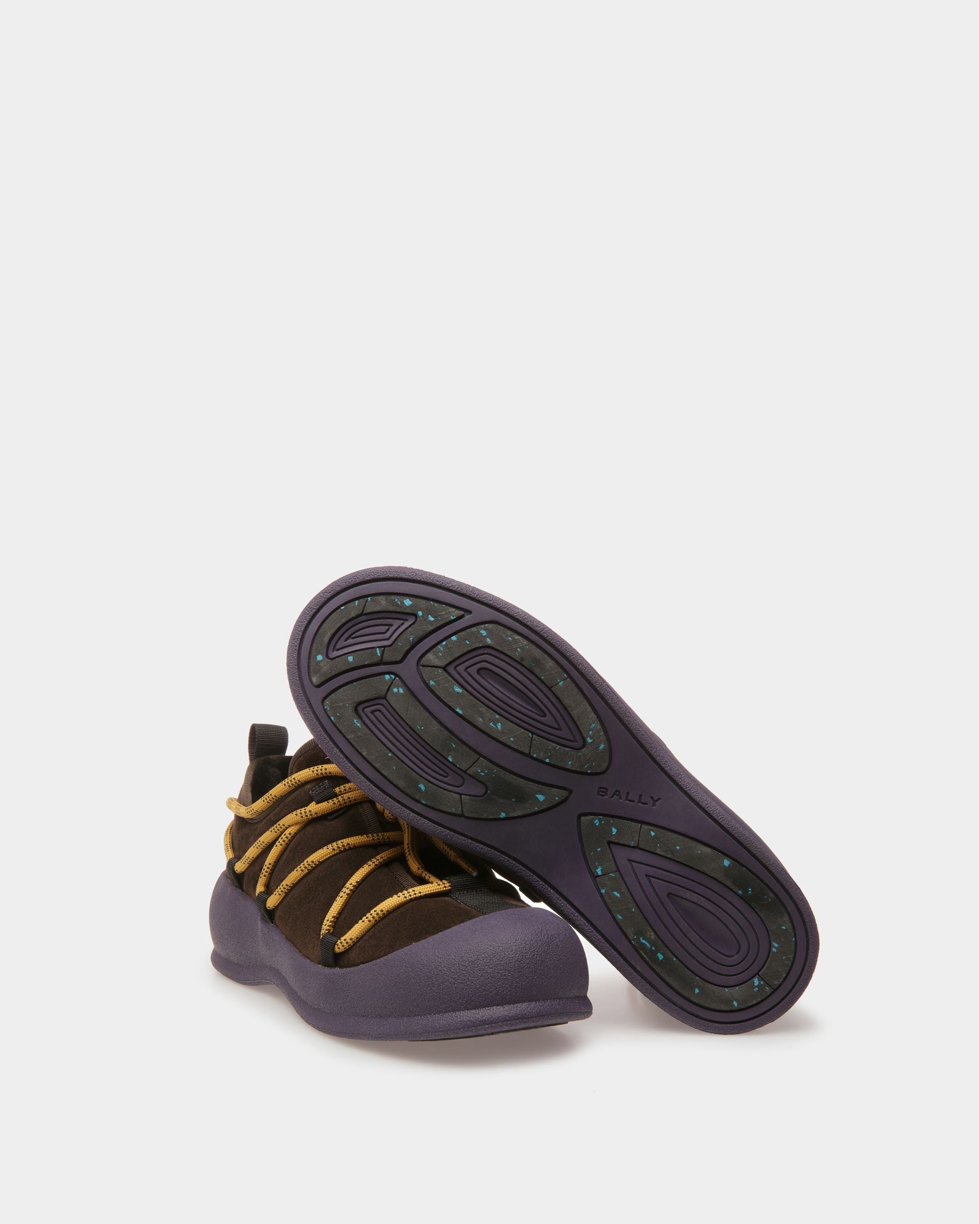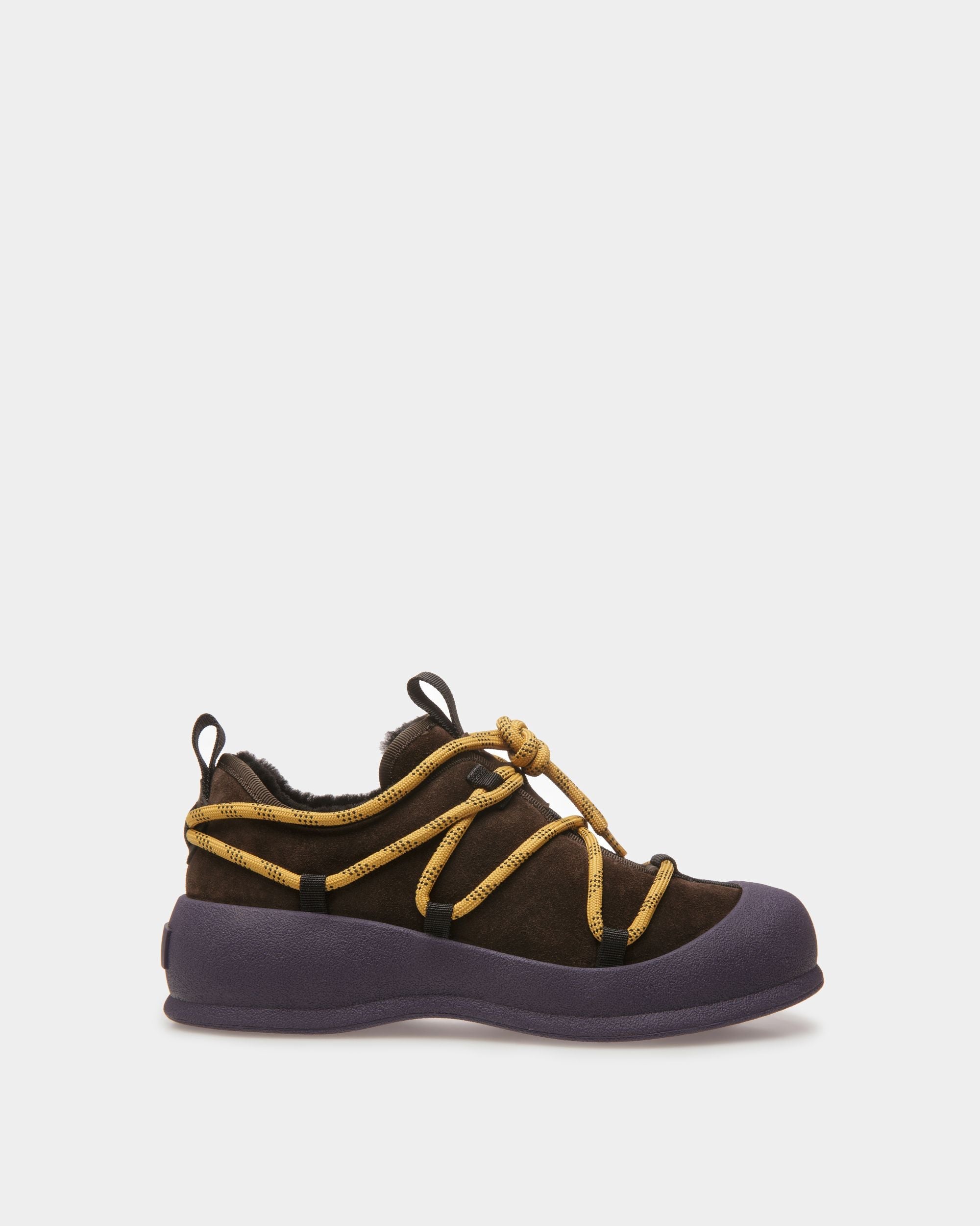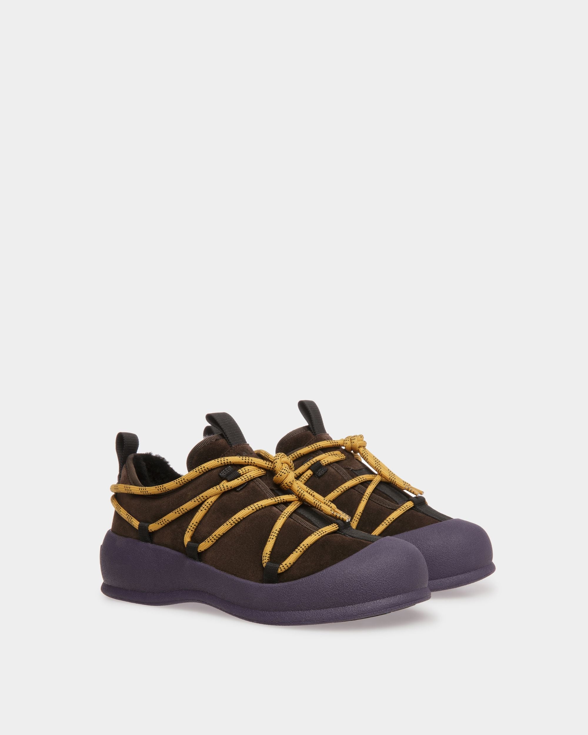 An orchid purple rubber sole complements the Corky Courma snow boots' deep brown suede upper. They slip on, with easy pull tabs, and can be tightened with the elasticated laces.