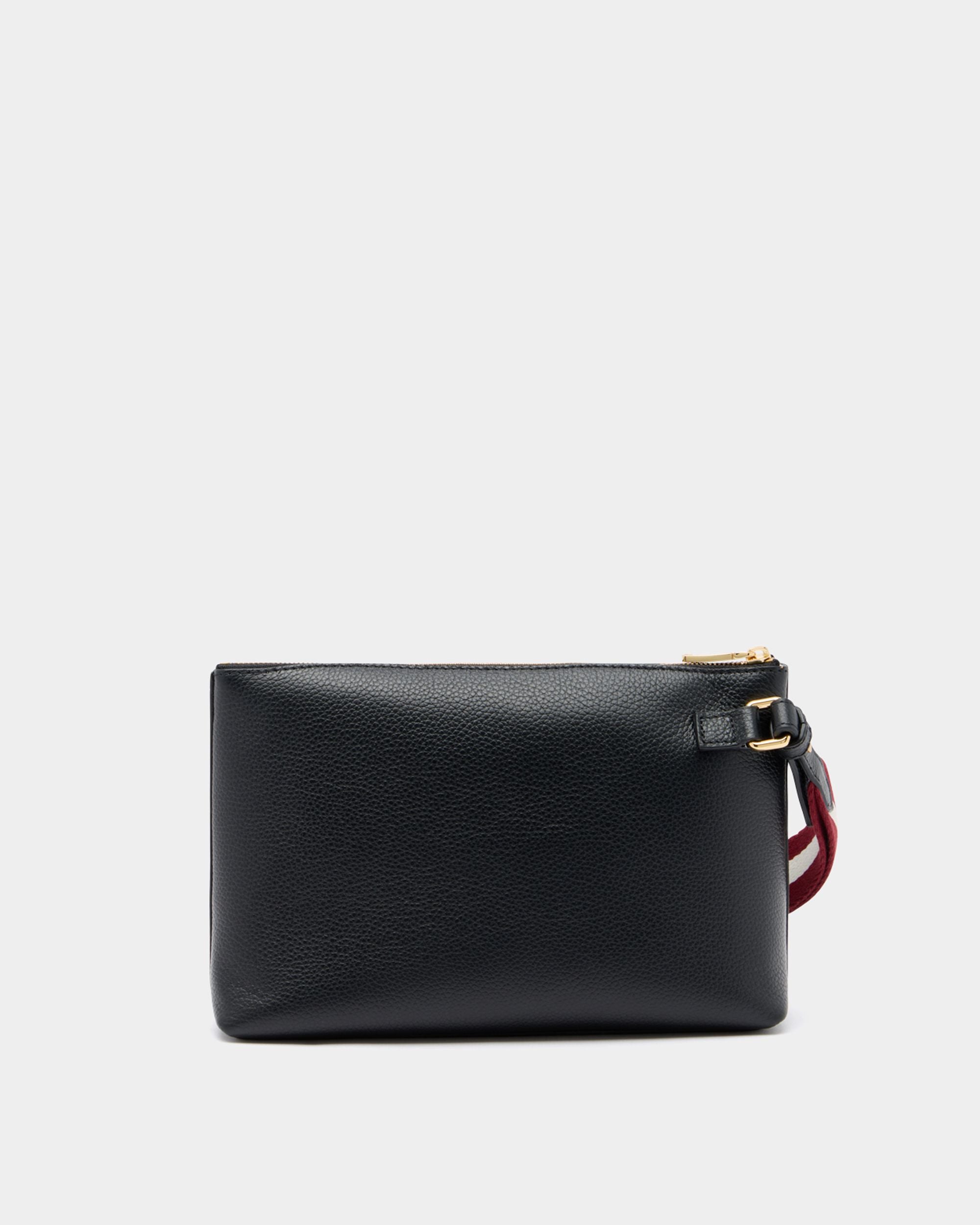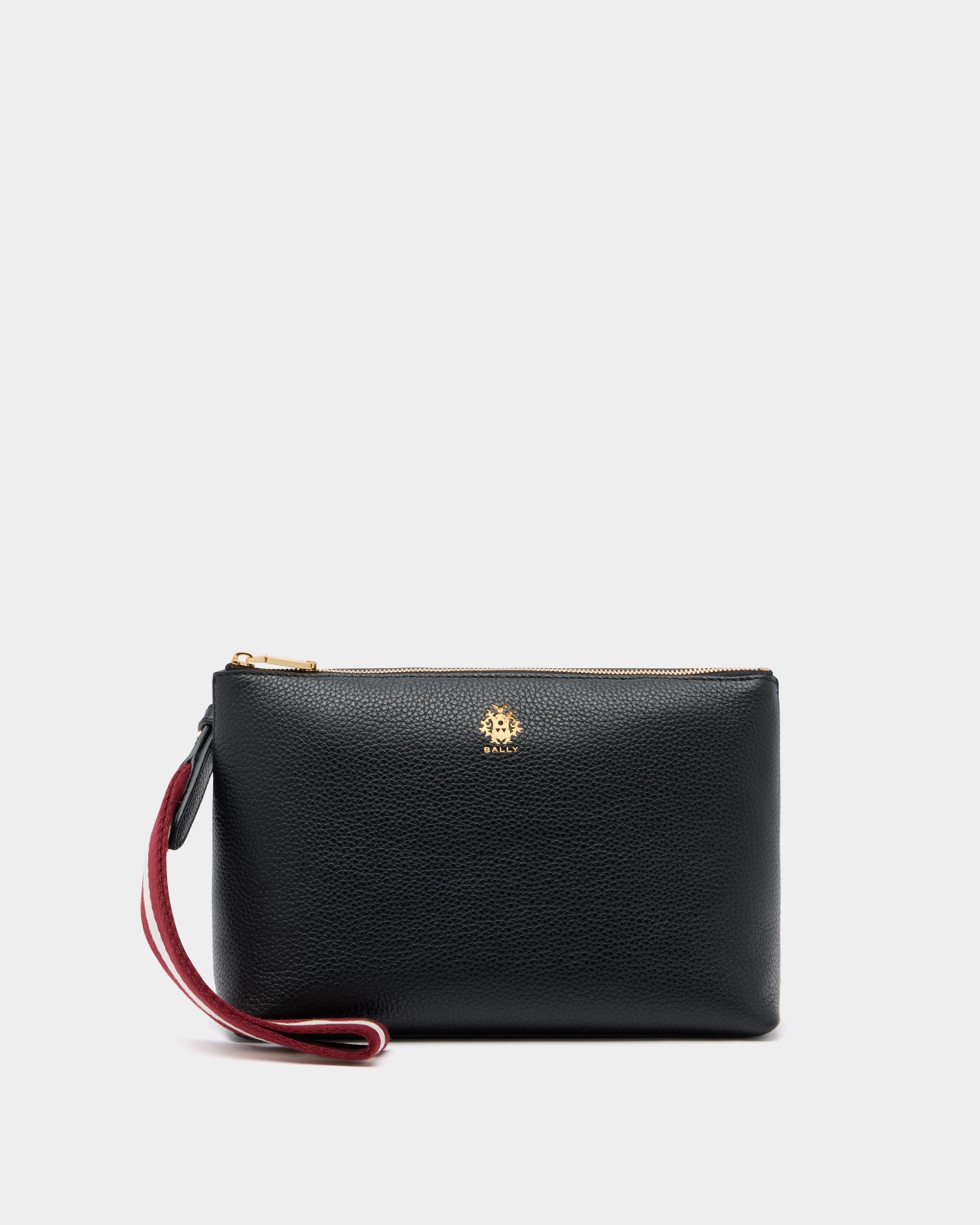 The Hera zipped pouch is crafted in black grained leather with a gold-tone Bally Crest to the front. The detachable wrist loop features the Bally Ribbon, a signifier of the brand's Swiss heritage.
