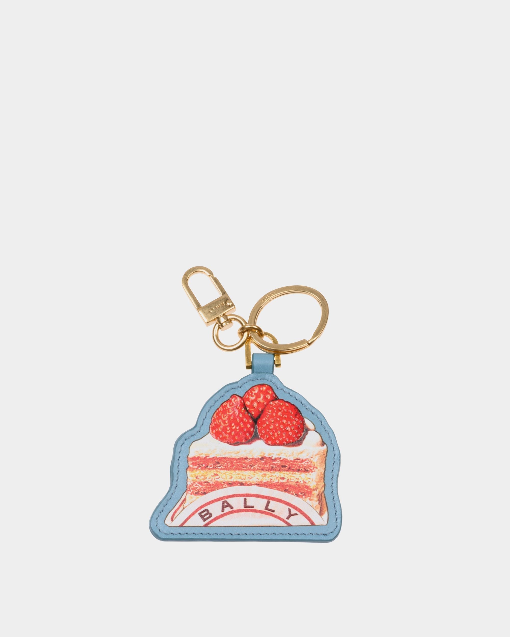 This keychain features a whimsical Bally Cake print set into medium blue leather. The key ring and claw clasp in hammered gold-tone metal are engraved with a Bally logo.