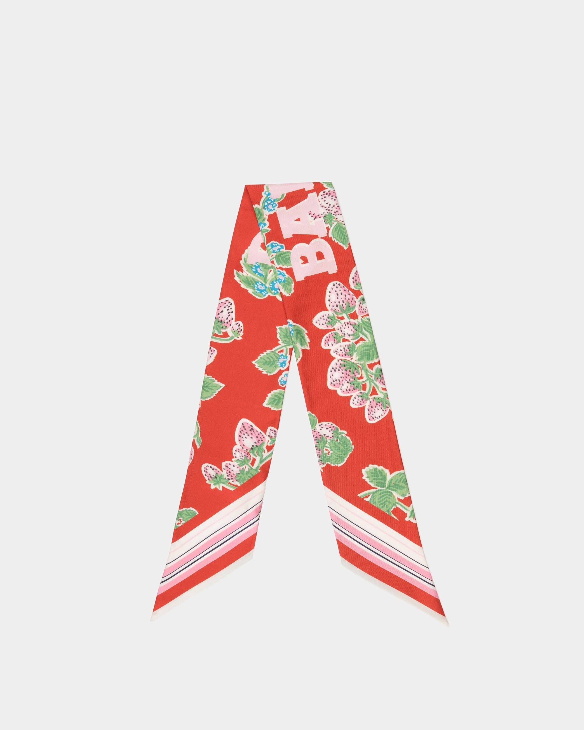 Silk scarf printed with a vintage-inspired Strawberry motif and a collegiate Bally logo. On-tone stripes trim the short edges.