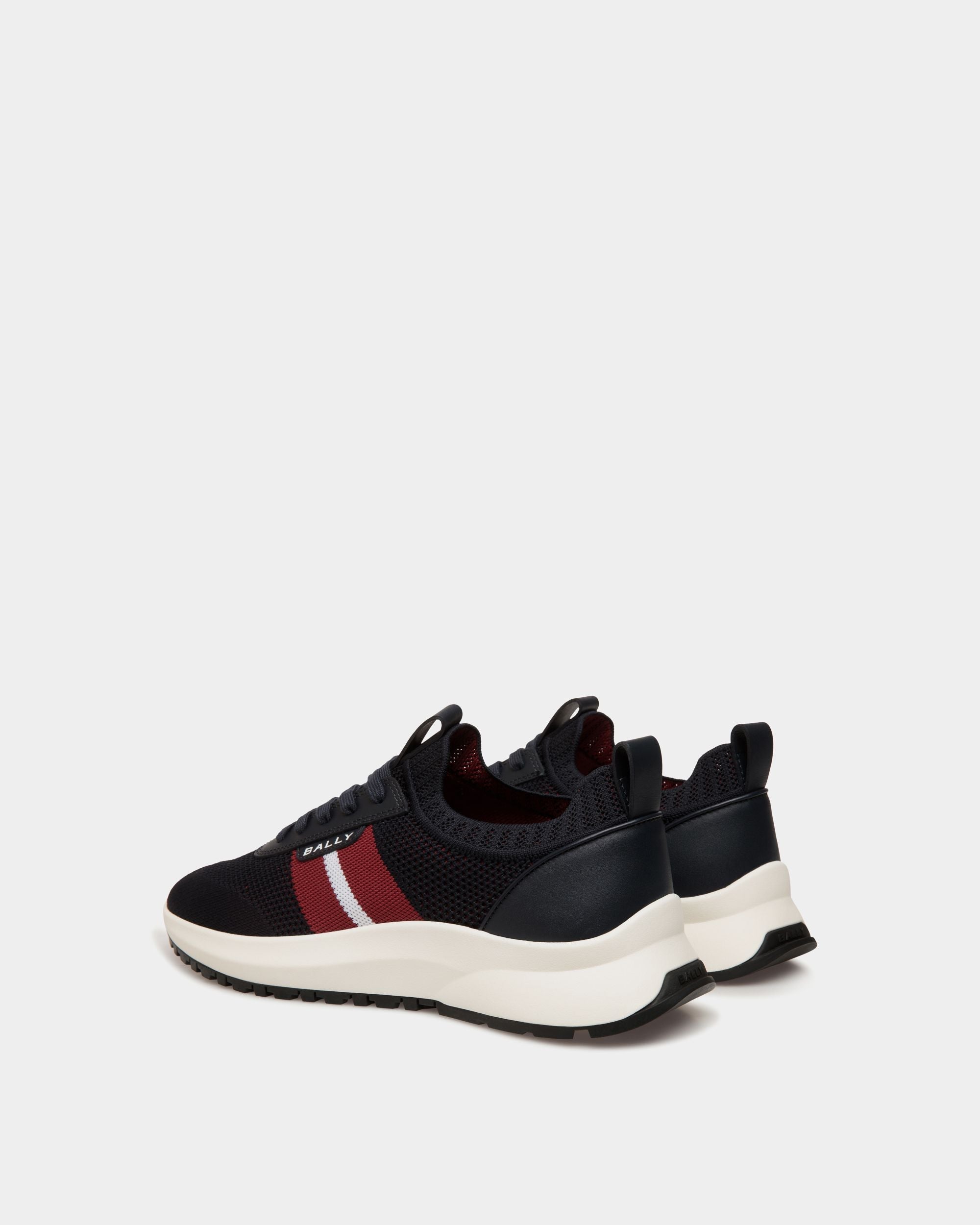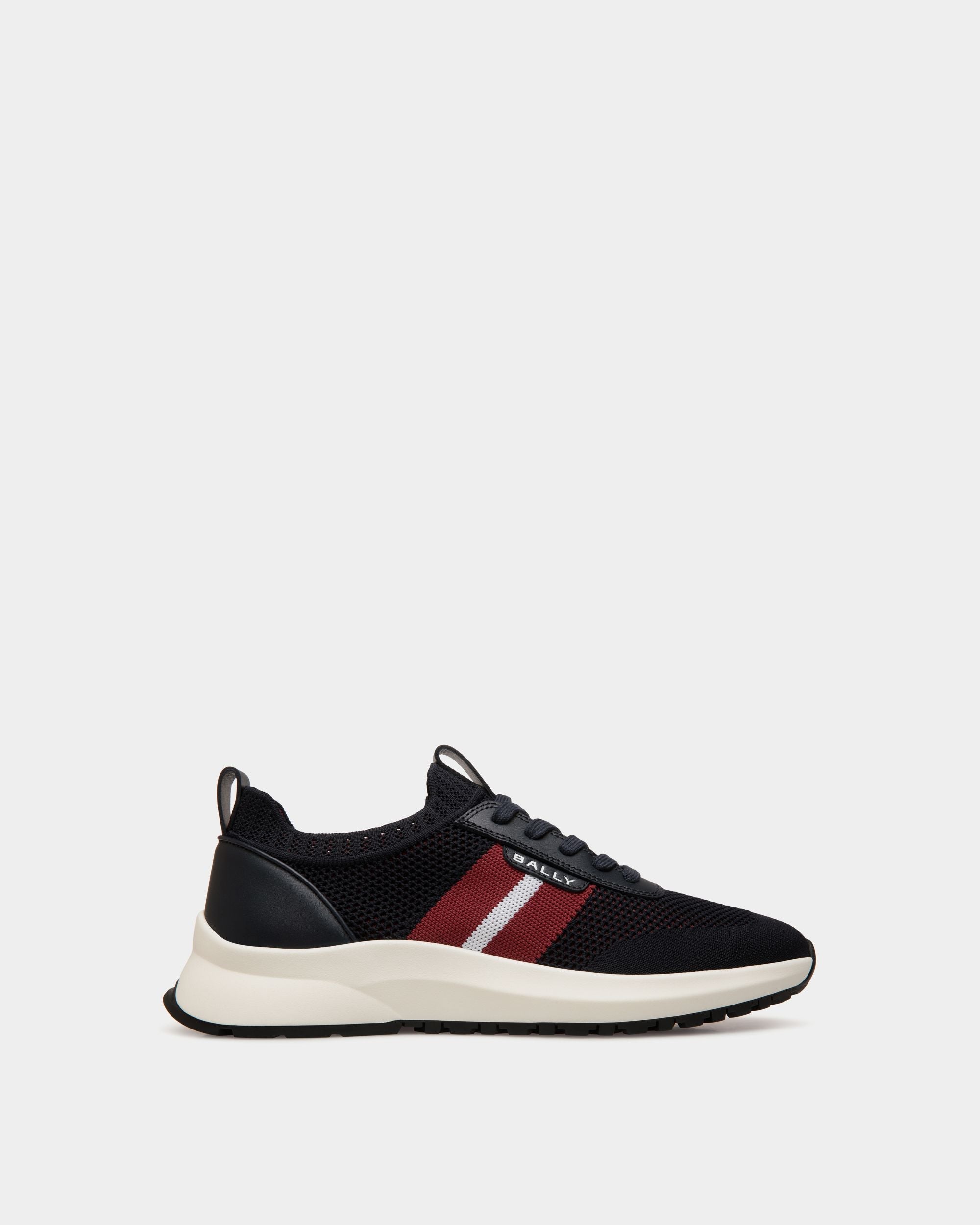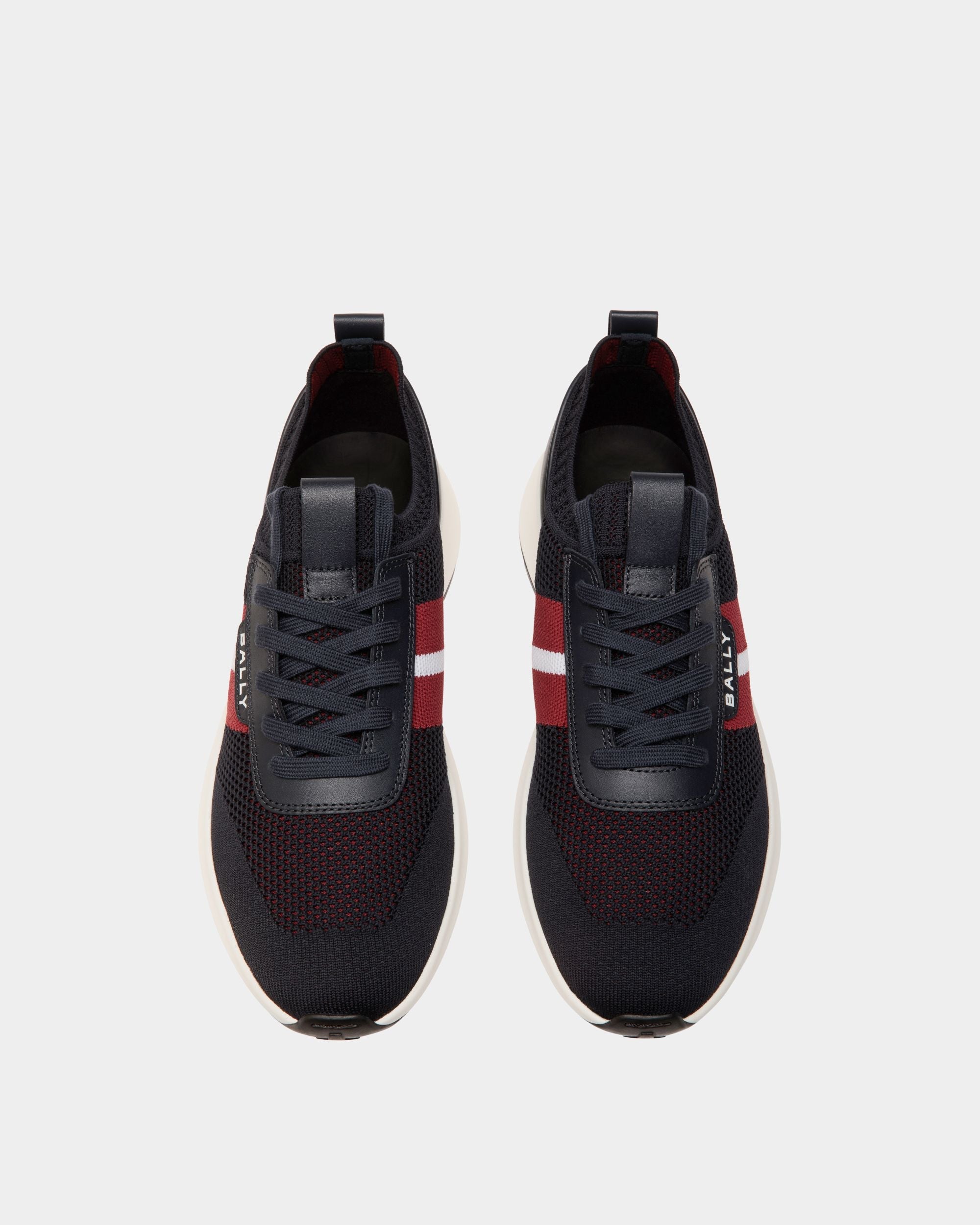 This slip-on Outline sneaker has a lightweight, breathable navy blue knit upper and a shock-absorbing sole in white rubber. A Bally Ribbon and logo embellish the side.