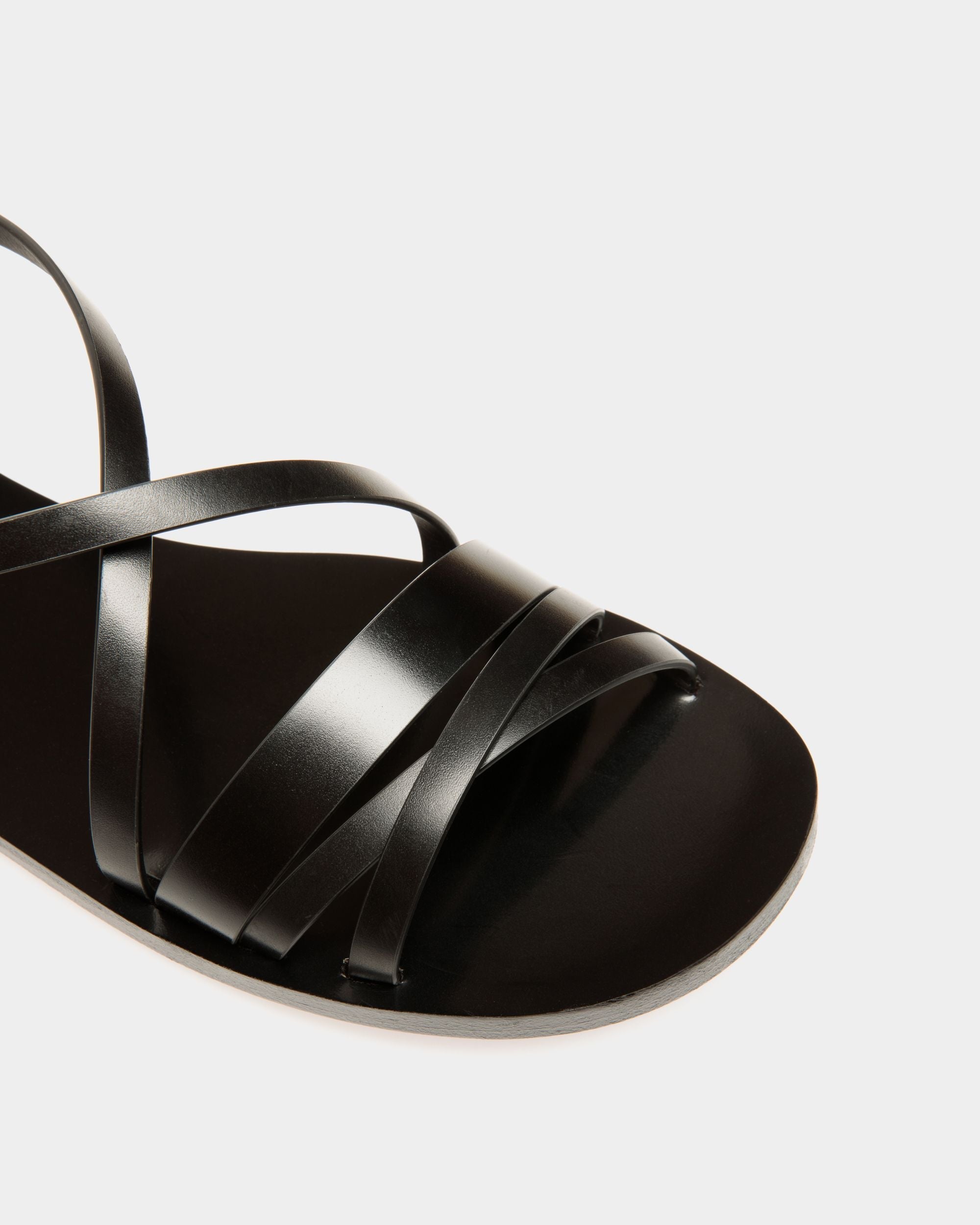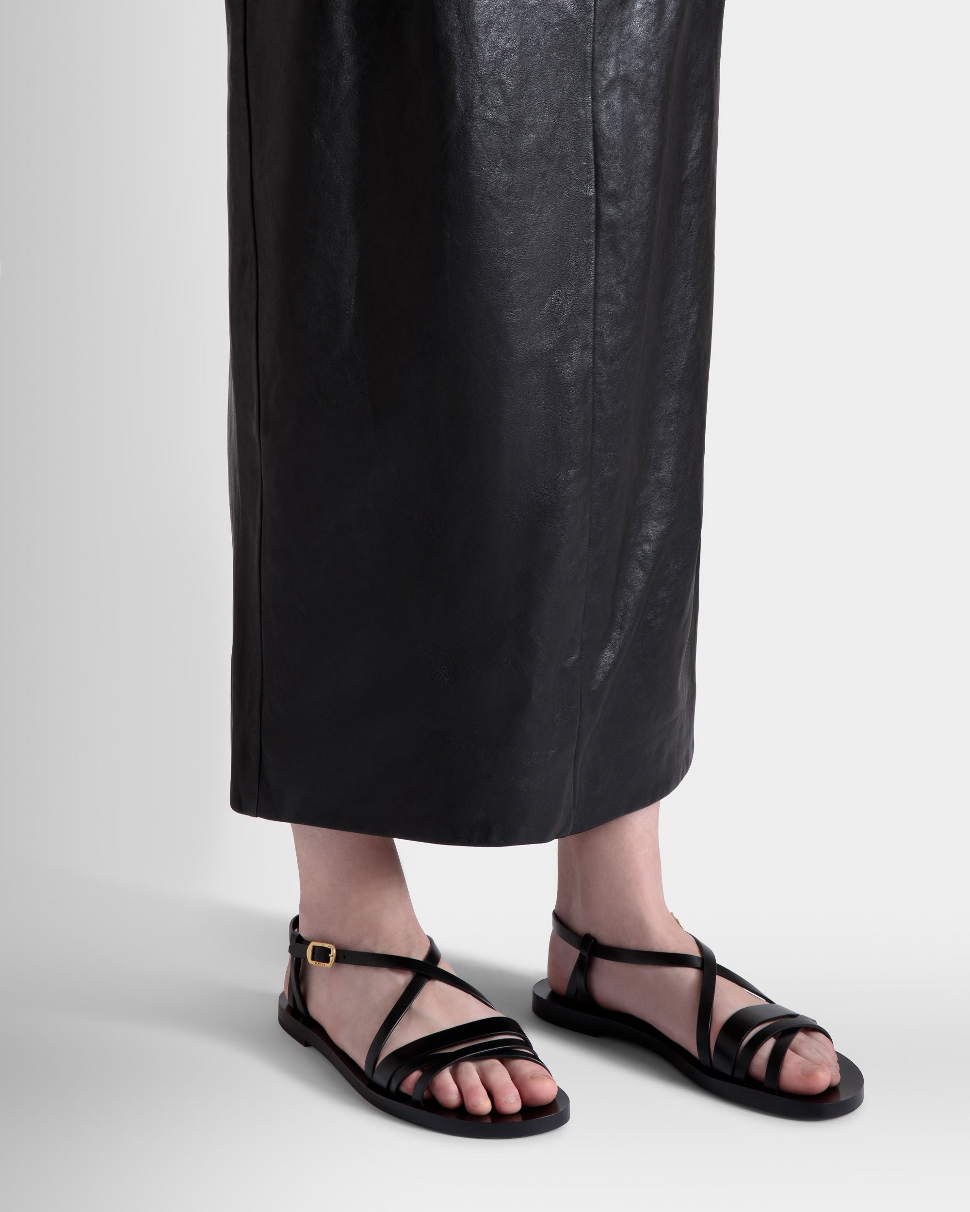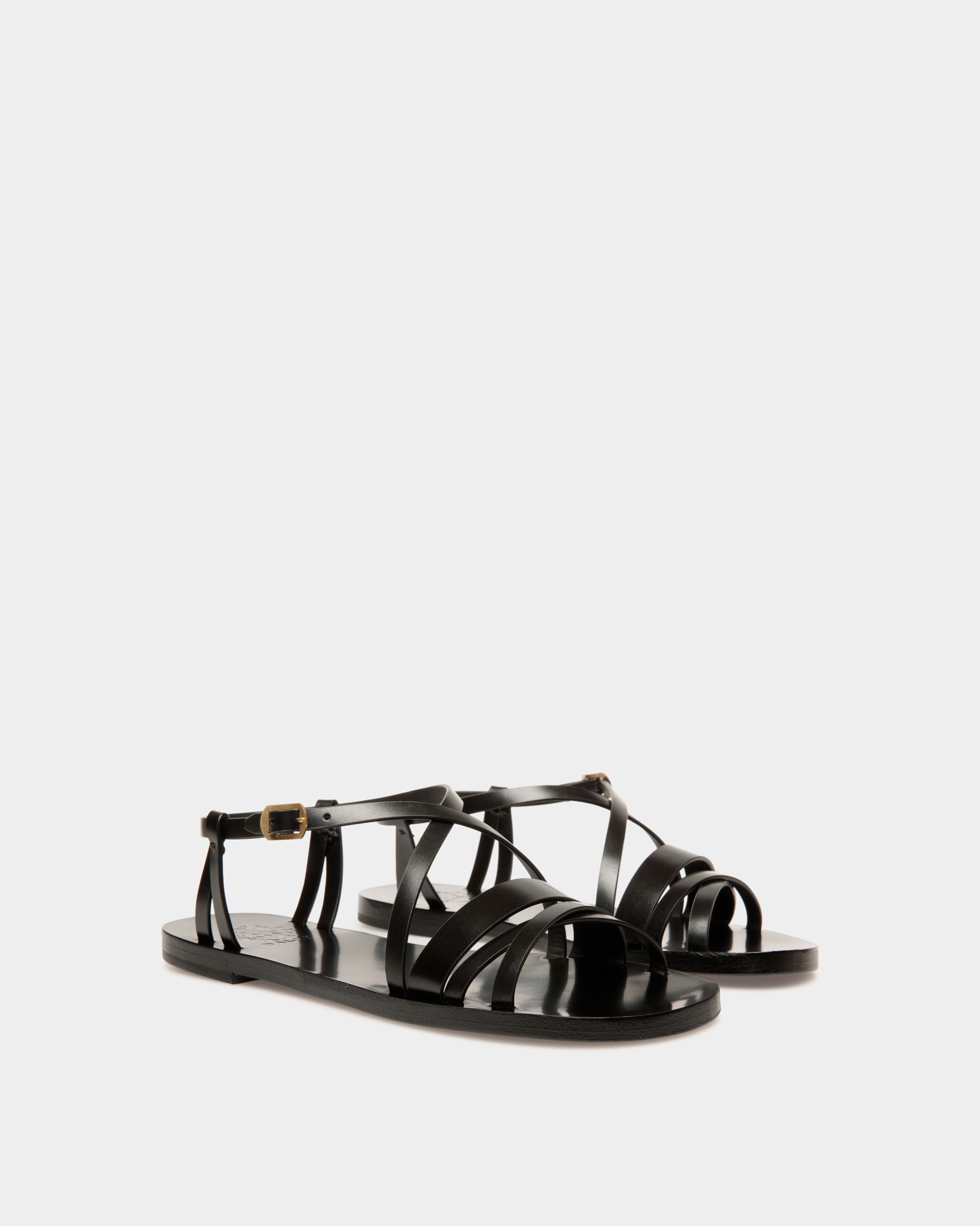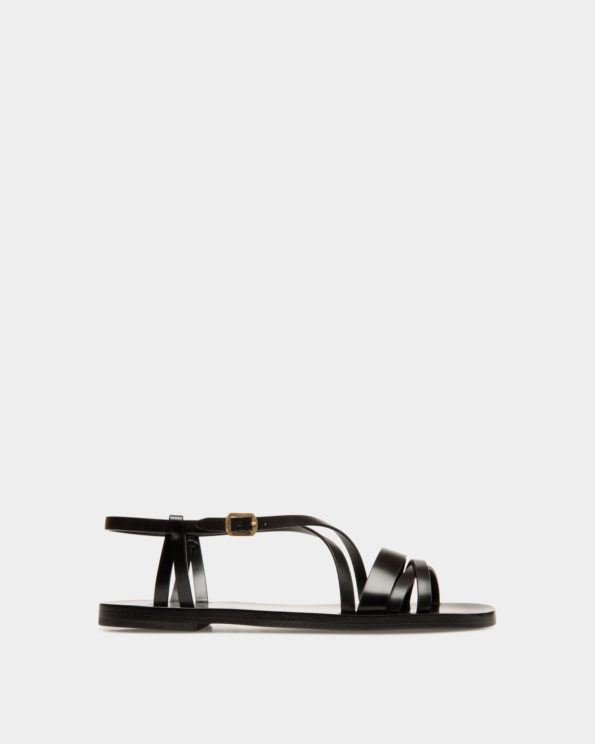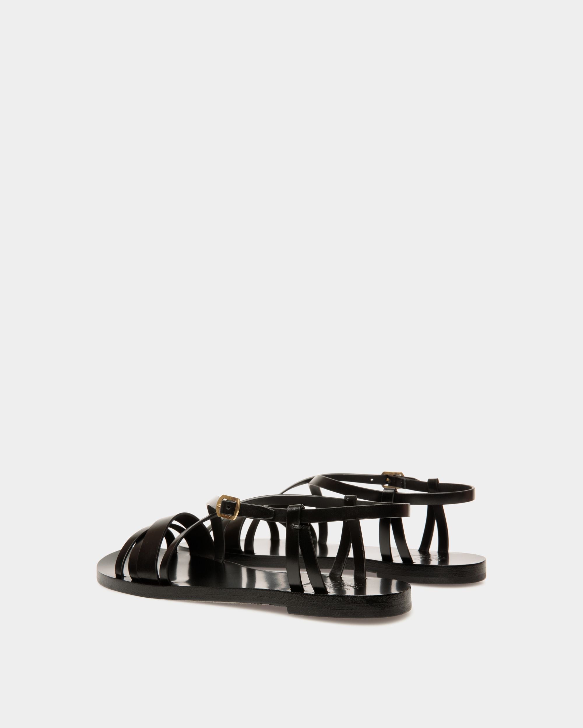 Featured on the FW24 Bally runway, the Salis sandal in black leather is embellished by a gold-tone metal buckle to fasten the ankle strap. Raw cut and without seams, the edges are waxed for a pared-back aesthetic.