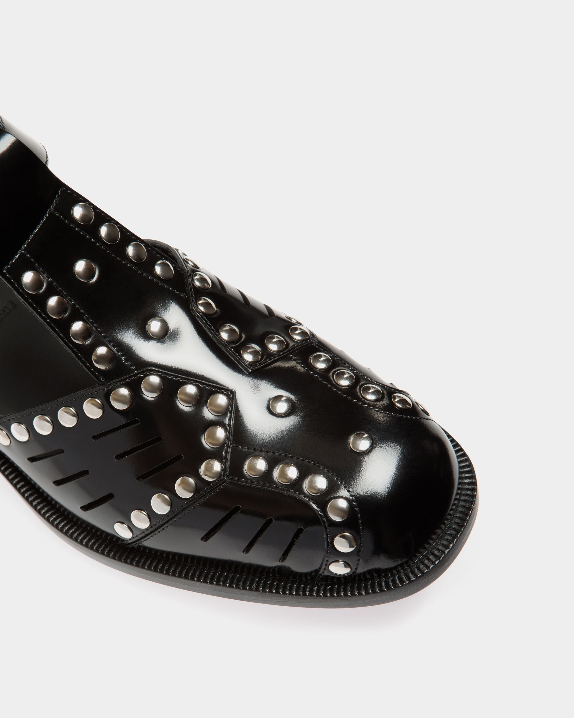 Inspired by an archival sandal from 1945, this Spiegel flat features an upper in polished black leather decorated with palladium-hue studs and meticulous openwork. A buckle sits to the side of the t-strap, engraved with a Bally logo.