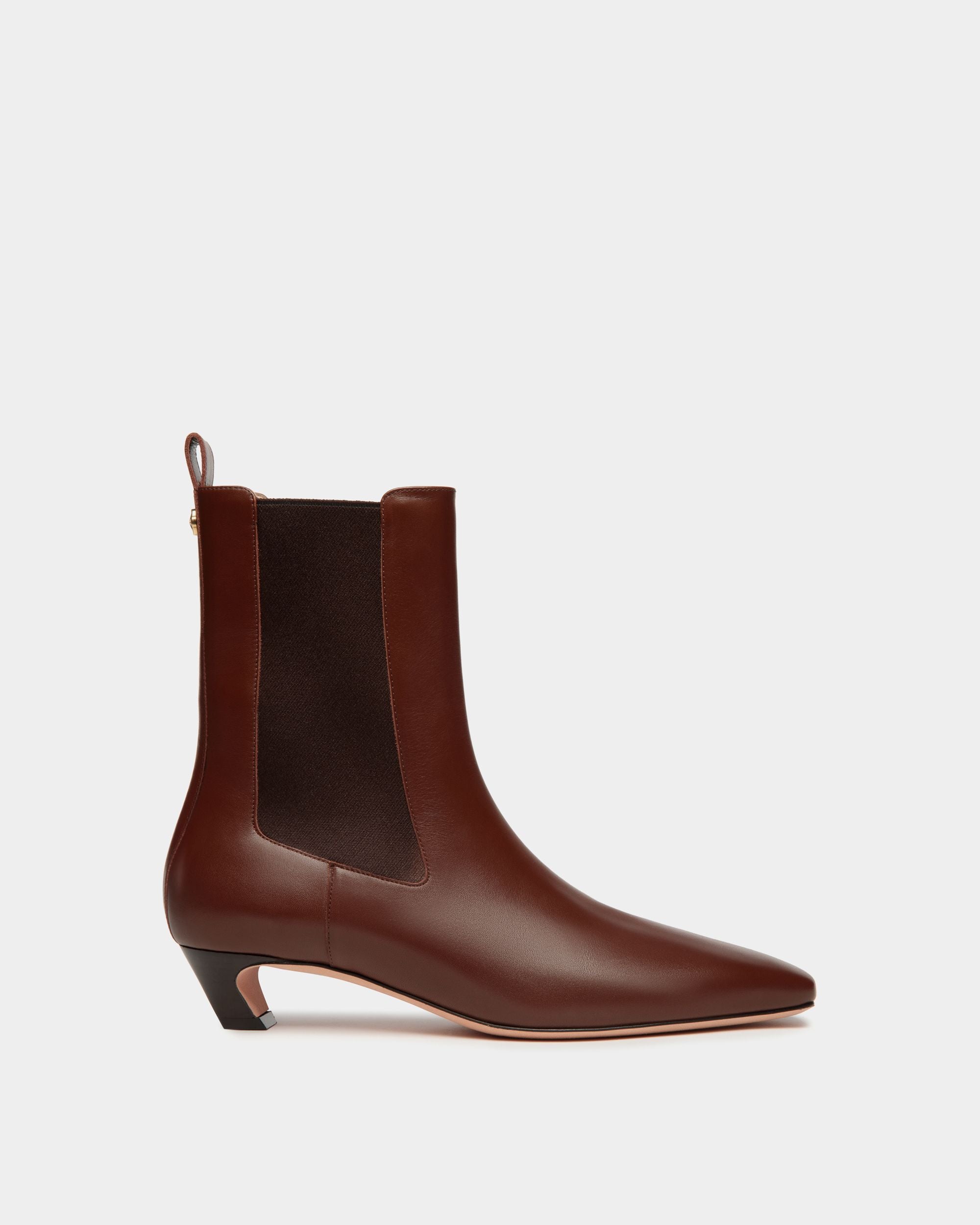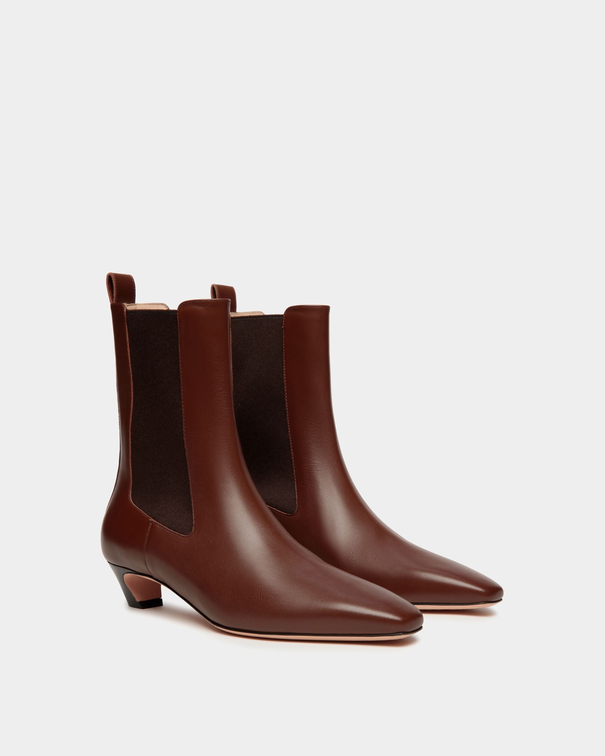 Sleek style distinguishes this Sylt bootie in fine calfskin with a slightly curved heel for a hint of retro allure. Elasticated panels at the ankles and a pull tab with a mini gold-tone Bally Emblem ensure comfort and ease of wear.