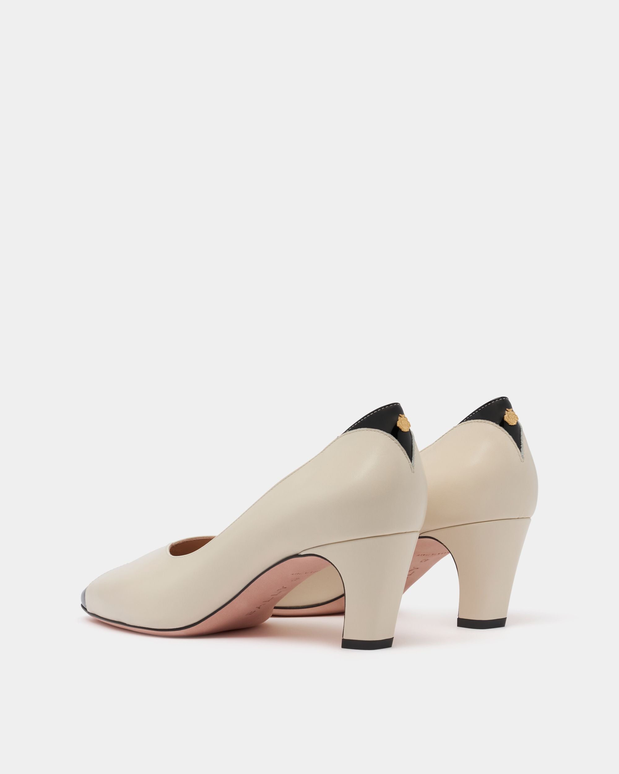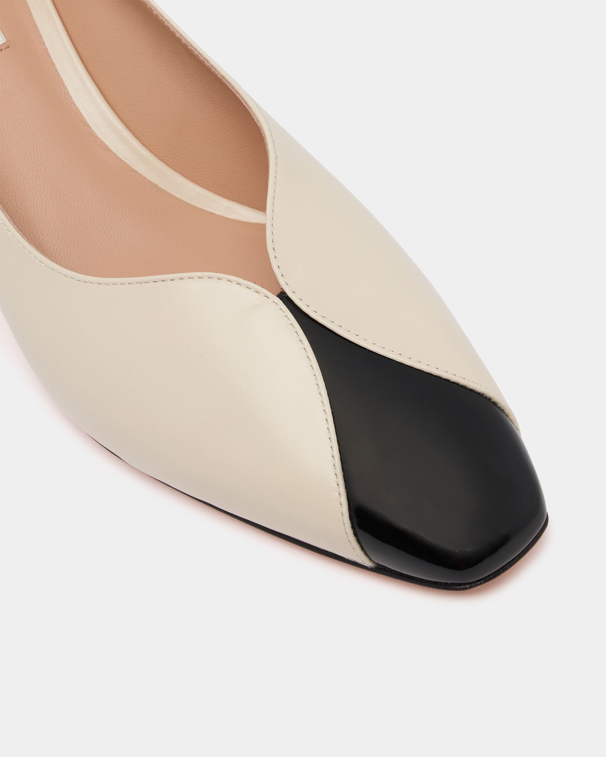 This Sylt pump is characterized by the refined interplay of matte white leather and black leather cut-away details on the delicate square toe and above the elegantly curved heel.
