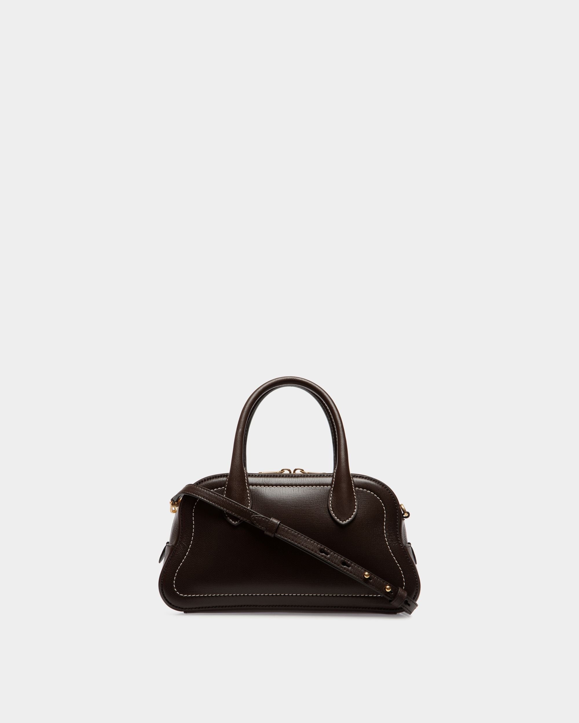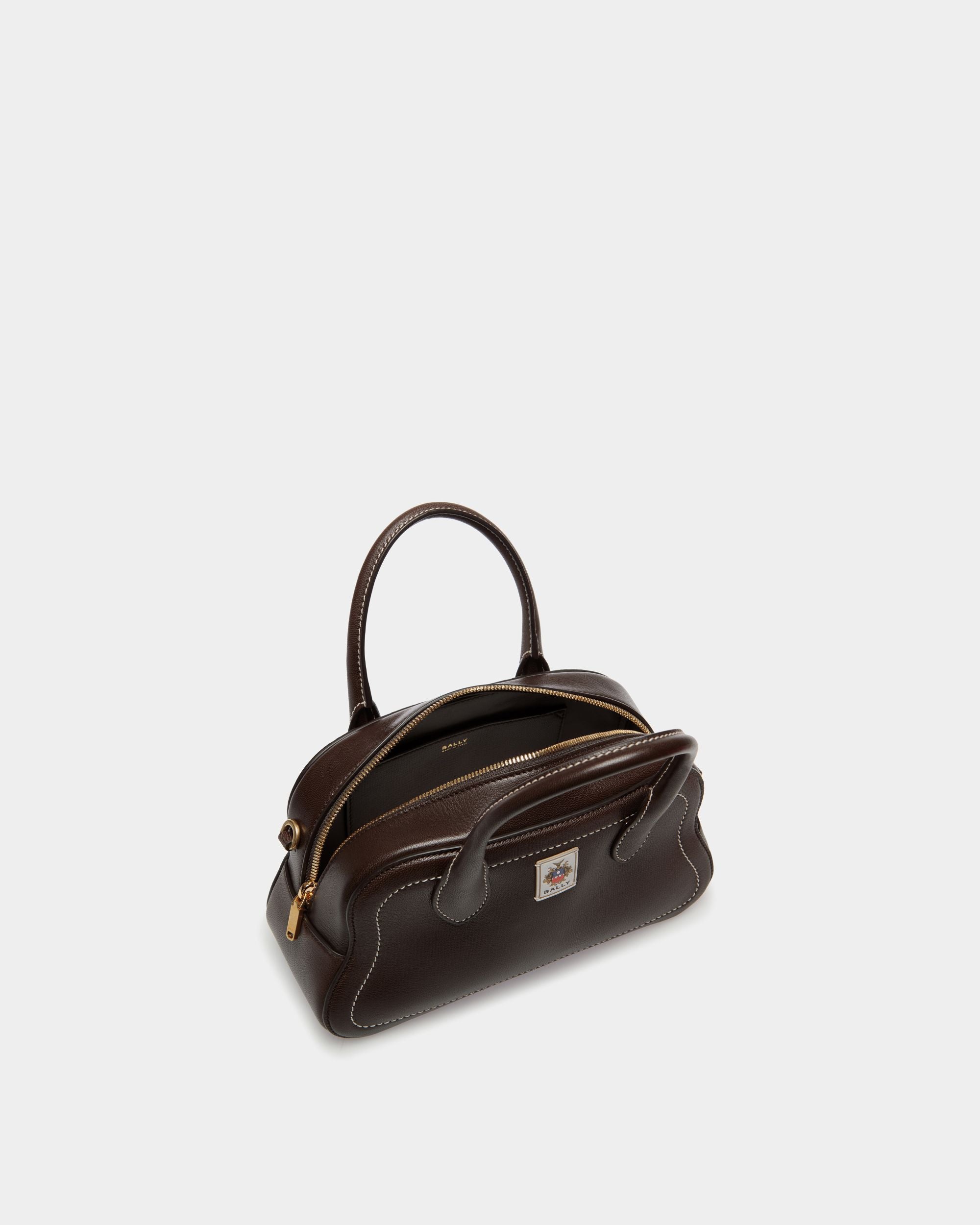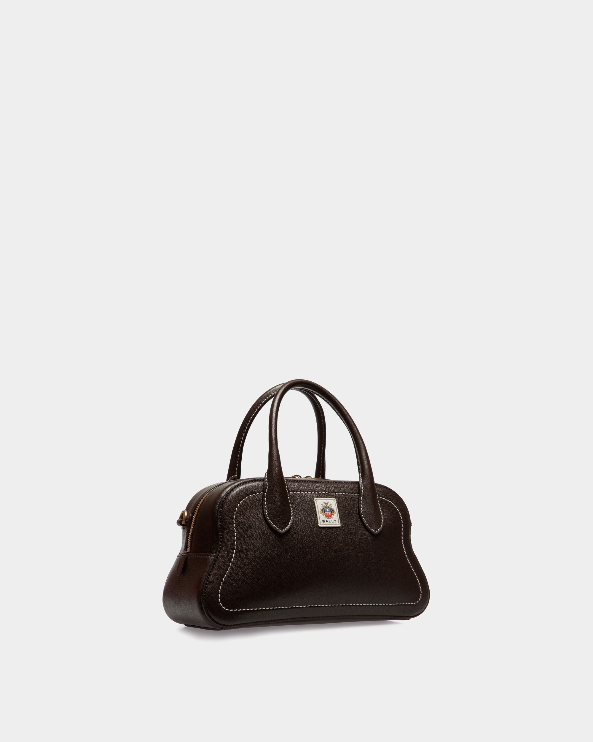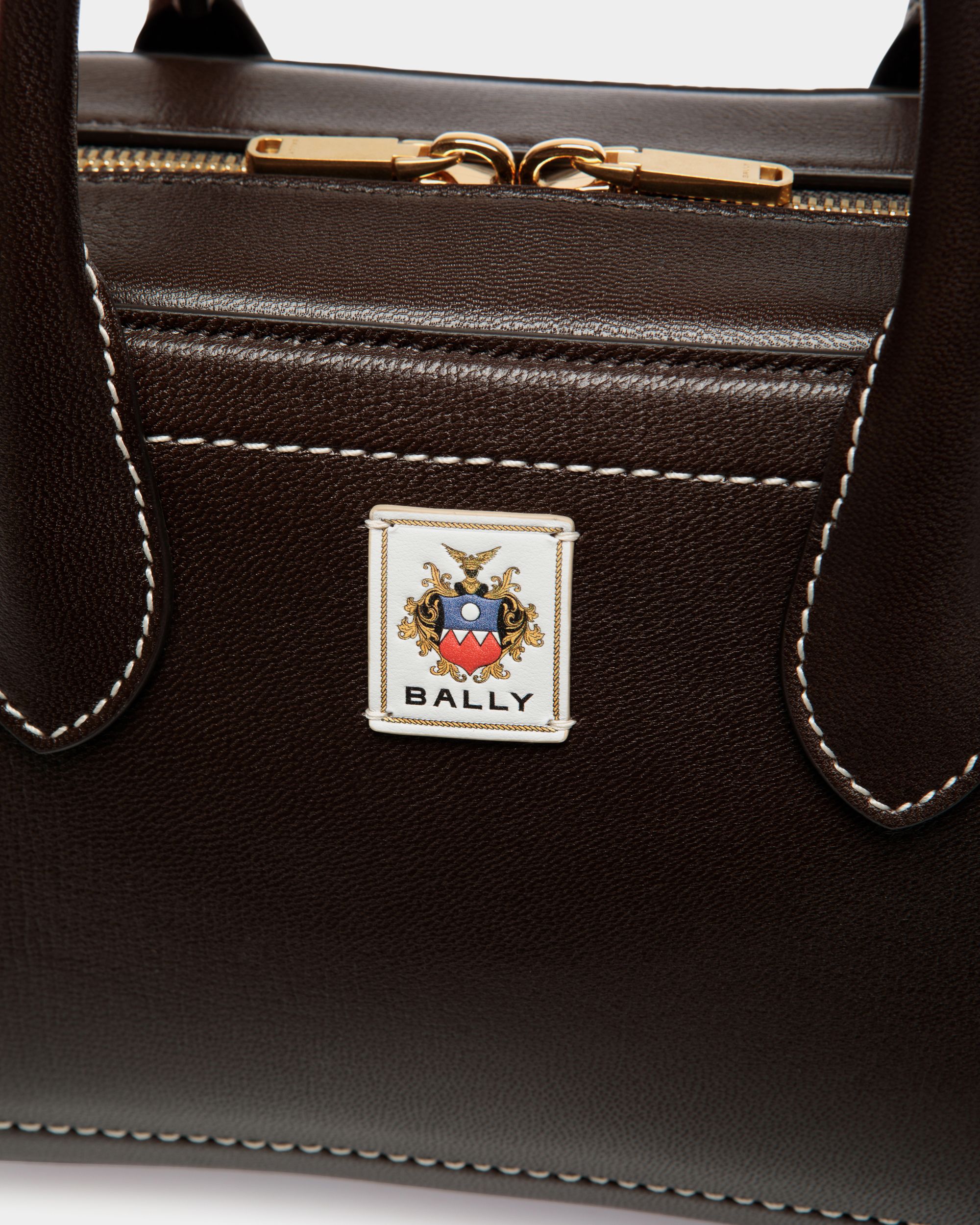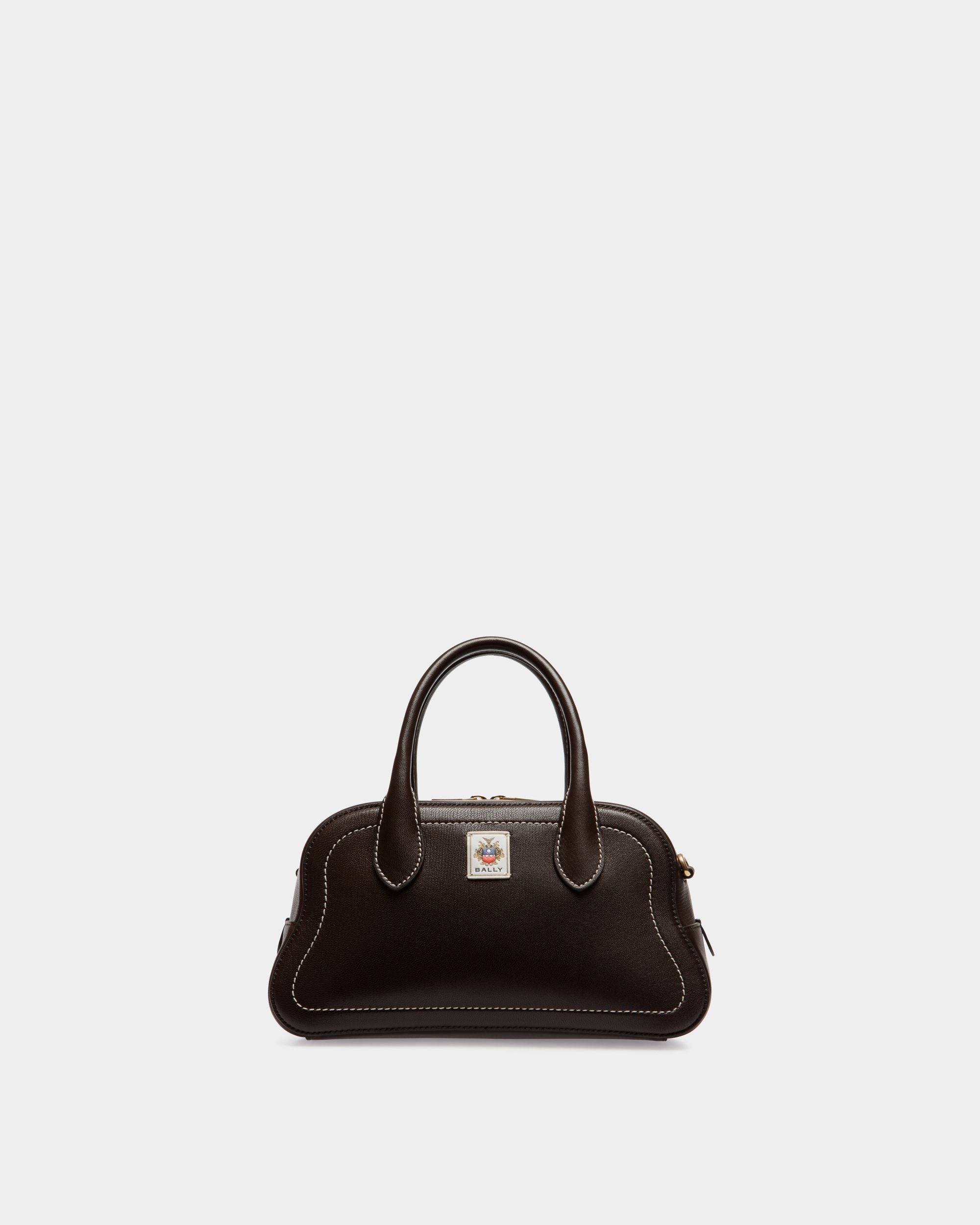 The Unda top handle bag has a softly rounded trapezoid silhouette in Ebano kidskin with a grained finish. A Bally Crest patch in leather embellishes the front.