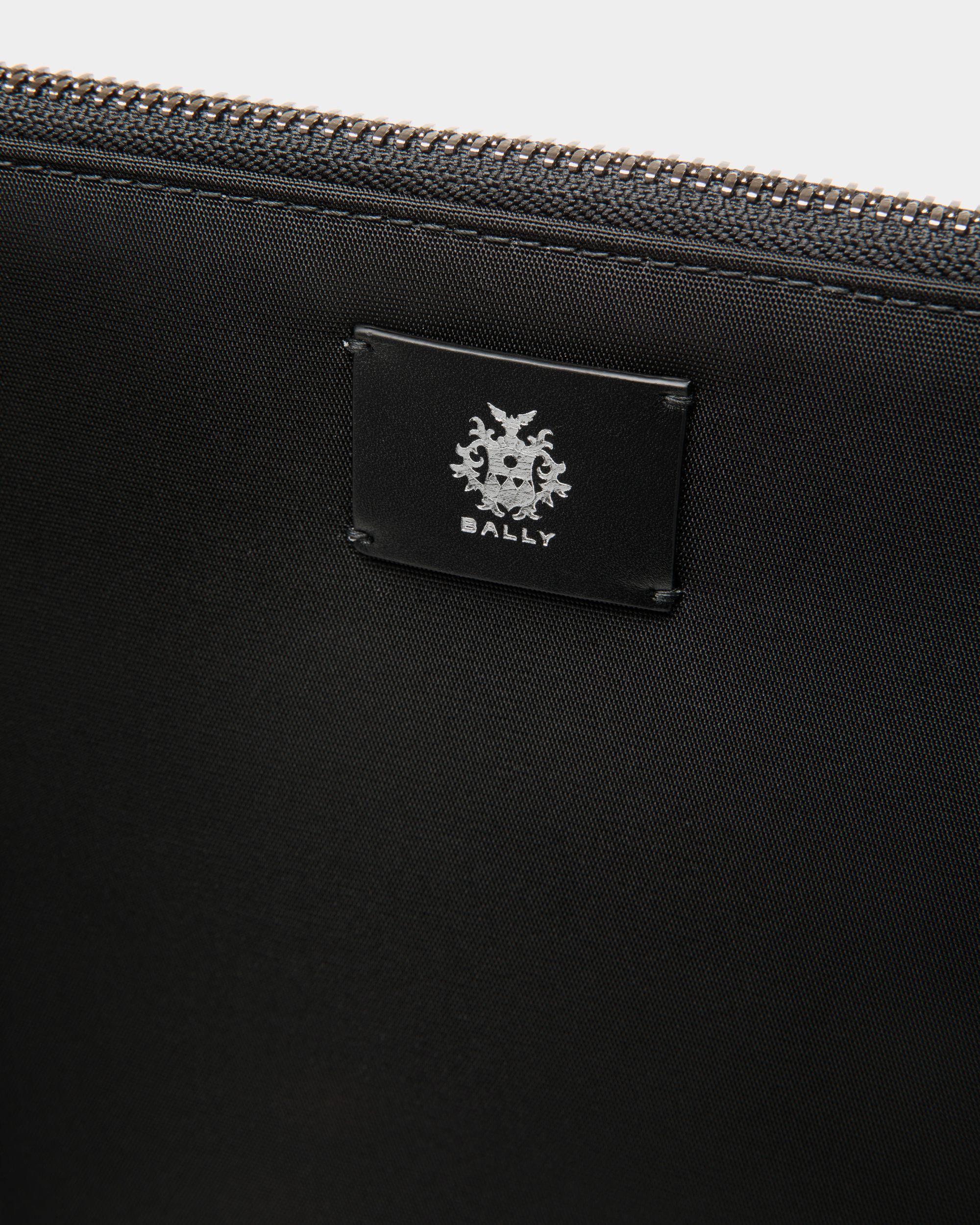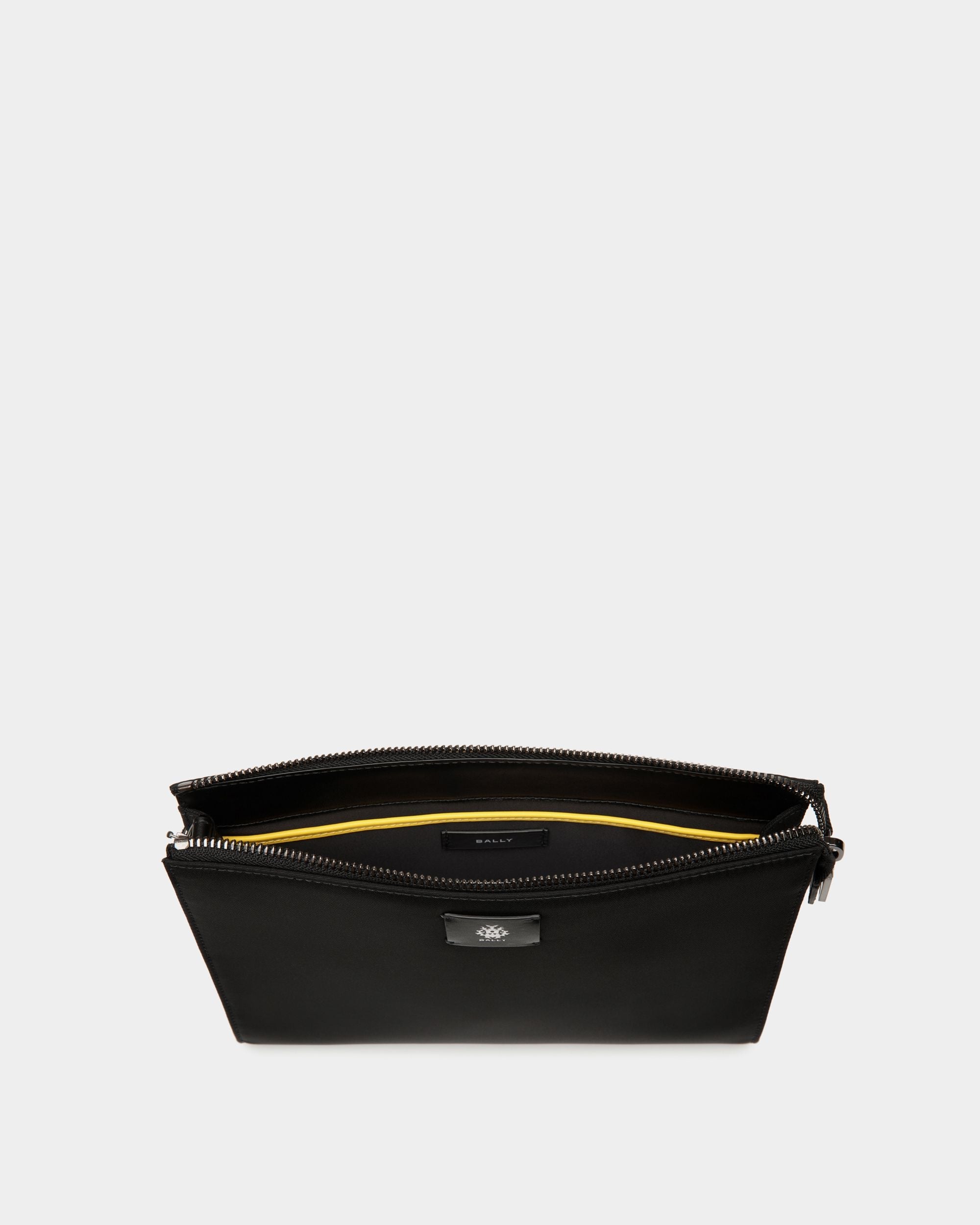 In black nylon with leather trim, this Adrien Brody Travel Collection pouch opens at the top to reveal a pop of yellow on the inner pocket.