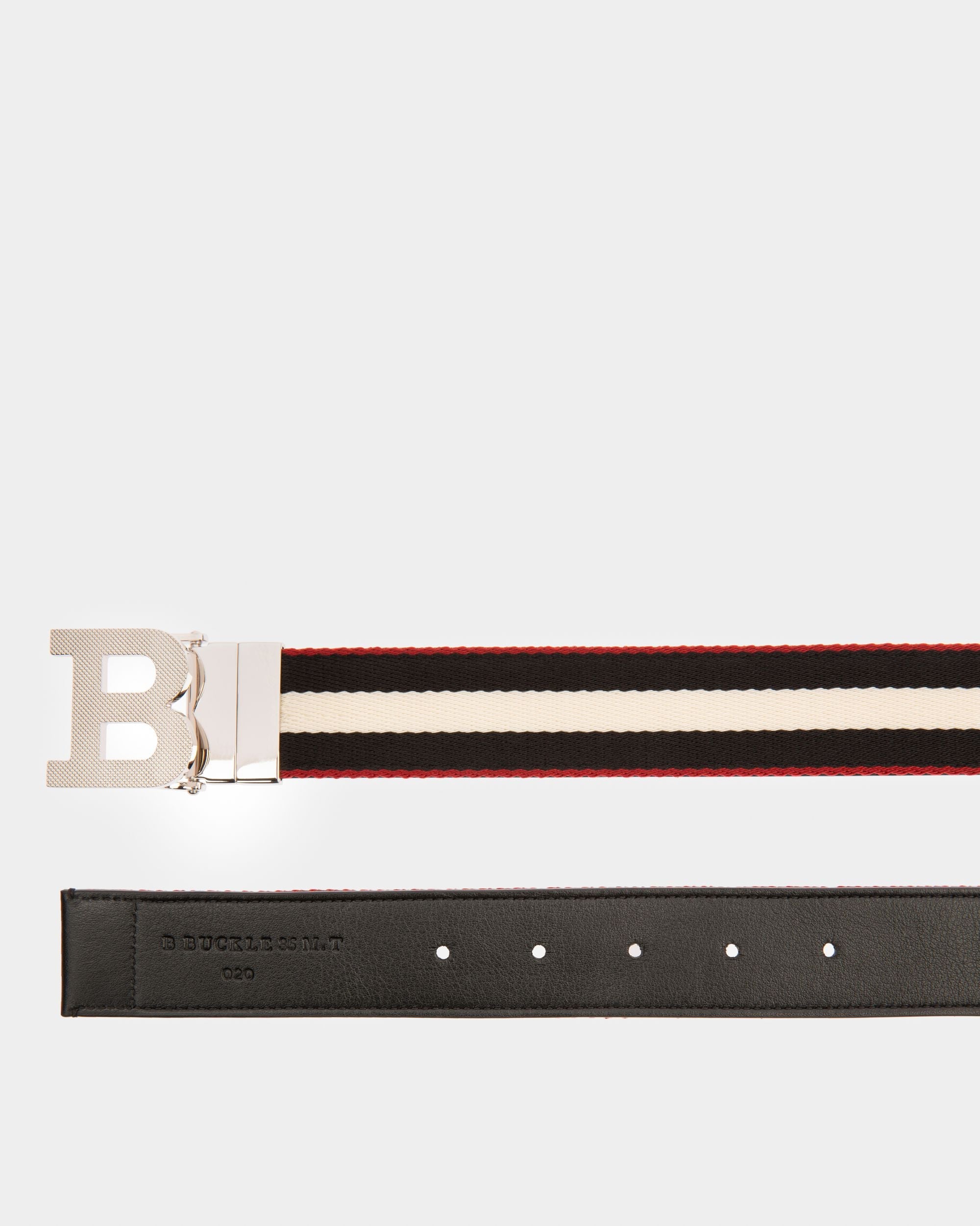 With a reversible style, the B Buckle belt is made from a synthetic fabric with Bally Stripe detailing and solid black on the reverse. A B buckle in silver-tone metal sits to the front.
