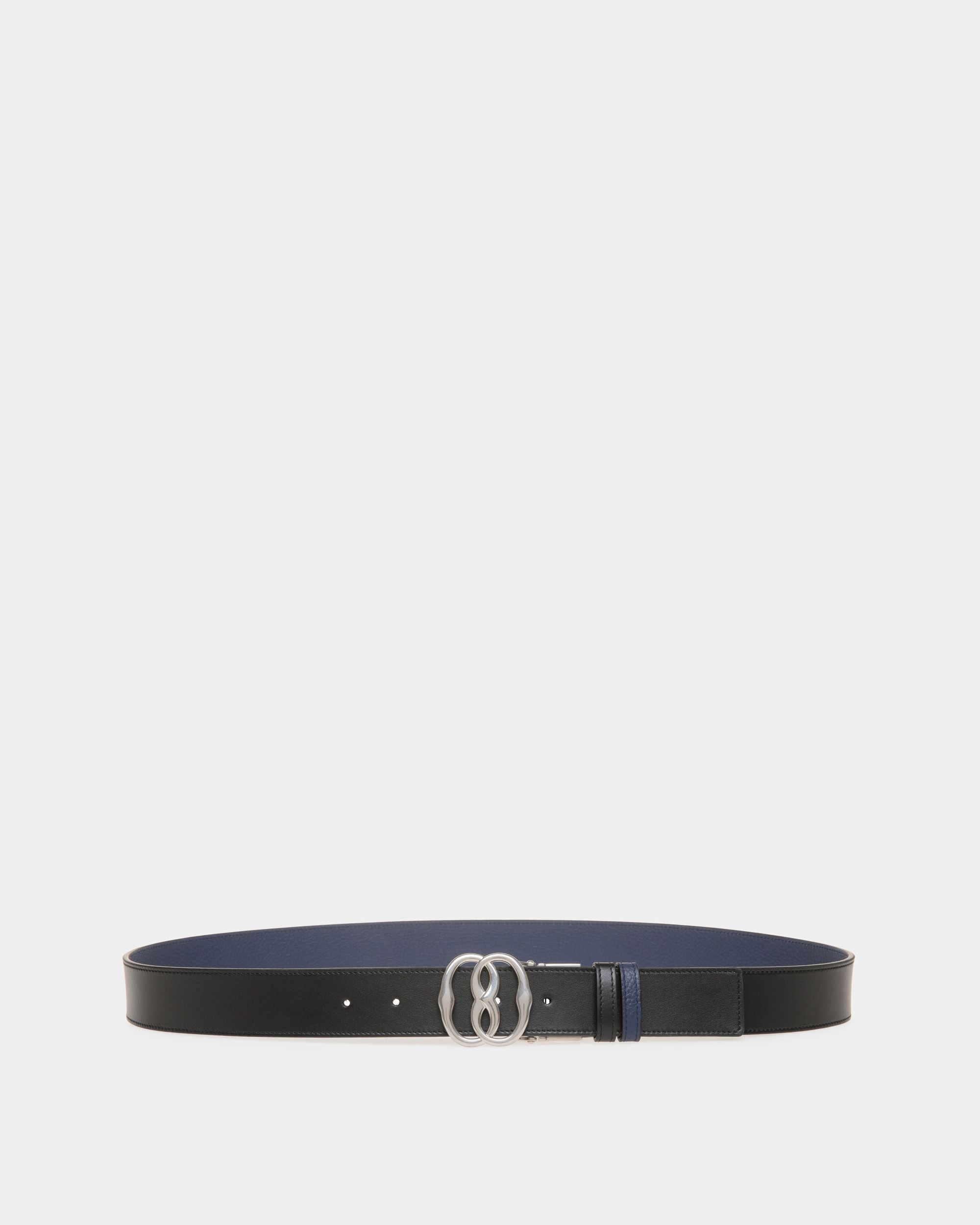 A silver-tone metallic buckle sits to the front of this reversible and adjustable belt style. One side sees smooth black leather, the other a grained texture.