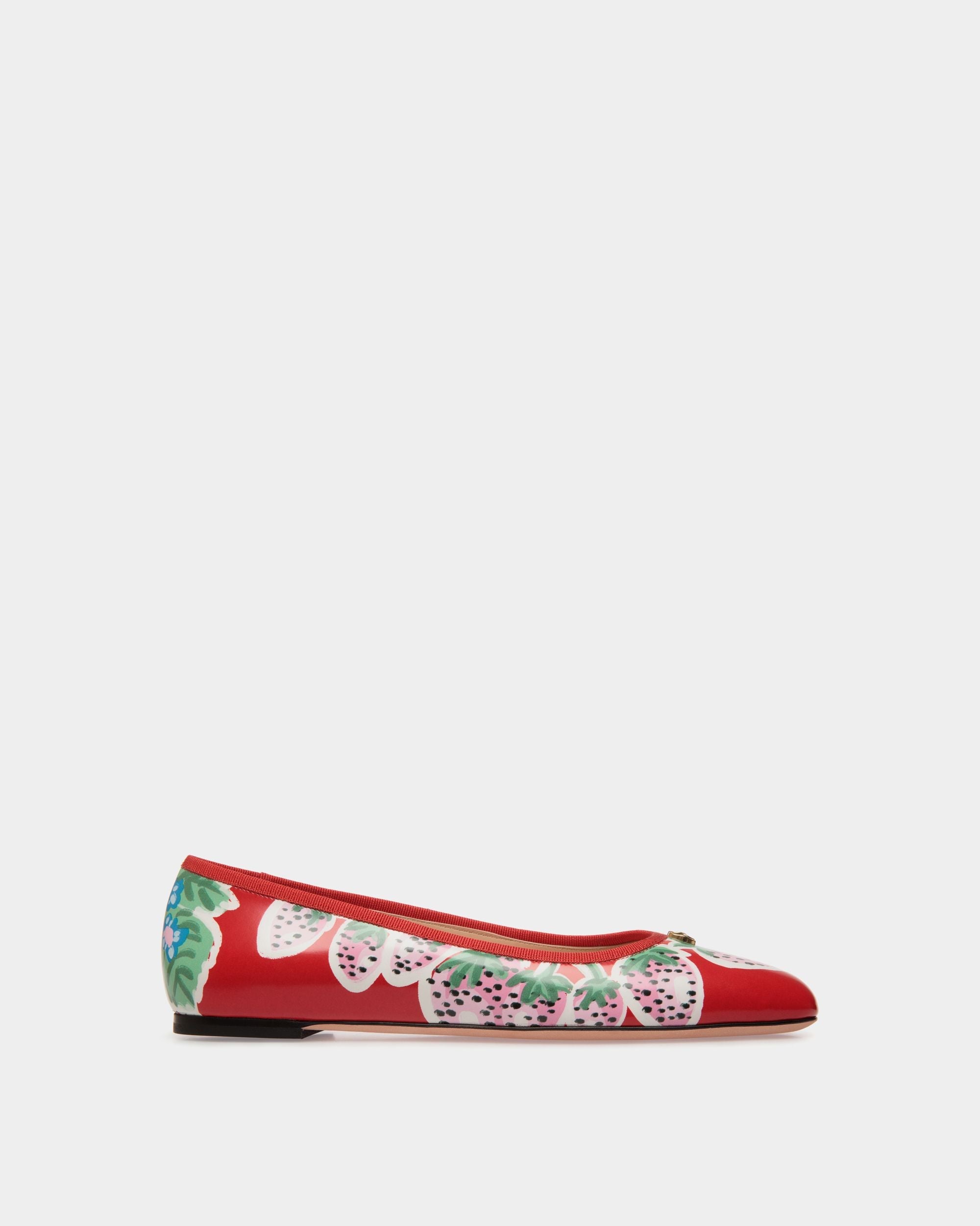 Playfully styled with a fresh Strawberry print, the Ballyrina flat in red brushed leather encapsulates Bally savoir-faire as it juxtaposes modernity and heritage. A delicate gold-tone Bally emblem sits to the top.