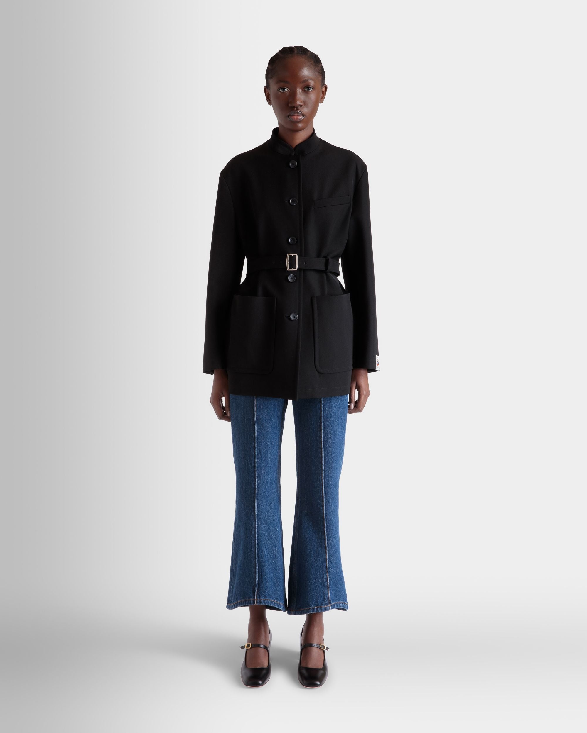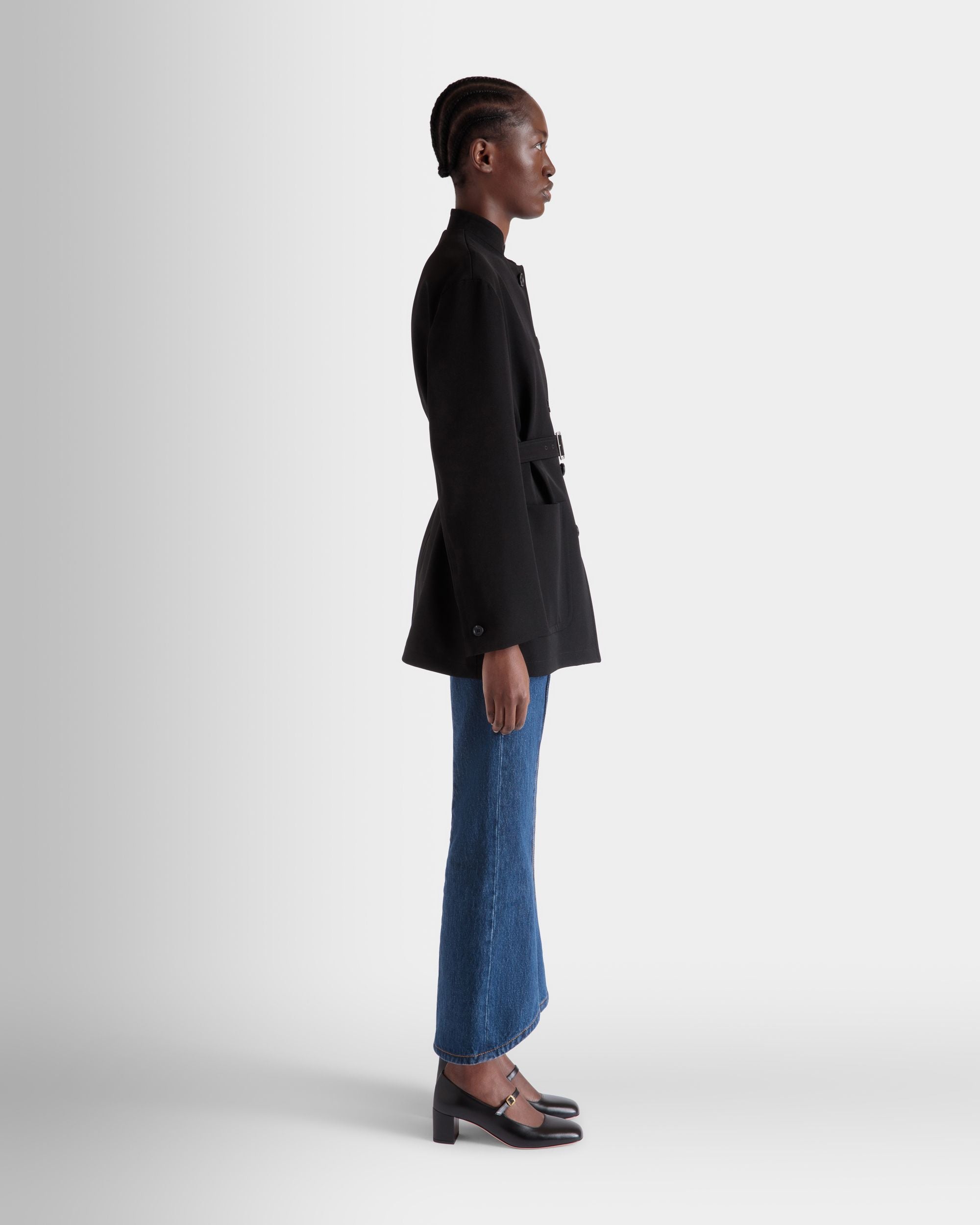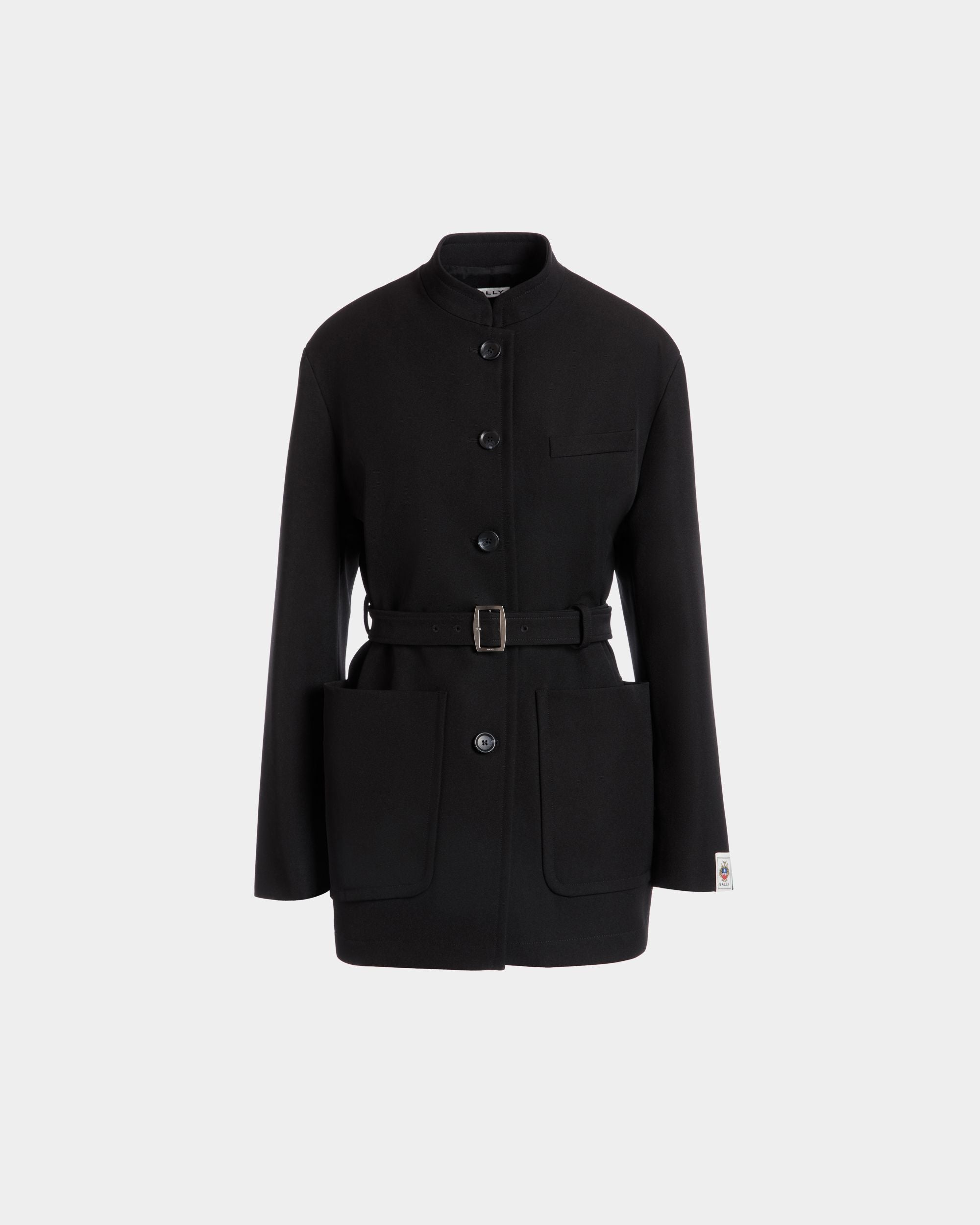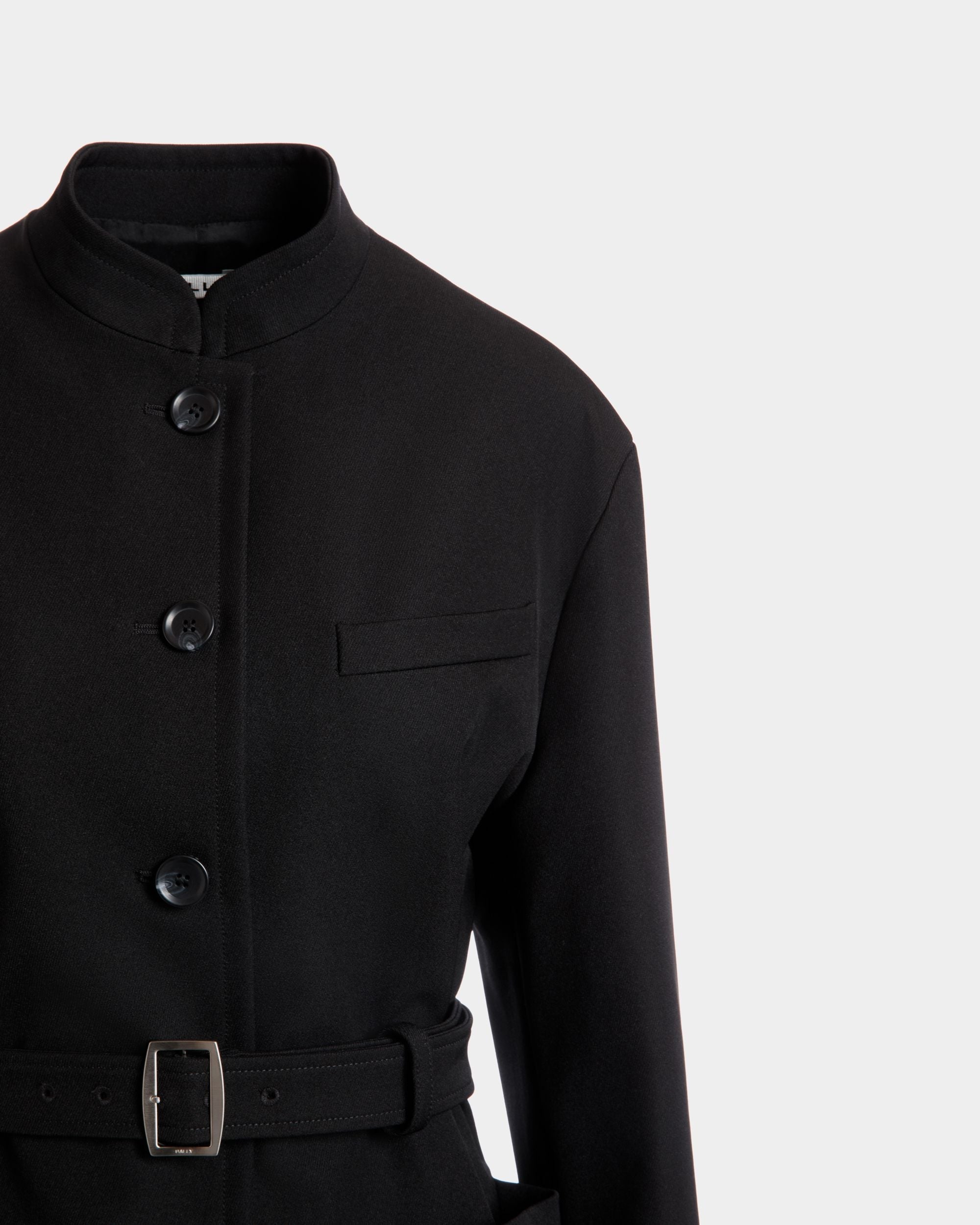 In black nylon gabardine, this mandarin-collar jacket features a belt to adjust the silhouette and large pouch pockets on the front.