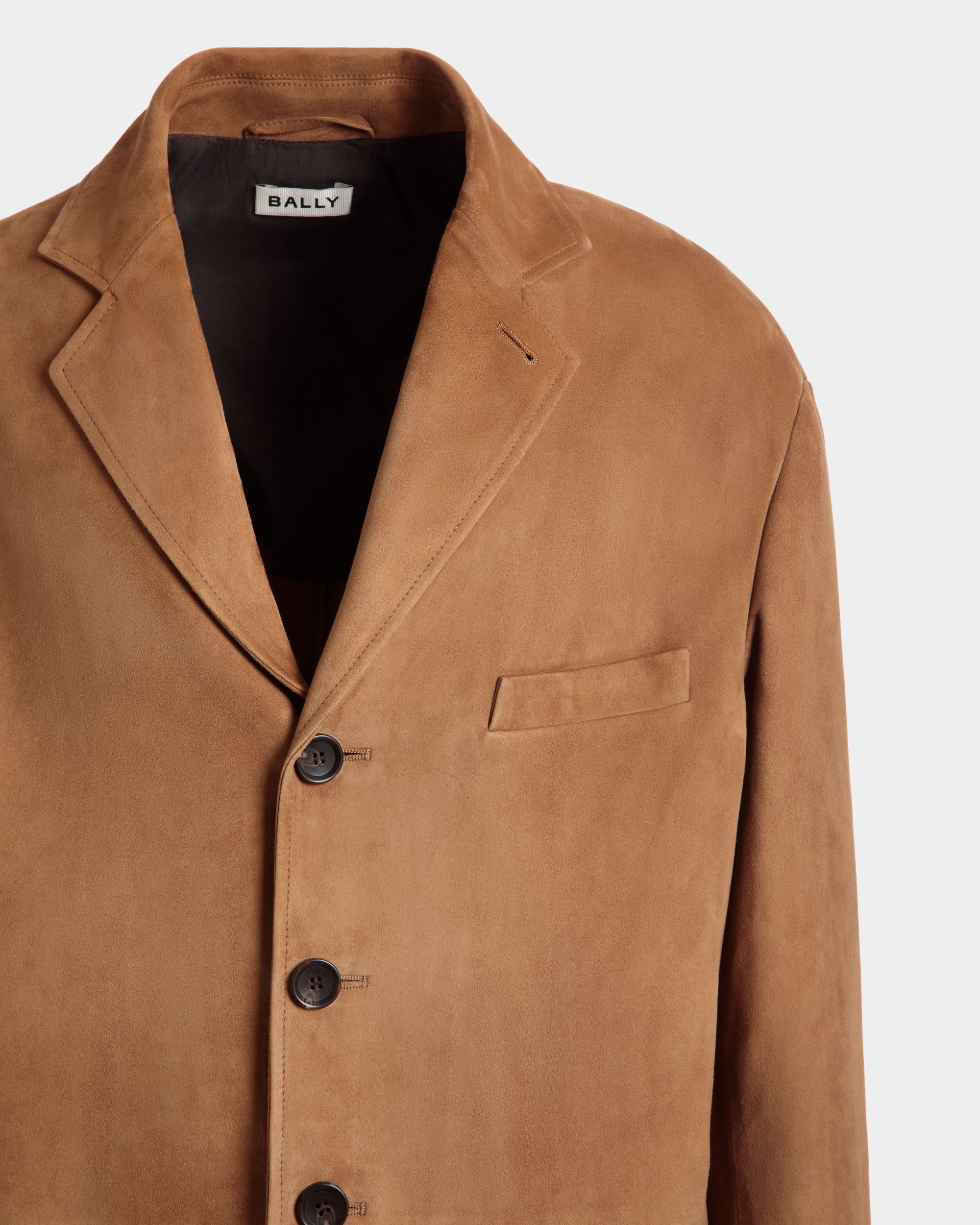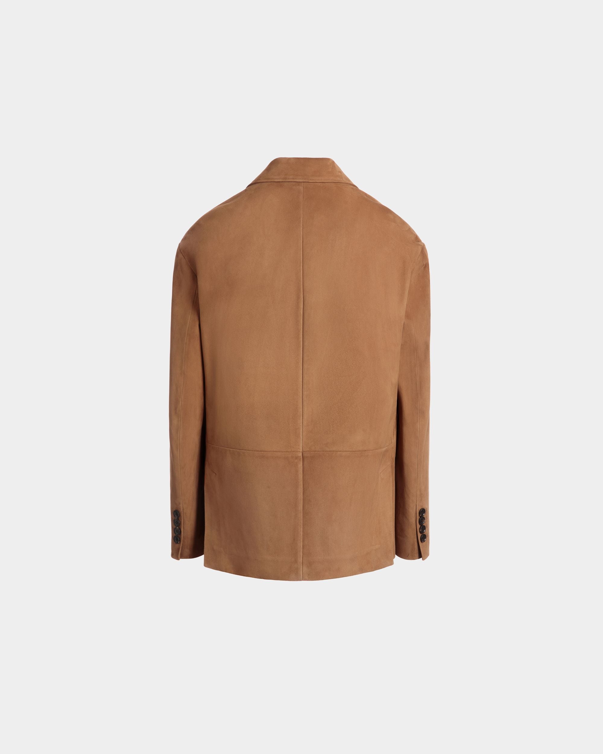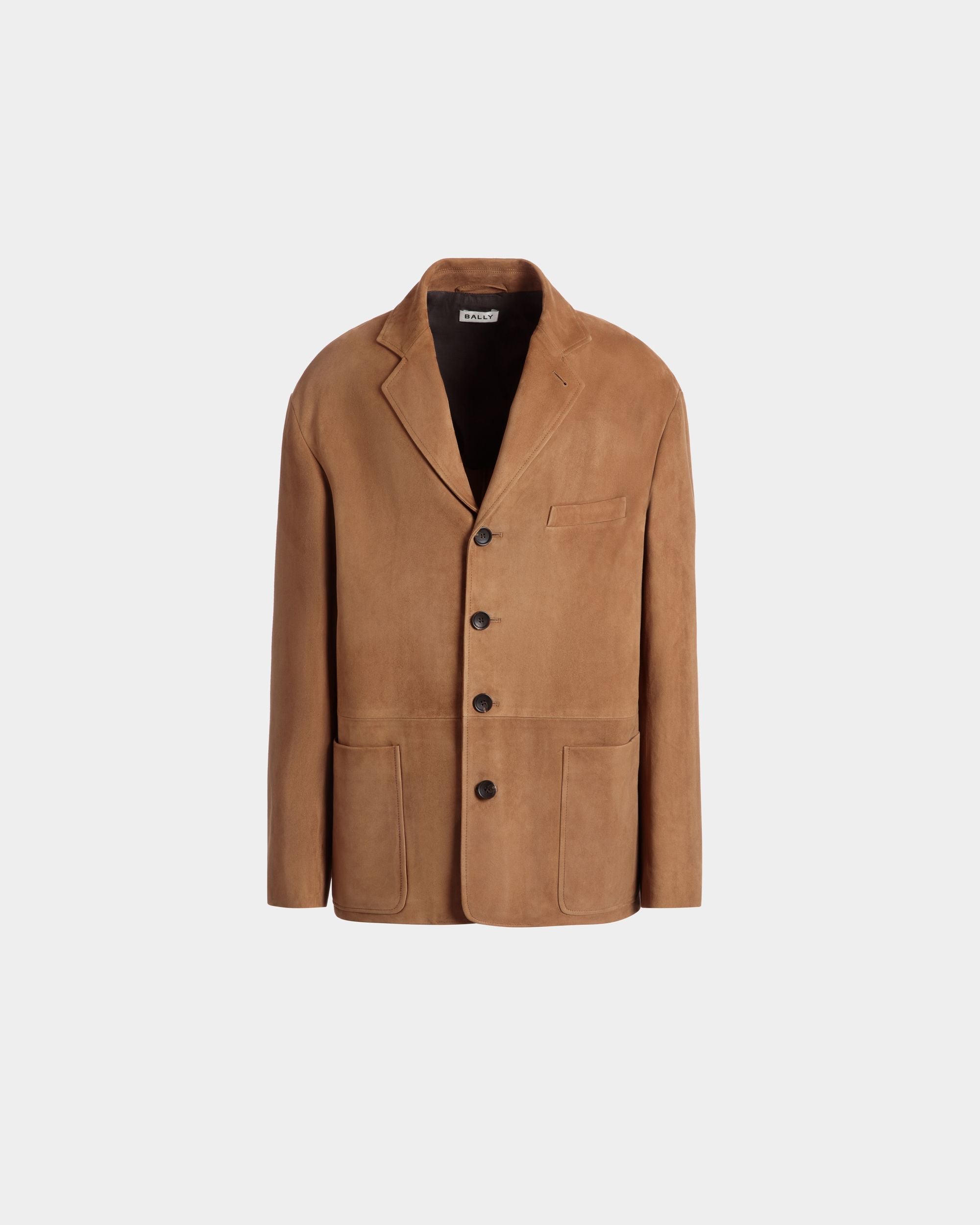 This brown suede blazer has a classic cut, notch lapel, two pouch pockets and four horn-effect buttons to the front.
