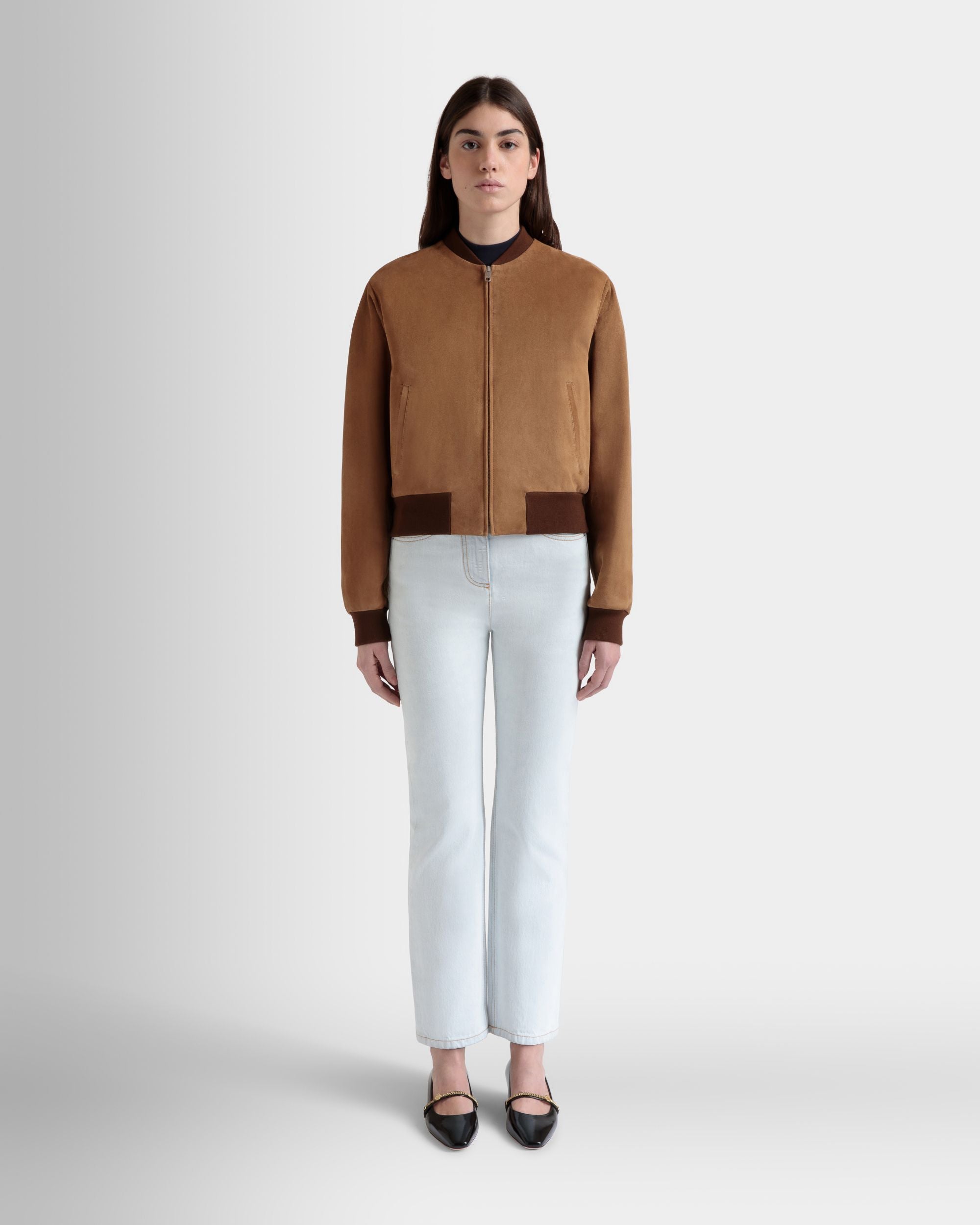 This bomber jacket is in supple lambskin suede with a velvety look and feel. Tone-on-tone rib-knit cotton finishes the cuffs, collar and hem.