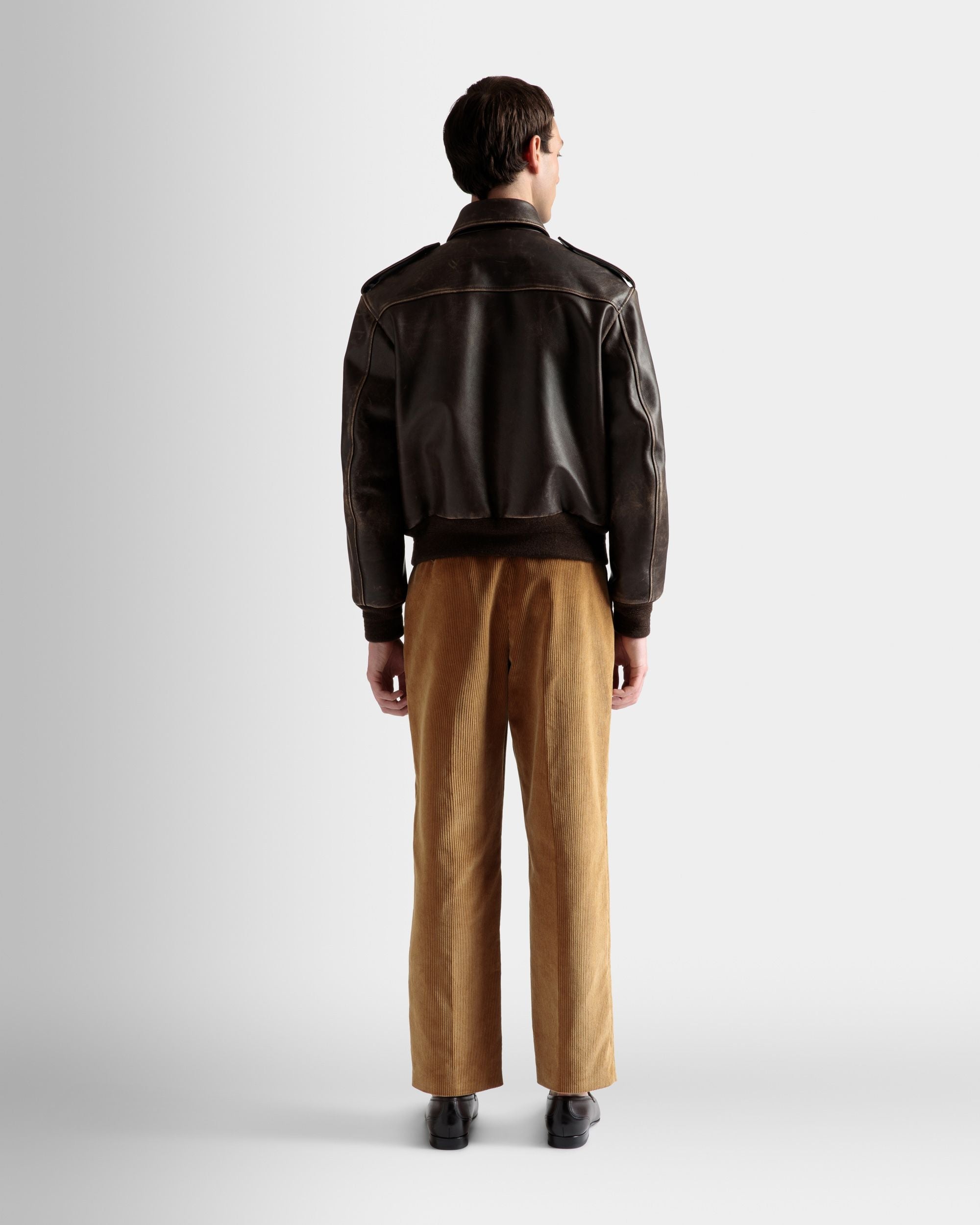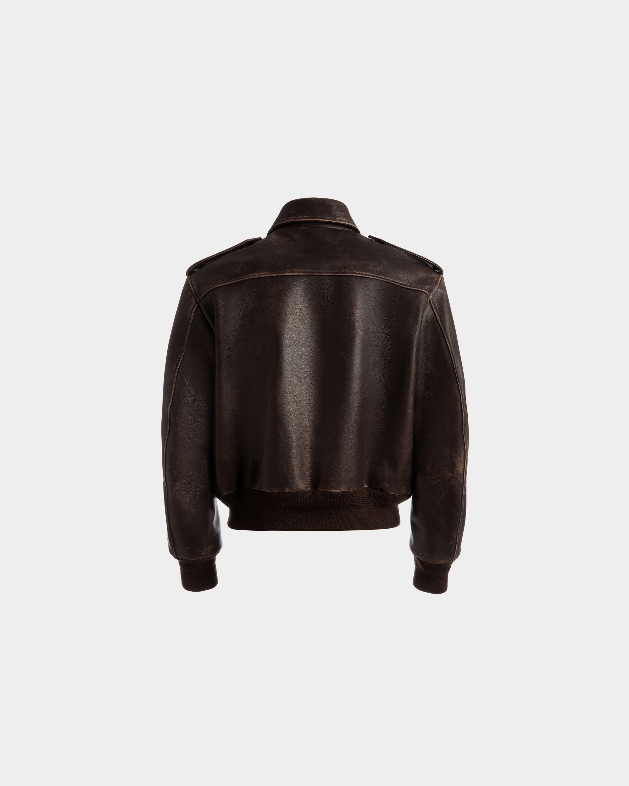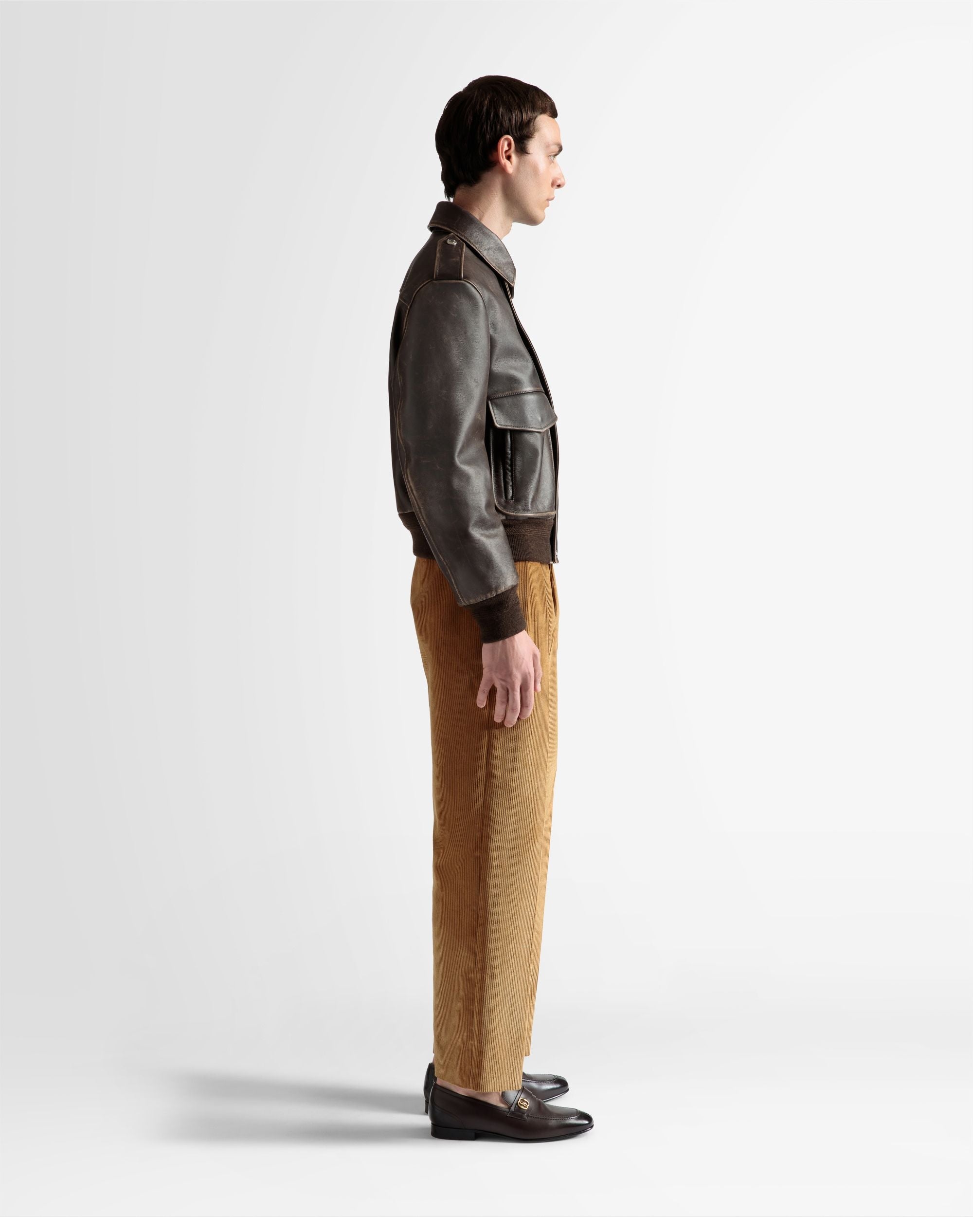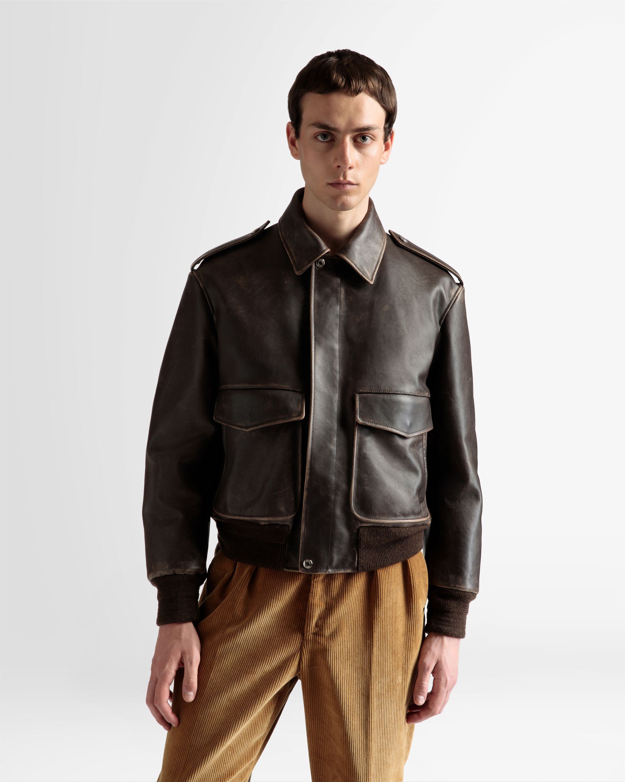 In a vintage-reminiscent brown leather, this bomber jacket style has been given large front pockets, a classic collar and epaulettes. There is ribbing at the cuffs and hem, and a concealed zipper placket with visible press studs at the top and bottom.