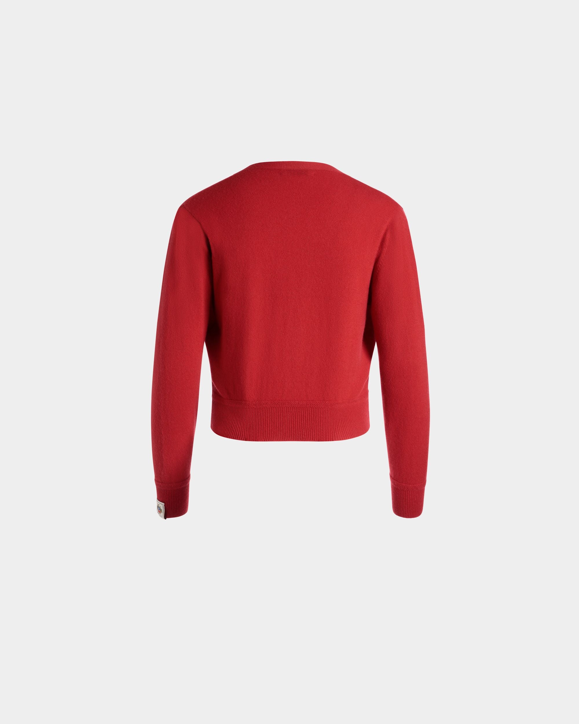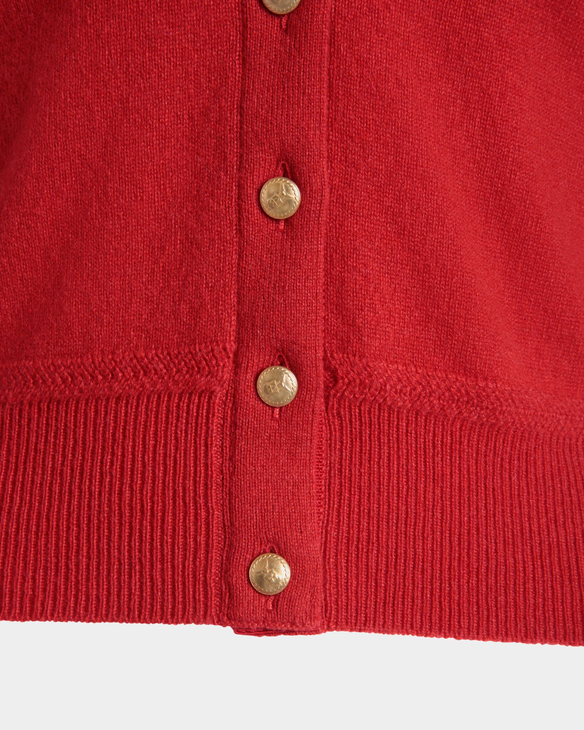 Gold-tone Emblem buttons decorate the front of this V-neck cardigan sweater in fine knit cashmere.