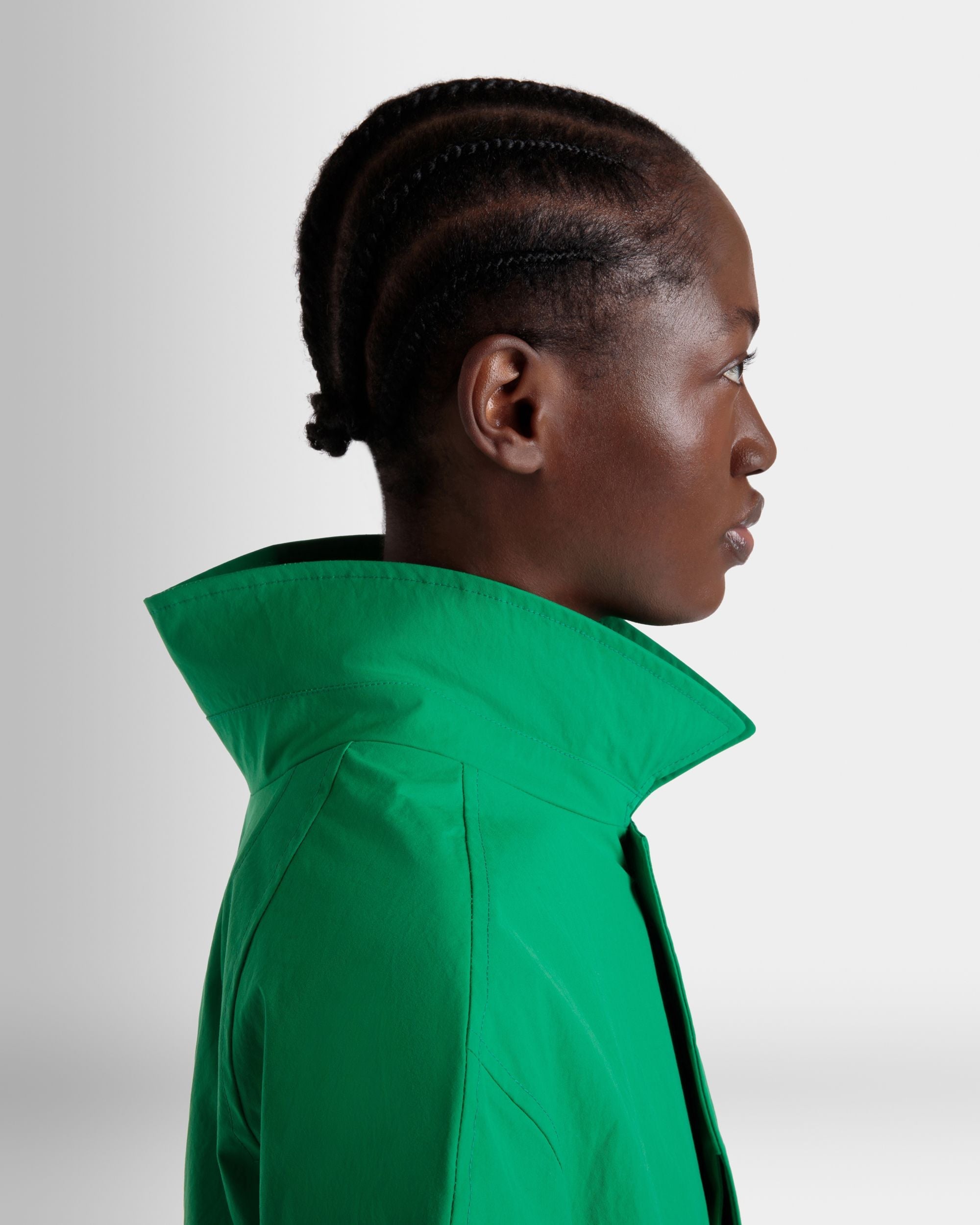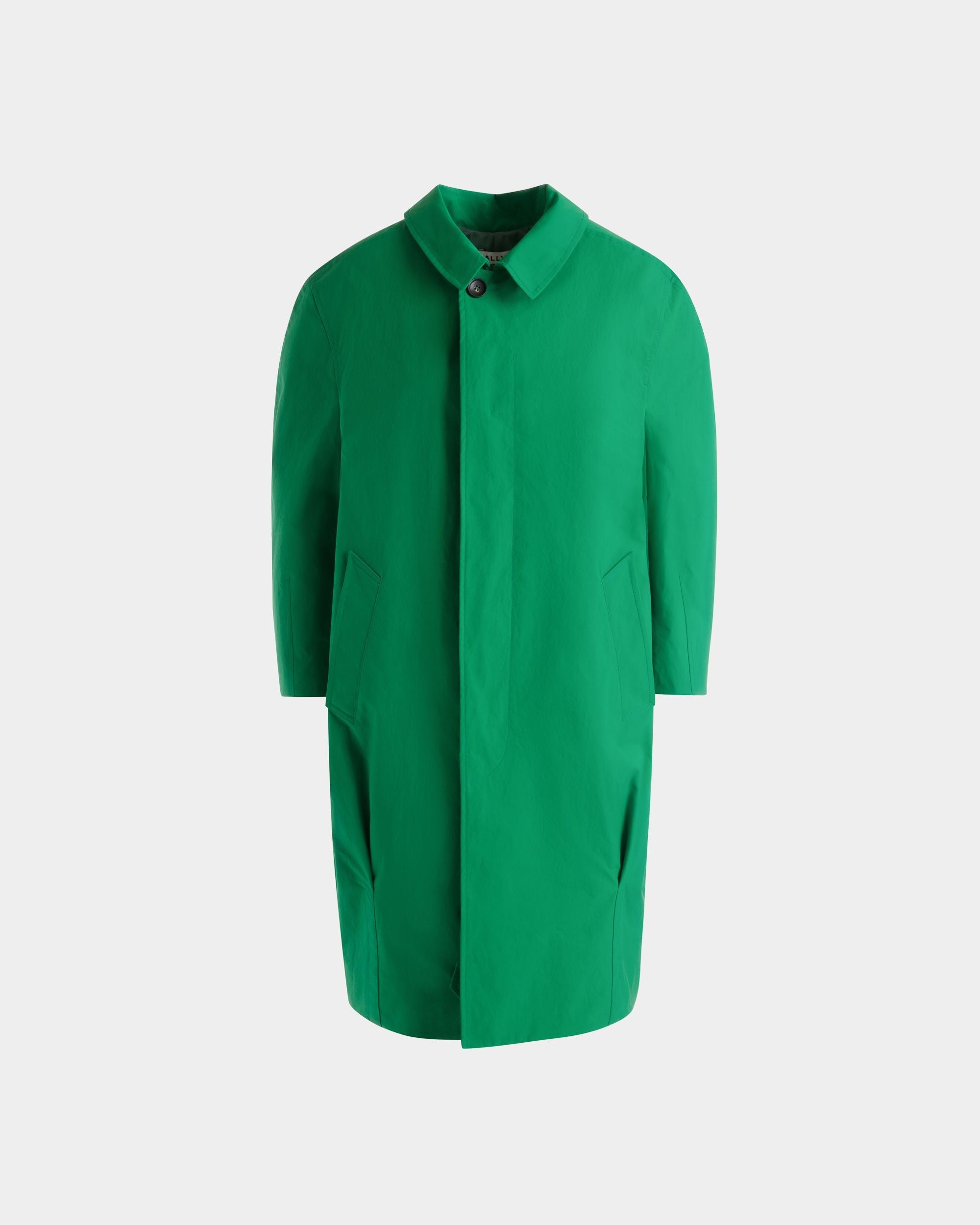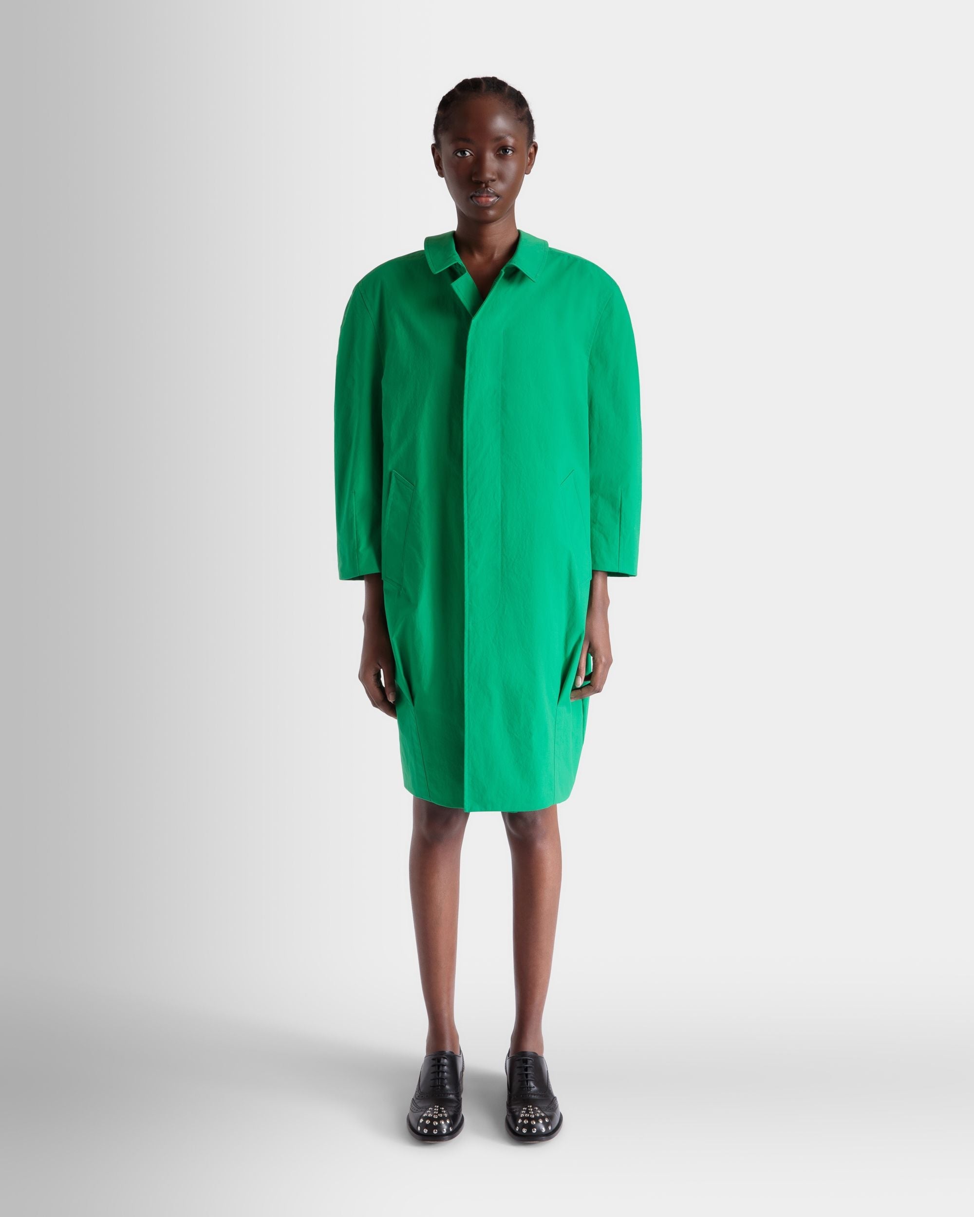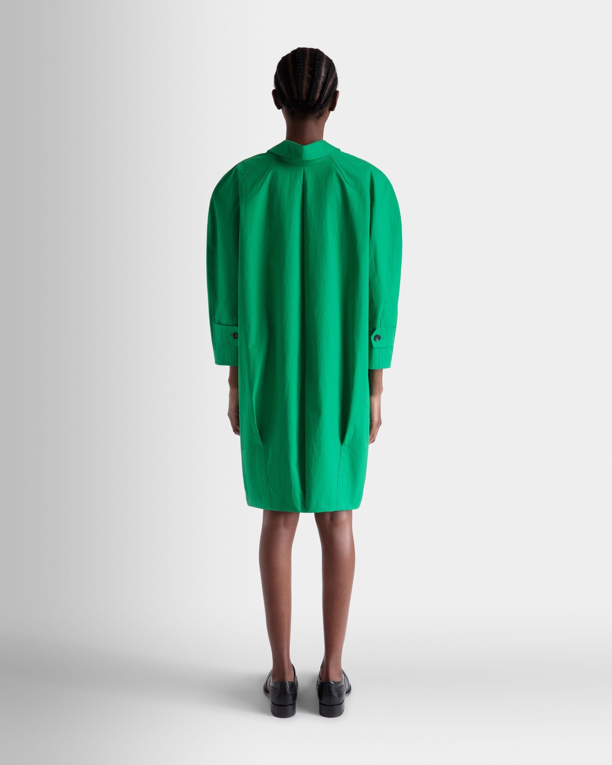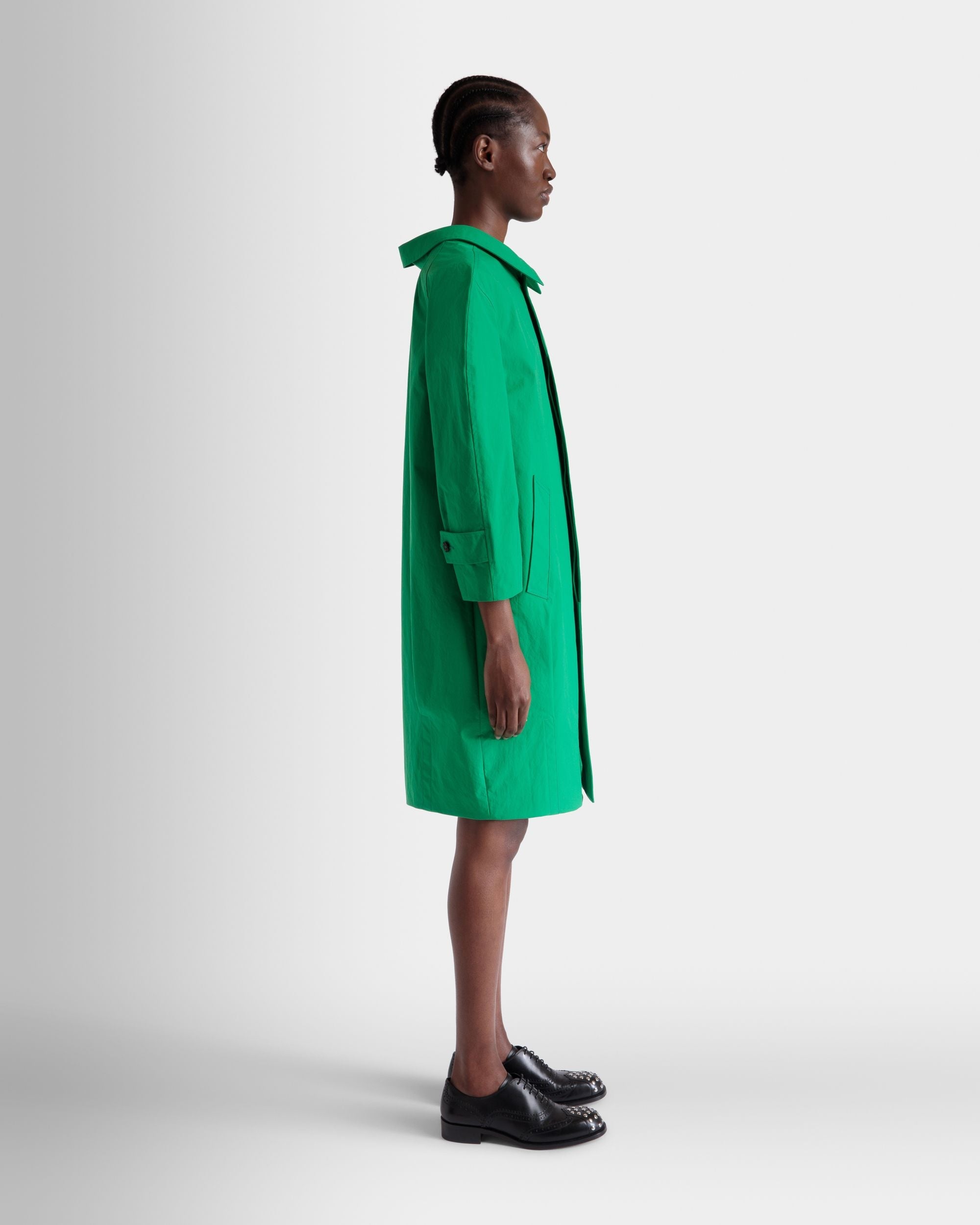 This emerald green coat is in micro-twill polyester fabric with a cotton-like hand feel. Pleats along the hemline create singular volumes and an ovoid silhouette.