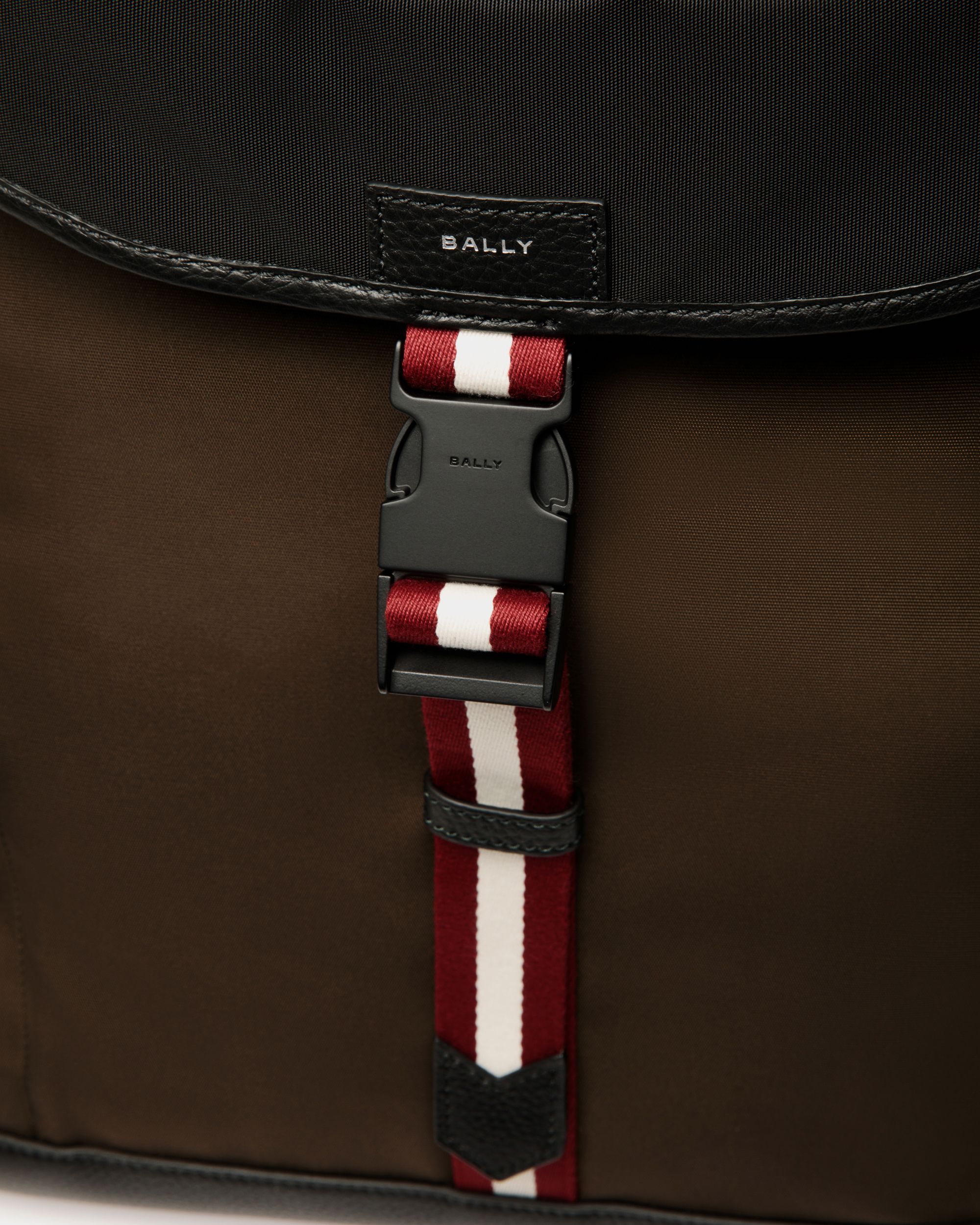 This Code backpack is constructed in durable military green and black nylon and finished in black leather. A red and white Ribbon does double duty as it embellishes the front and secures the flap closure.