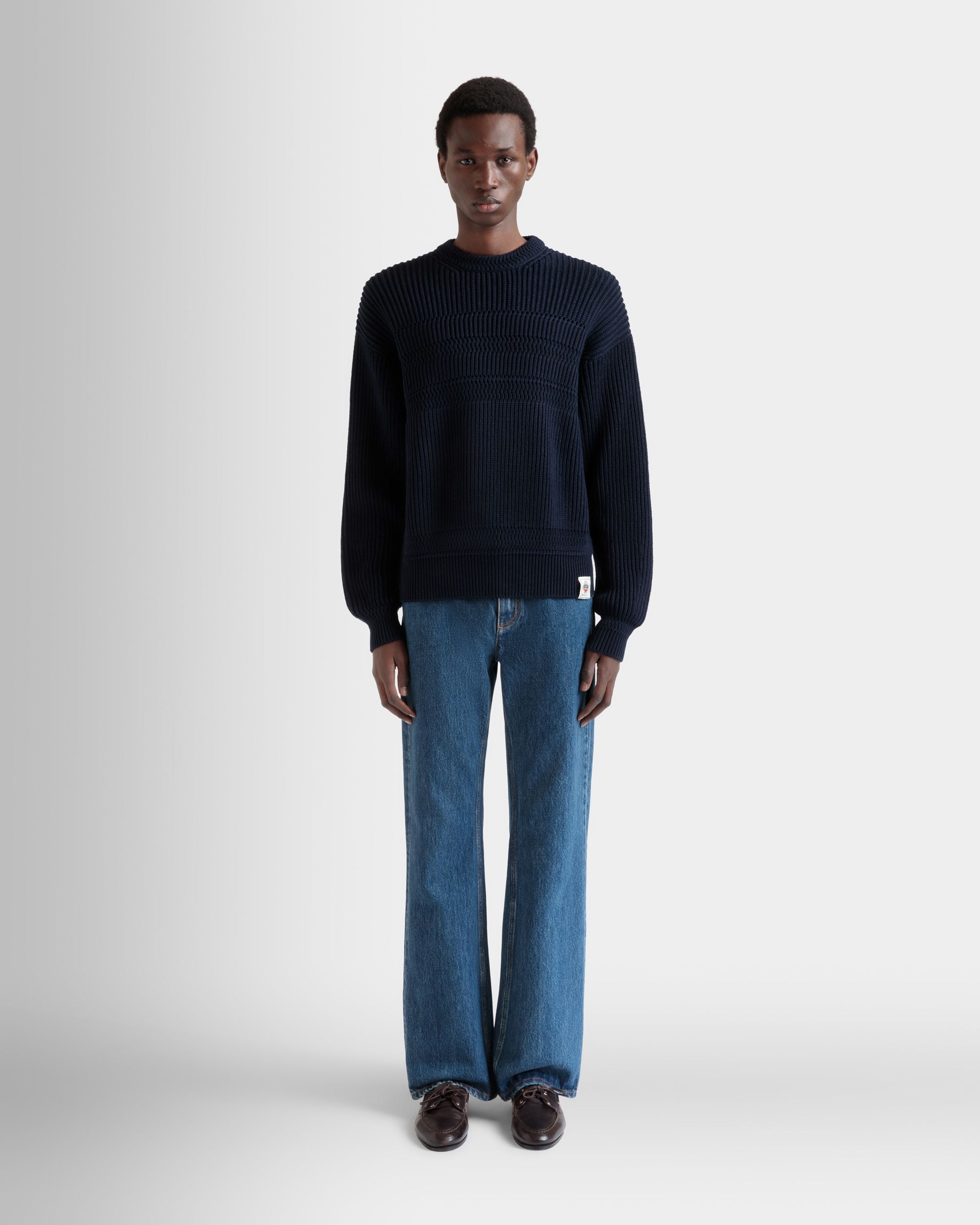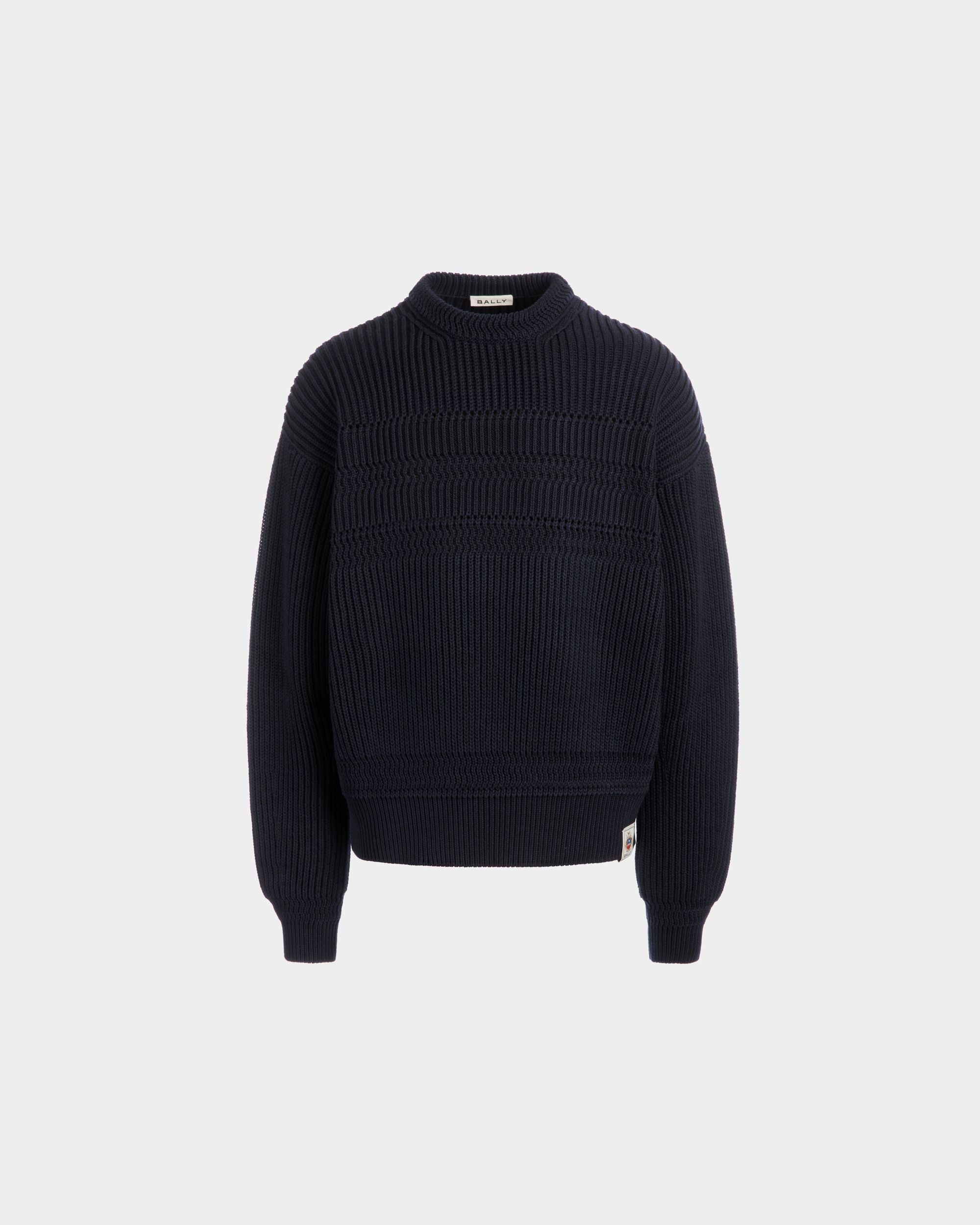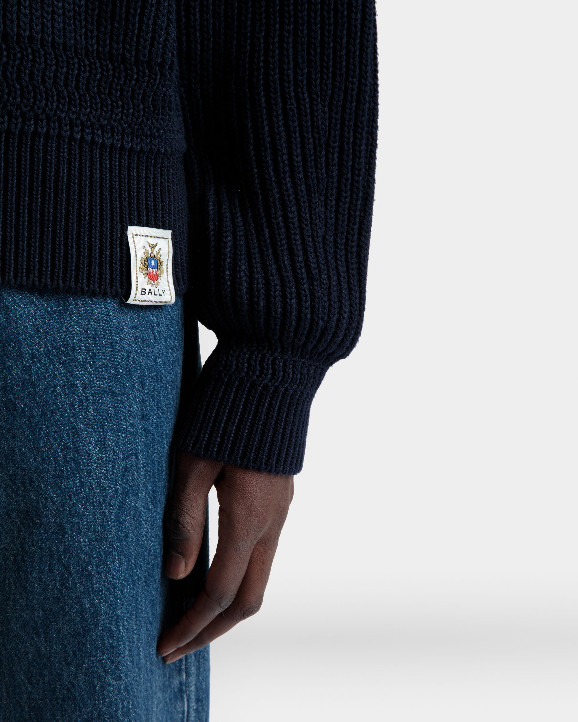 This navy blue crewneck sweater in fine cotton is knit into a fisherman's motif. A Bally Crest label finishes the hem.