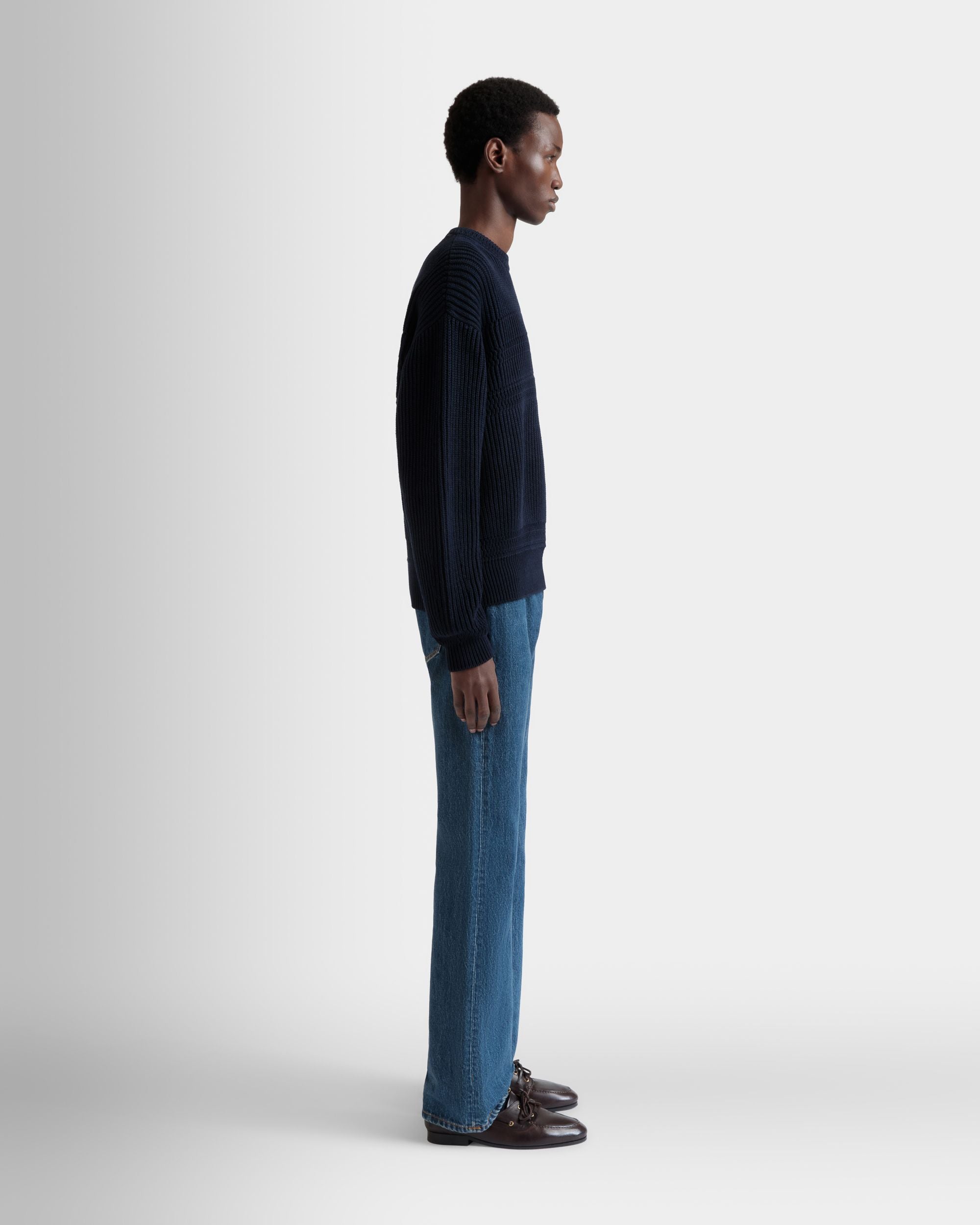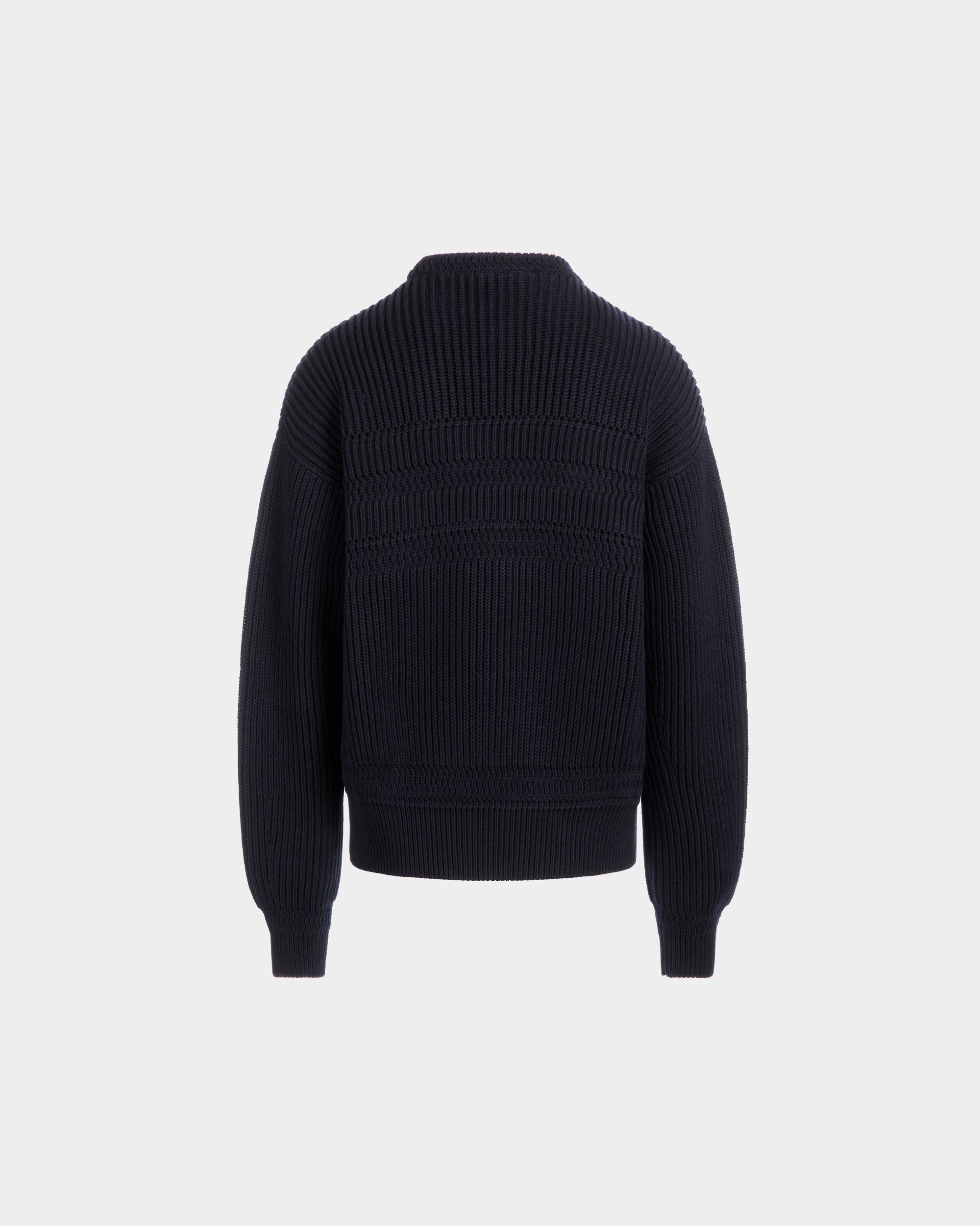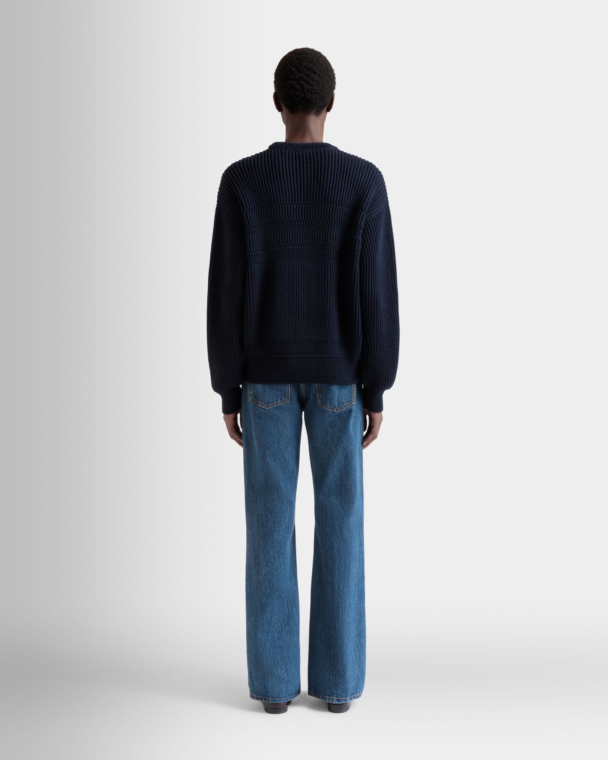 This navy blue crewneck sweater in fine cotton is knit into a fisherman's motif. A Bally Crest label finishes the hem.