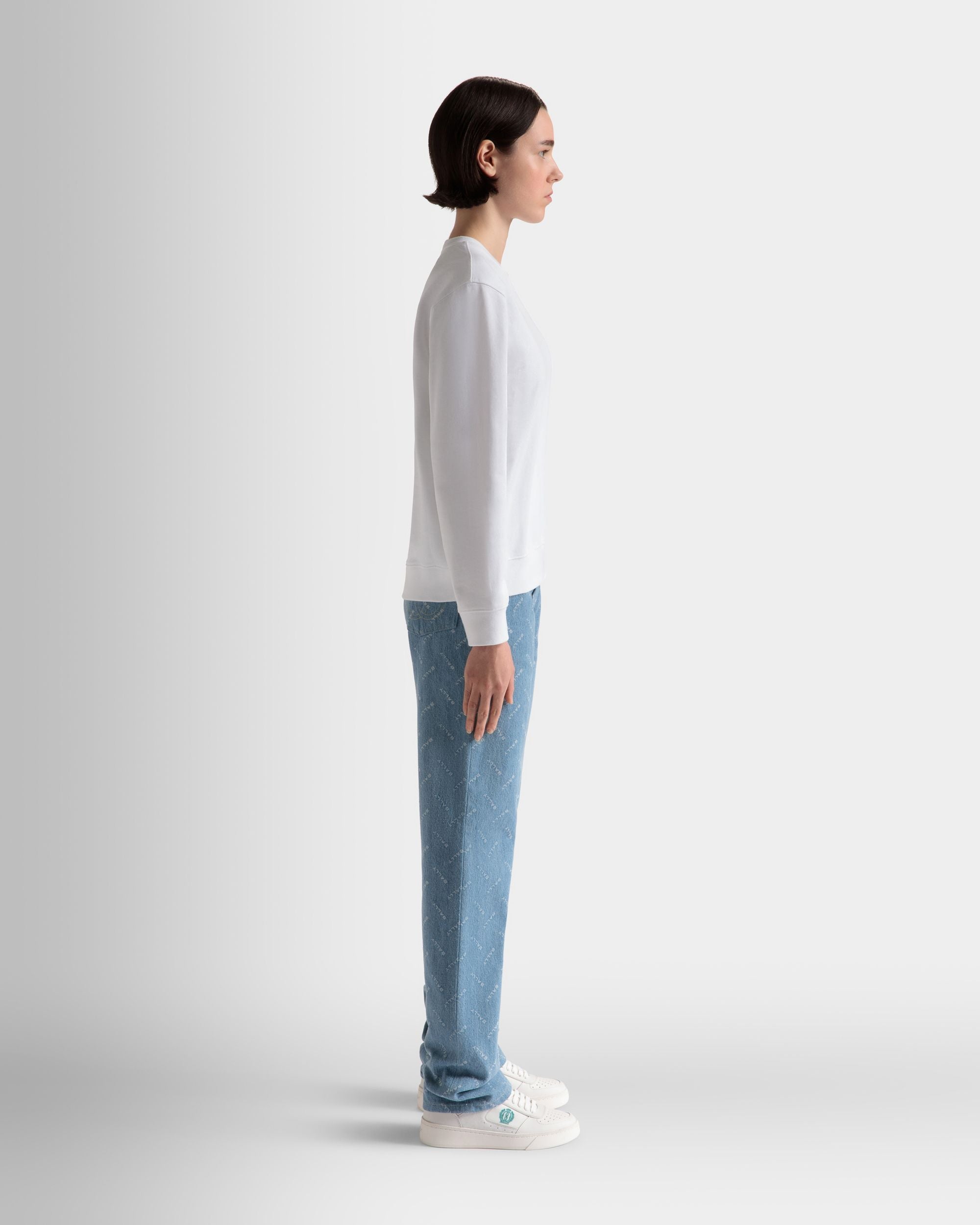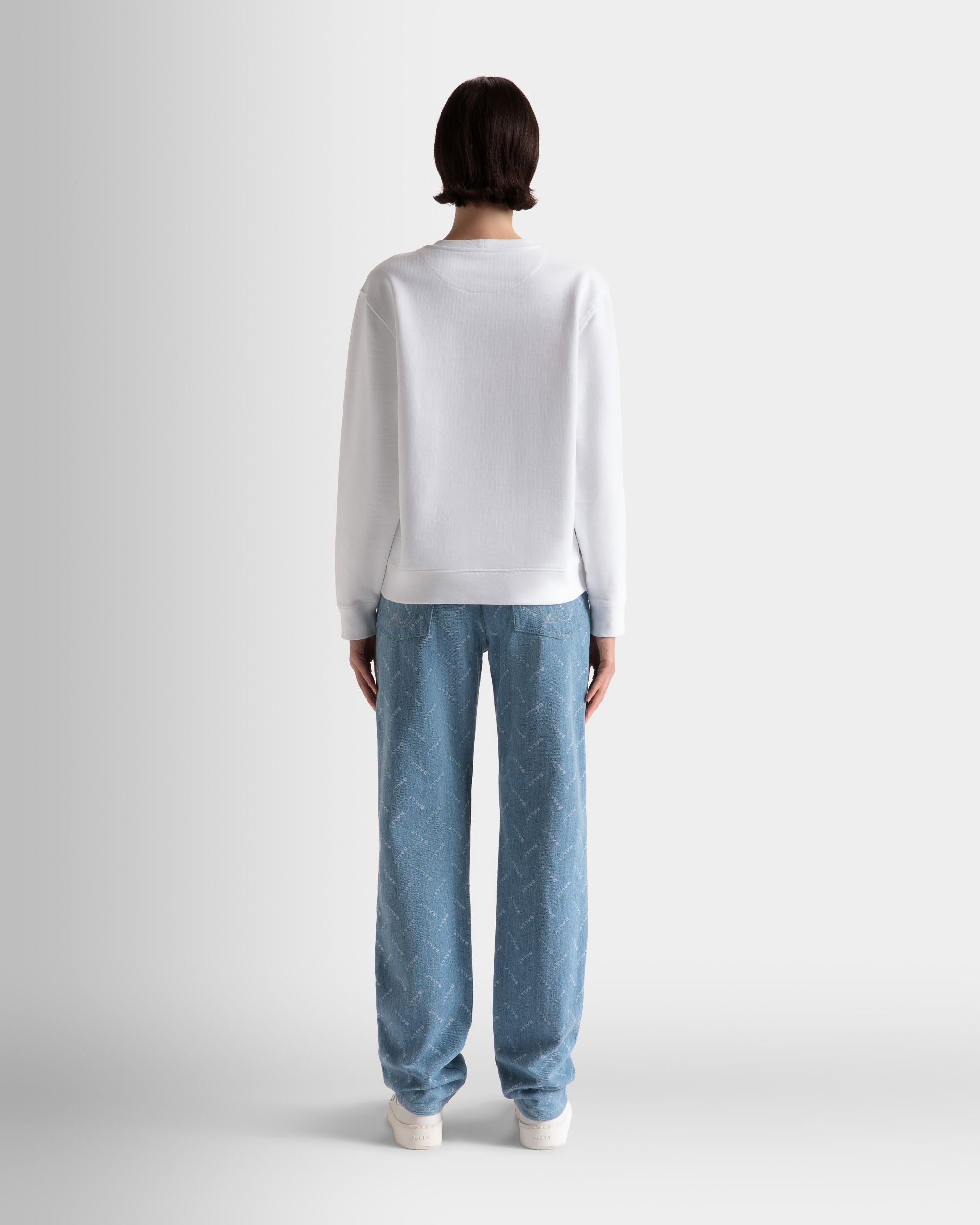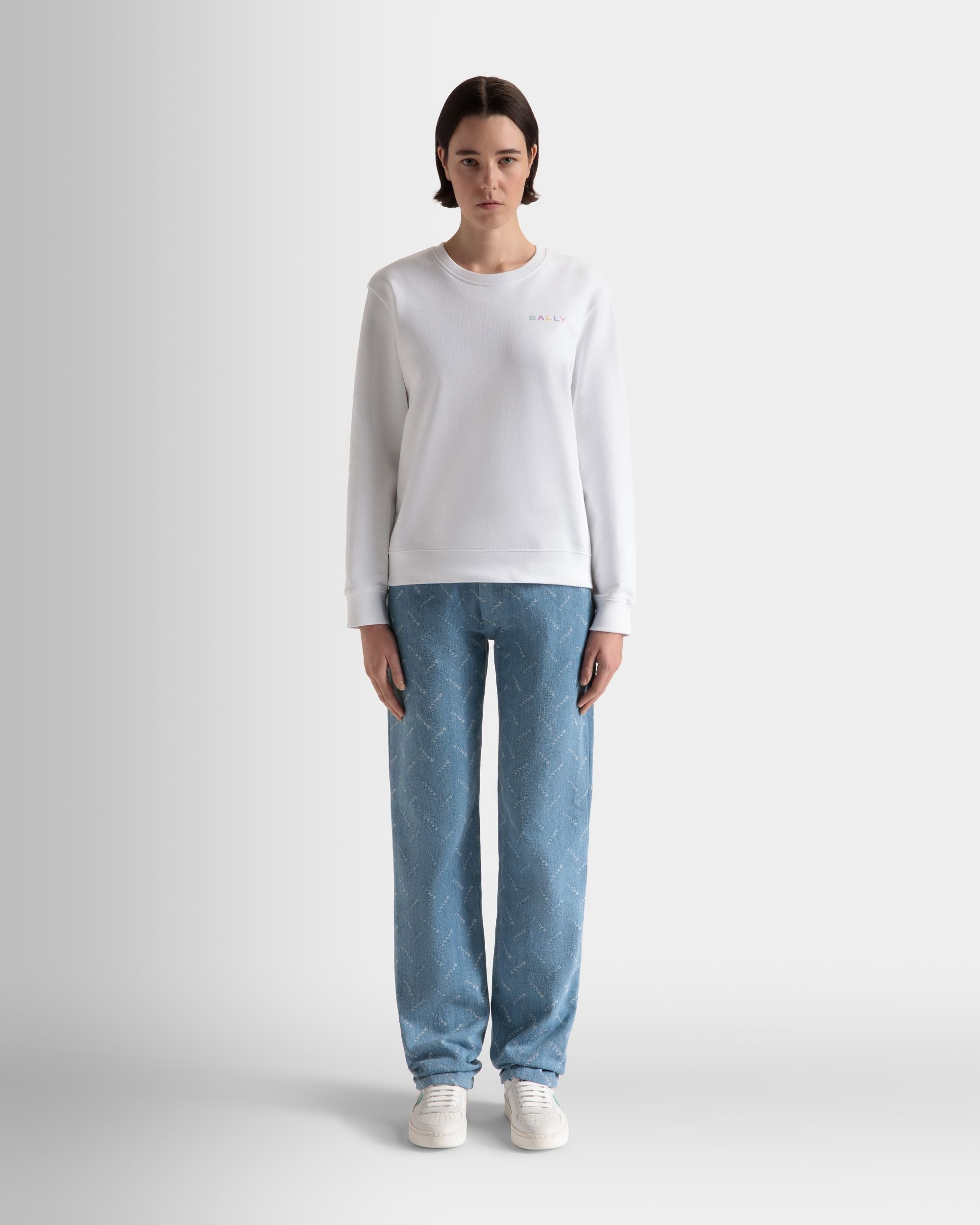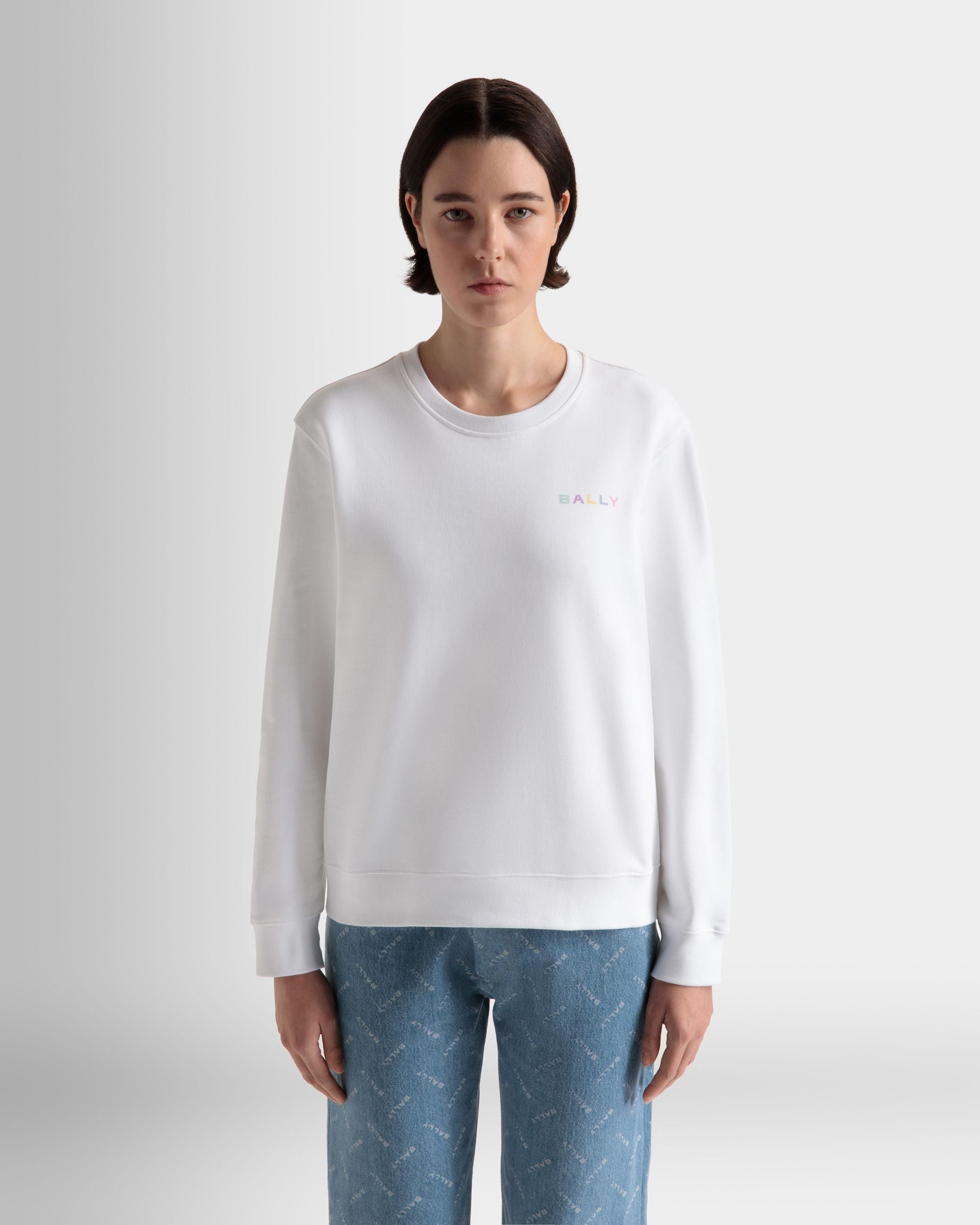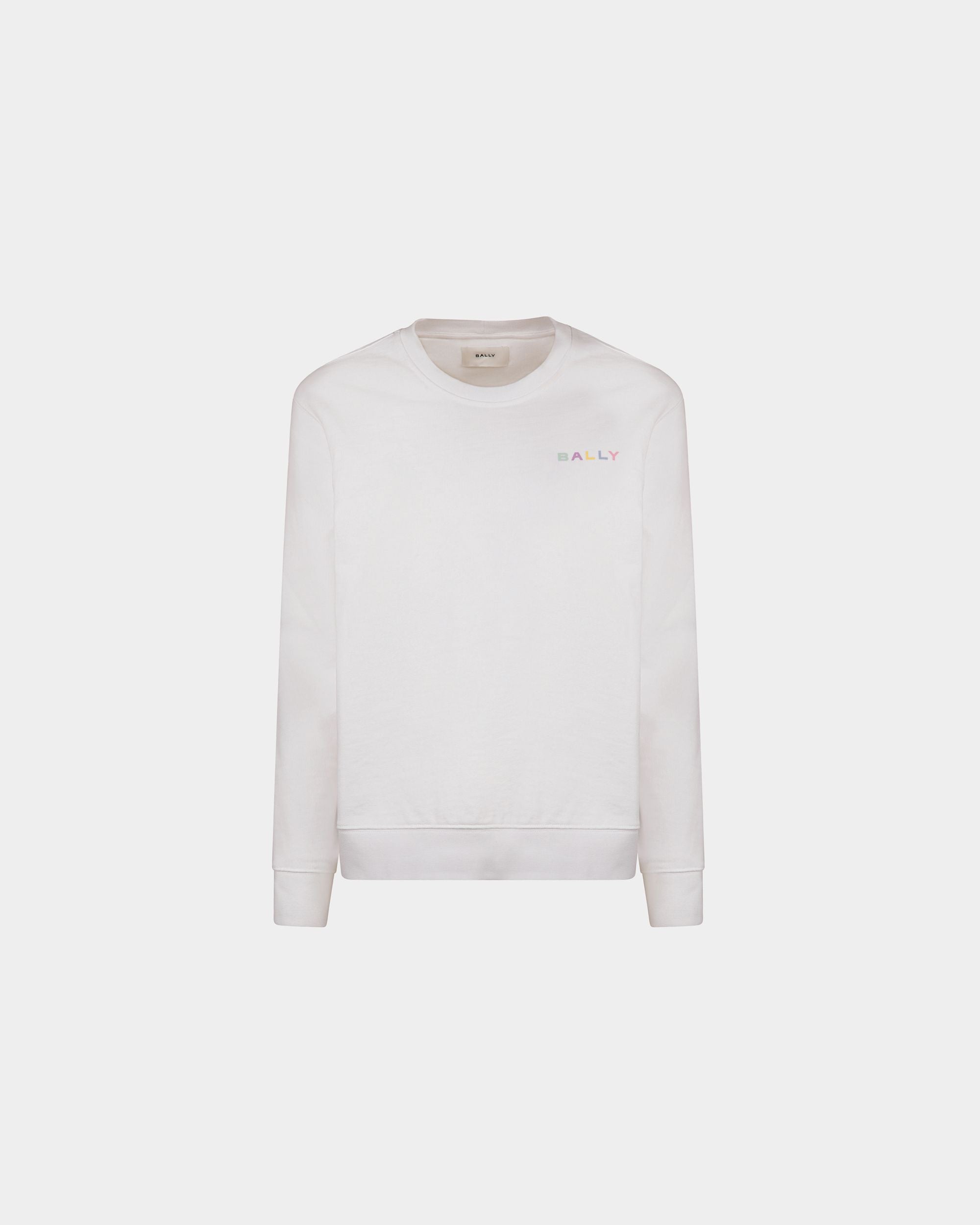This crewneck sweatshirt in white is a versatile wardrobe staple made from premium cotton fabric, offering a comfortable and breathable fit. Its classic, roomy cut makes it perfect for layering or wearing on its own. On the left chest, the Bally embroidery in pastel hues adds a joyful final touch.