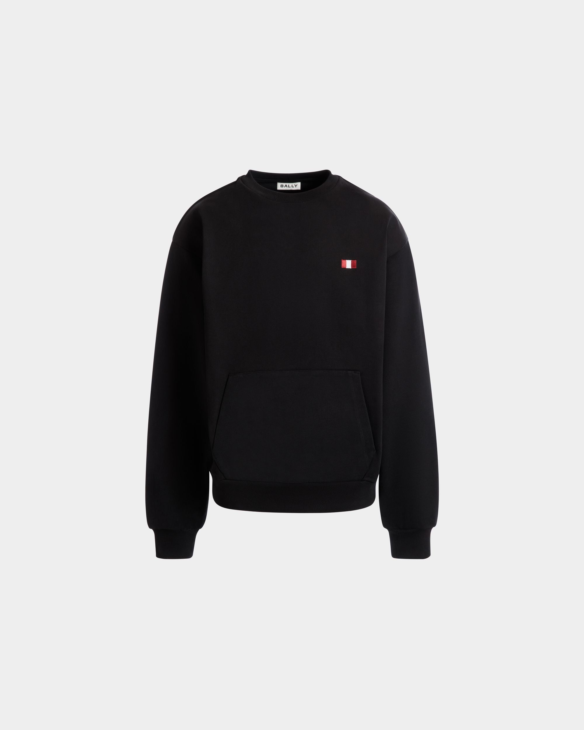This long-sleeve crewneck sweatshirt is in finely knit black cotton. An embroidered Bally Flag and a large pouch pocket finish the front.
