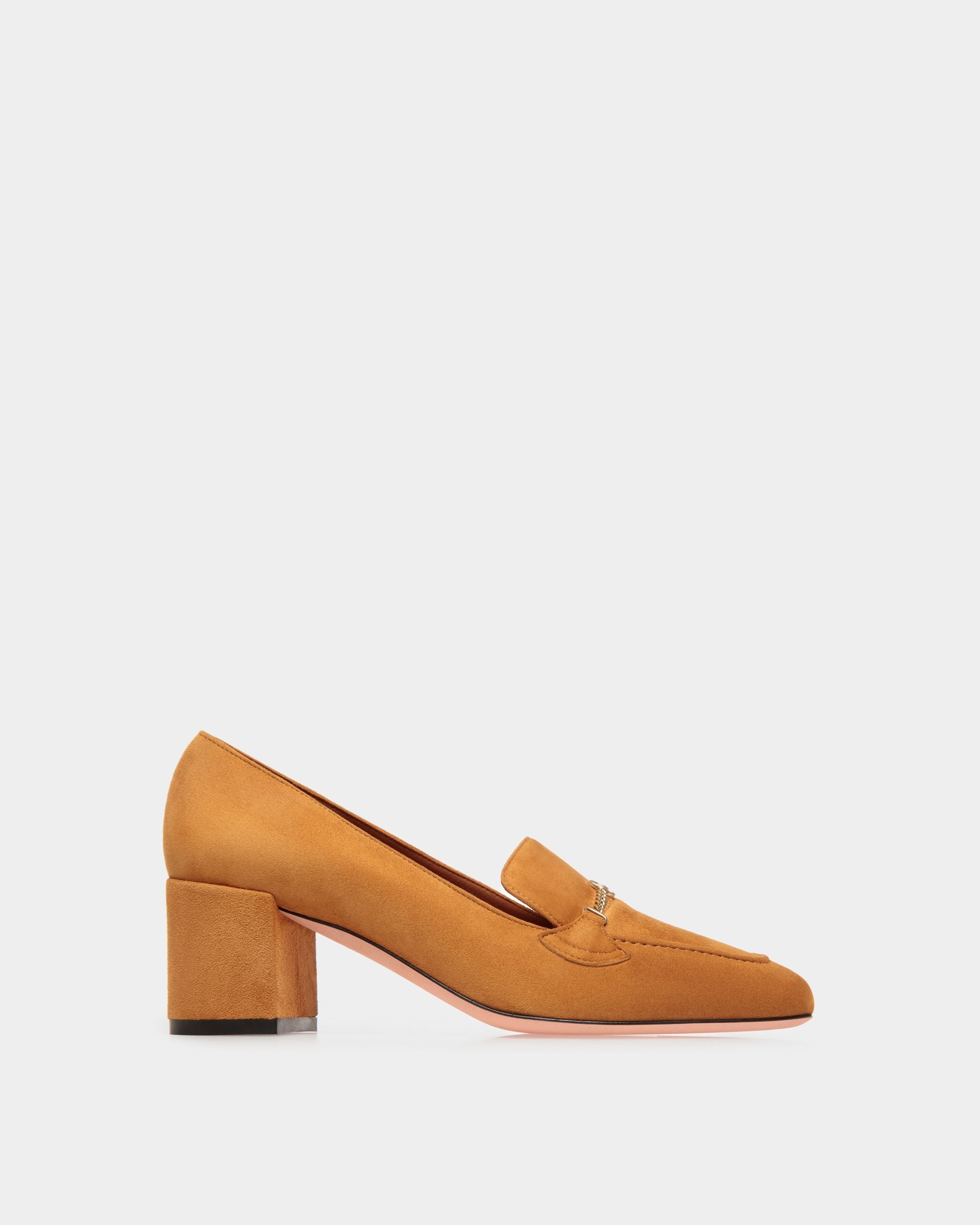 Here in Desert, this suede pump is a sophisticated choice that sets a loafer atop a 50 mm block heel. Featuring a sleek silhouette and impeccable Italian craftsmanship, it offers both style and comfort in and out of the office. A small Emblem chain runs across the top for sophisticated detailing.