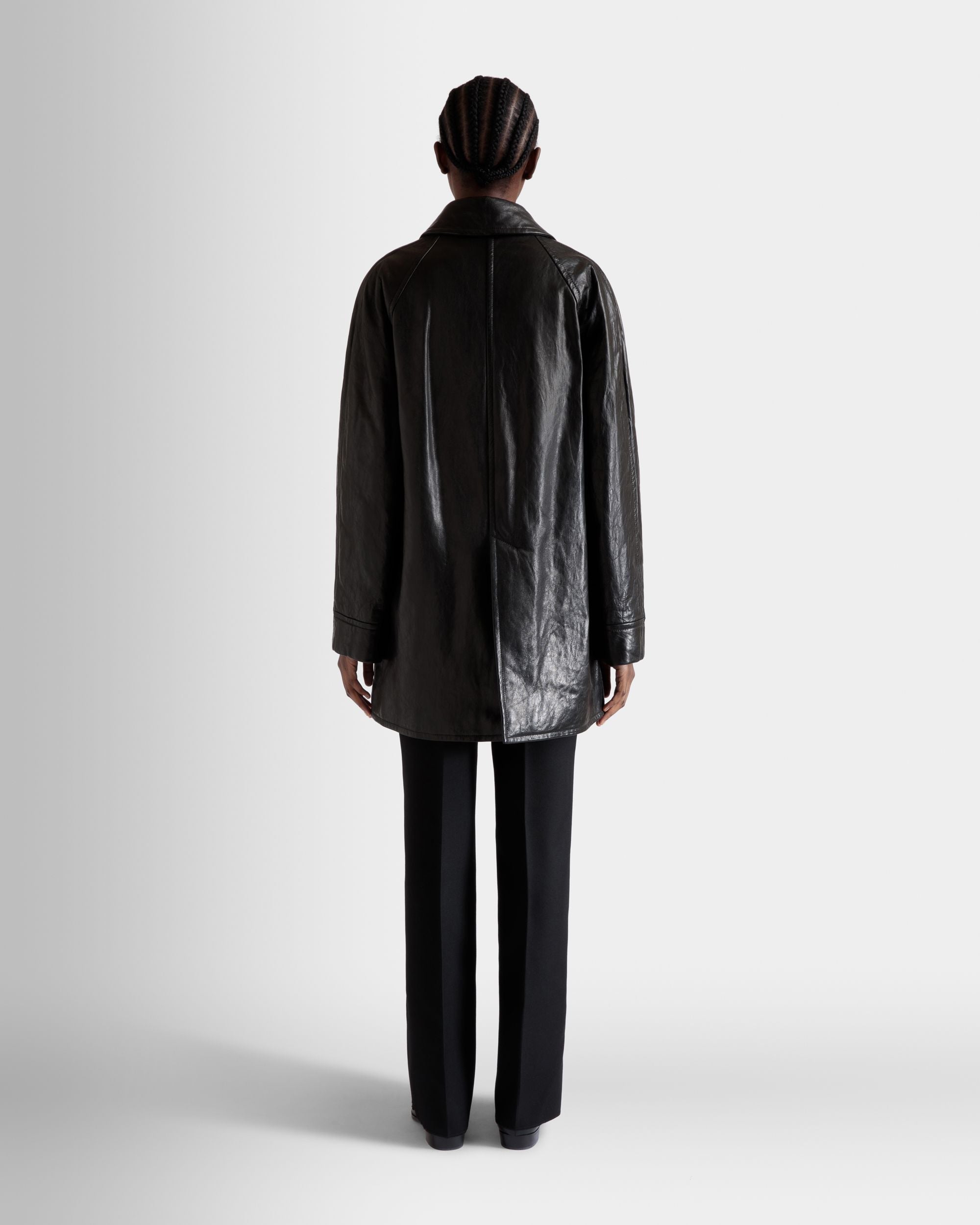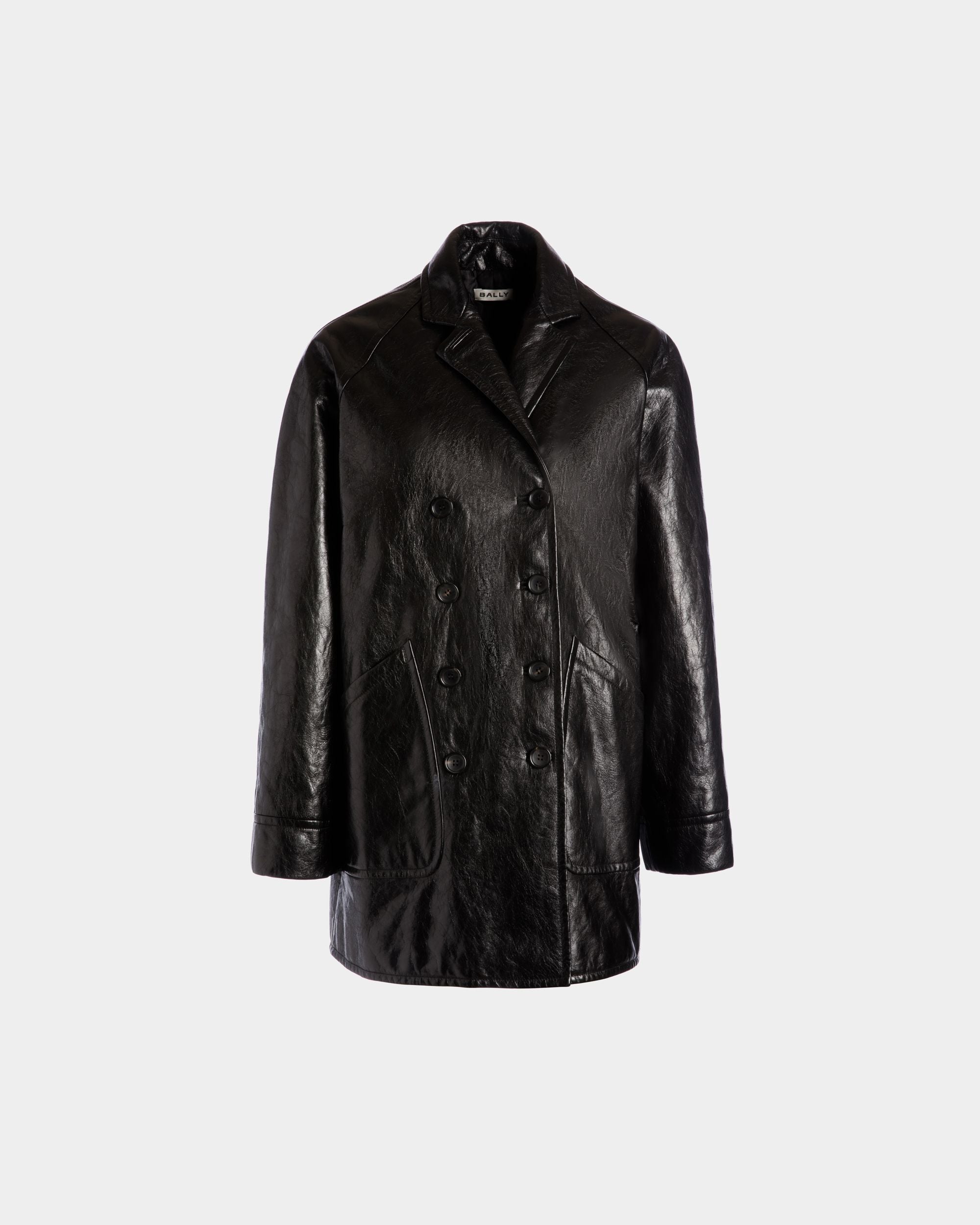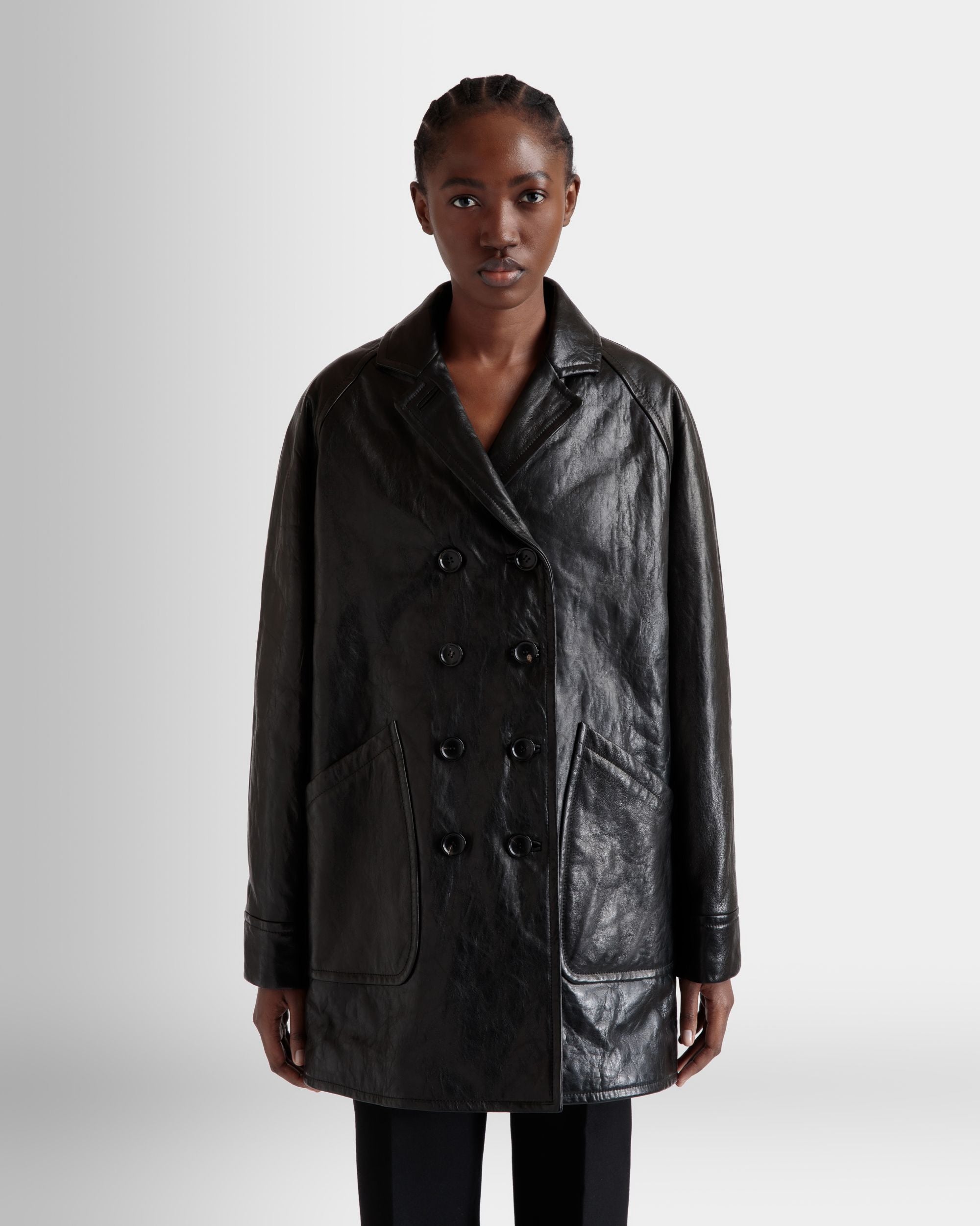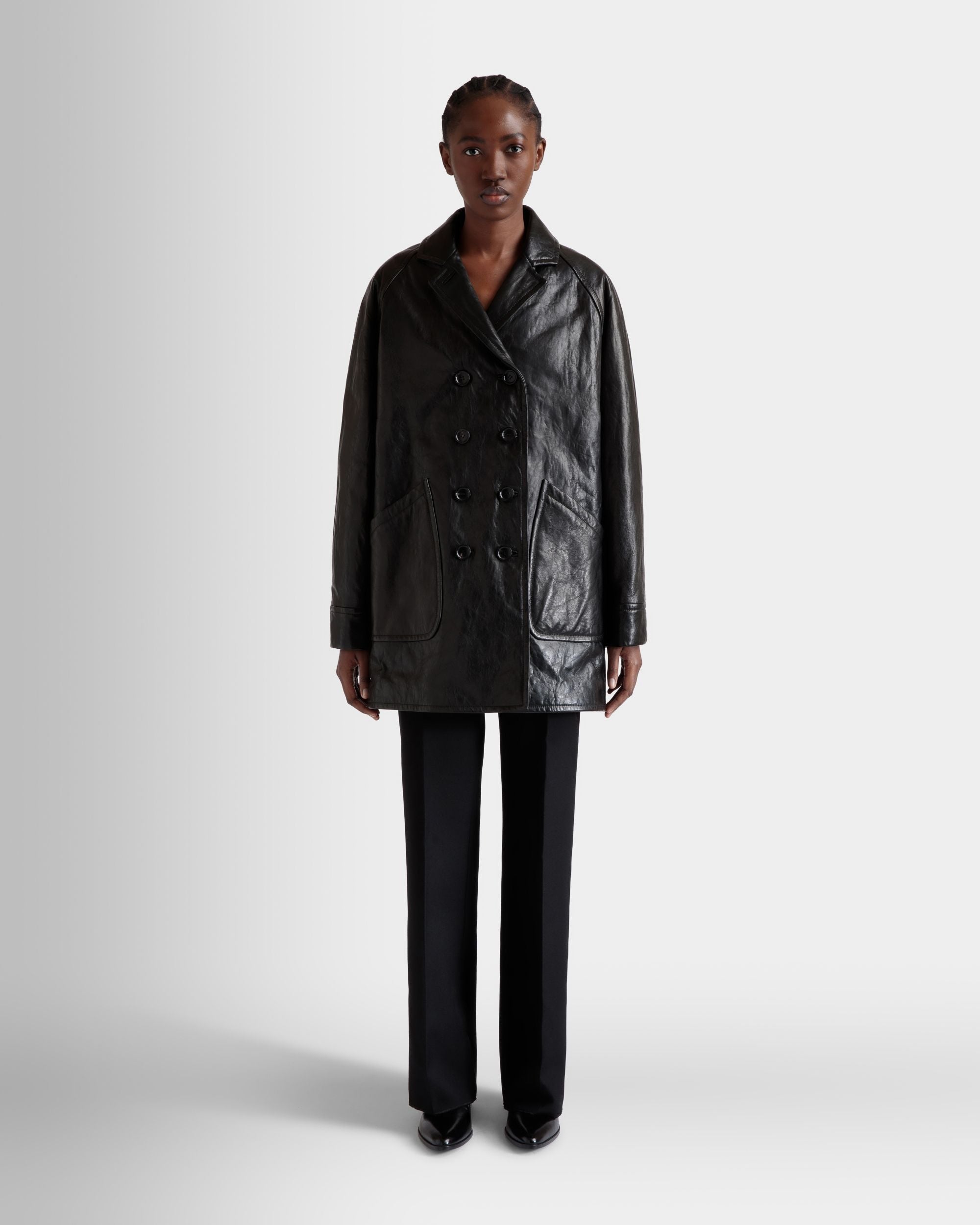 This midi coat is crafted from premium lambskin with an elegant craquelure finish. Eight horn buttons fasten the double-breasted front.