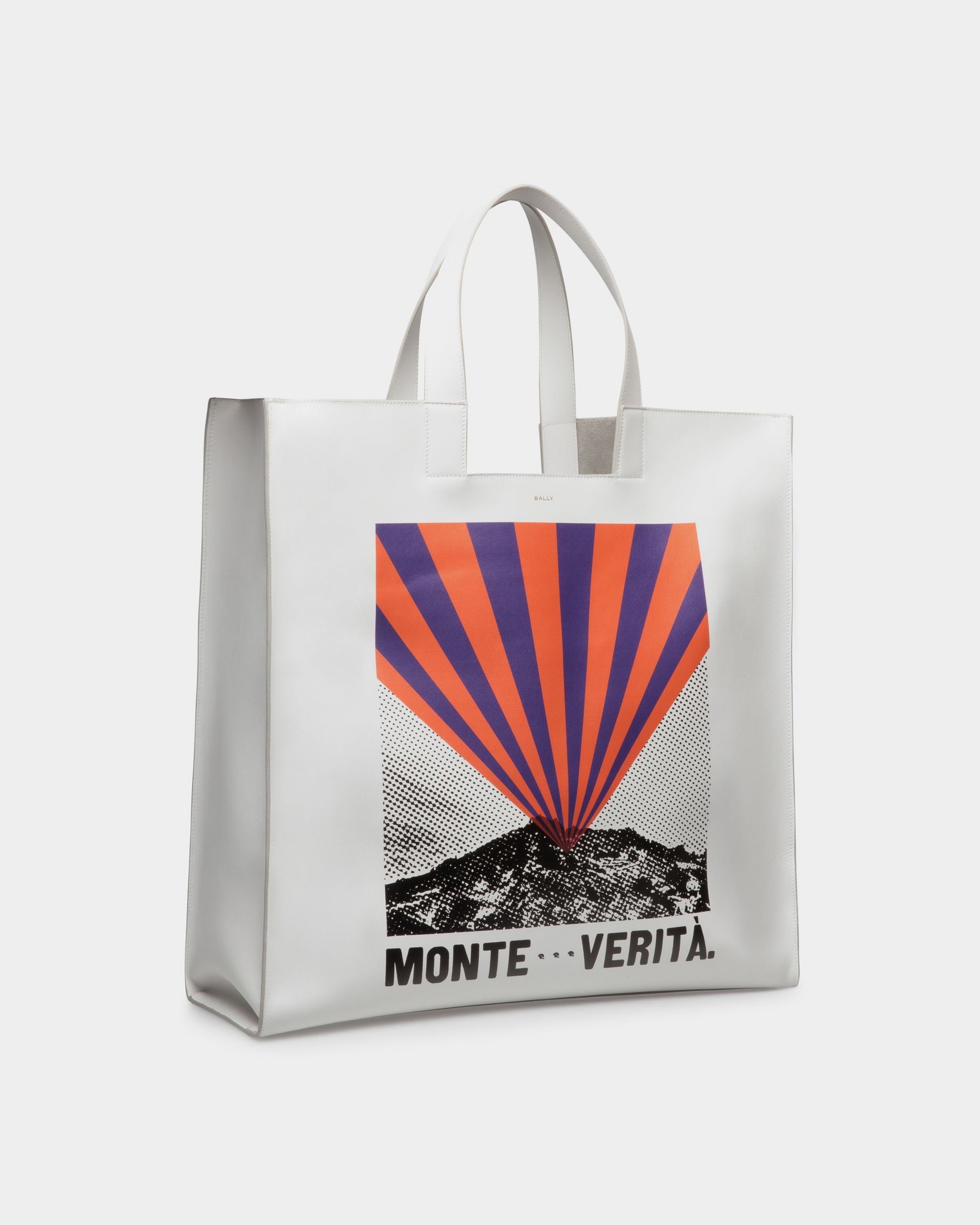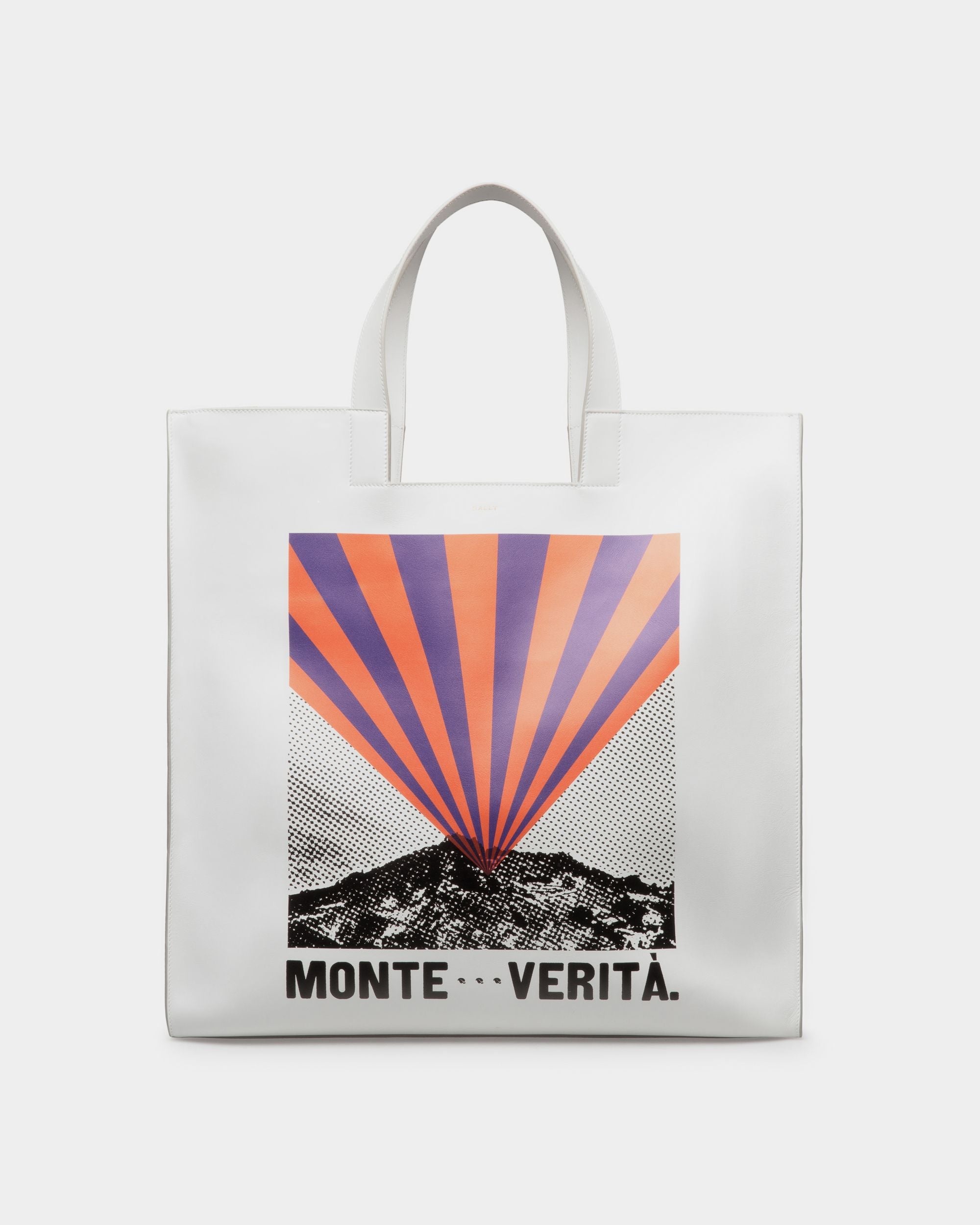 Easy Bally tote with a print showcasing the creative inspiration behind the collection: Monte Verità. The essential silhouette provides sober balance, exquisitely crafted.